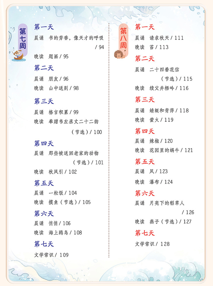 以周为分割,每周前六天都进行各种不同题材的阅读,第七天则设置“文学常识”板块,轻松积累常考考点。