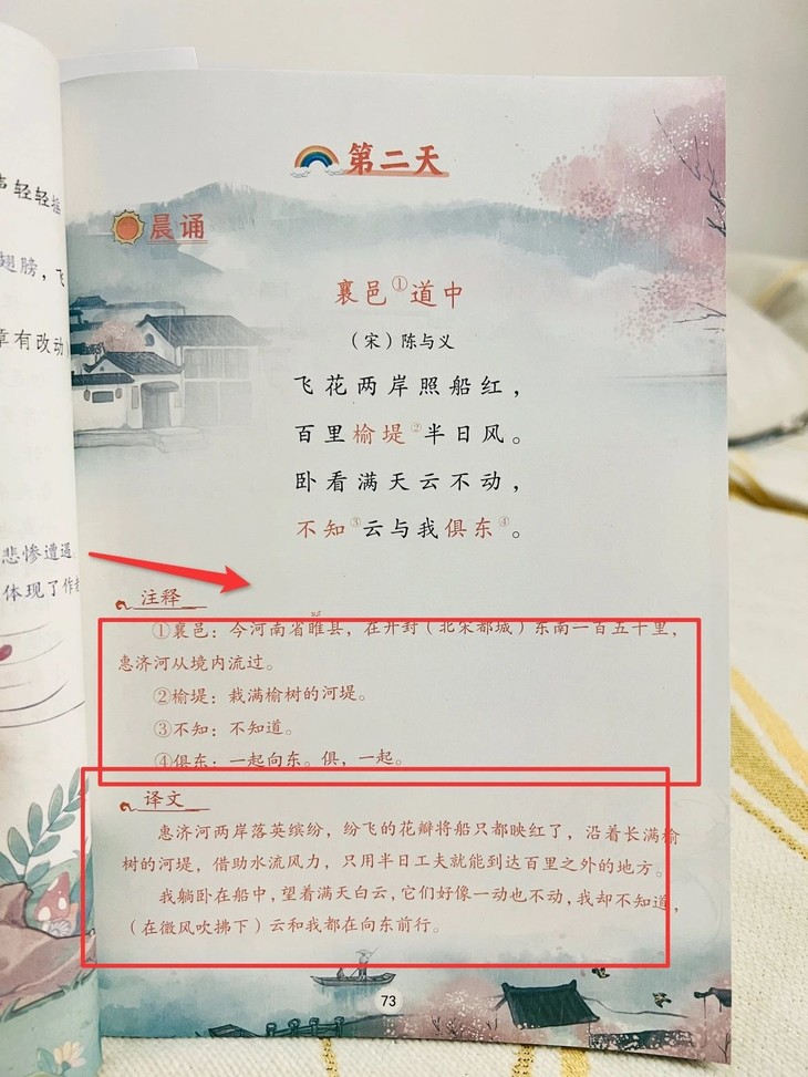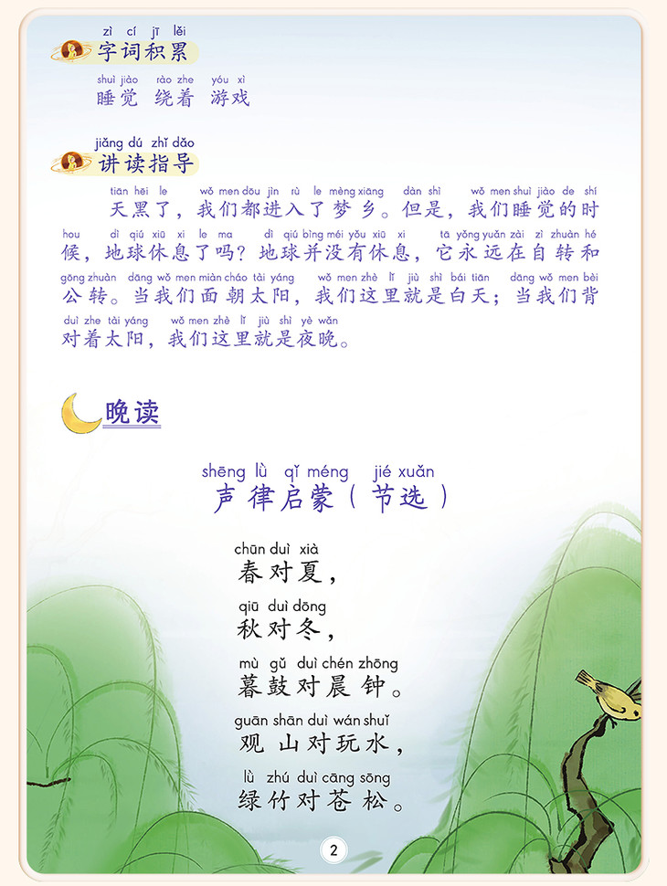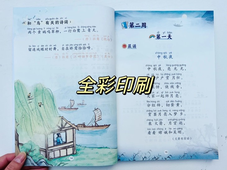 ✅1-2年级的内容较简单,全书注音,主要选择的是朗朗上口的古诗词、儿歌、童谣等,文章篇幅较短;
