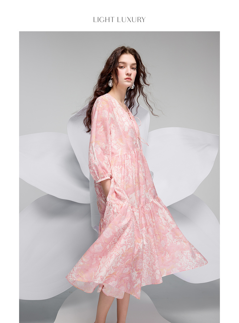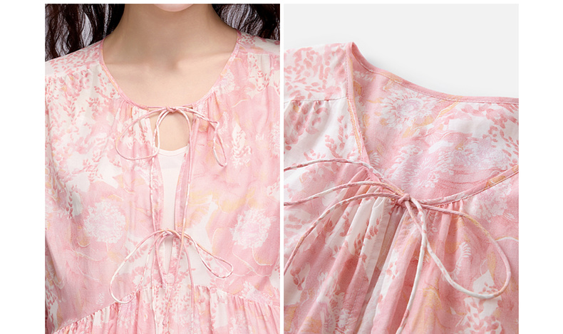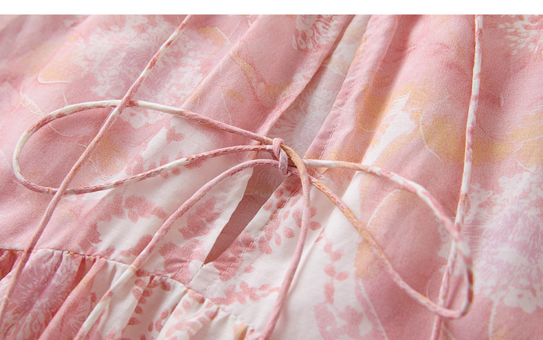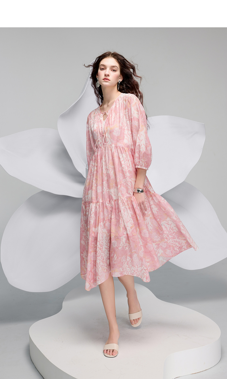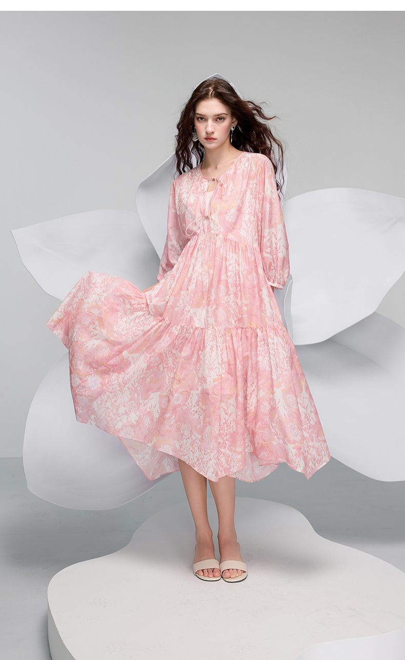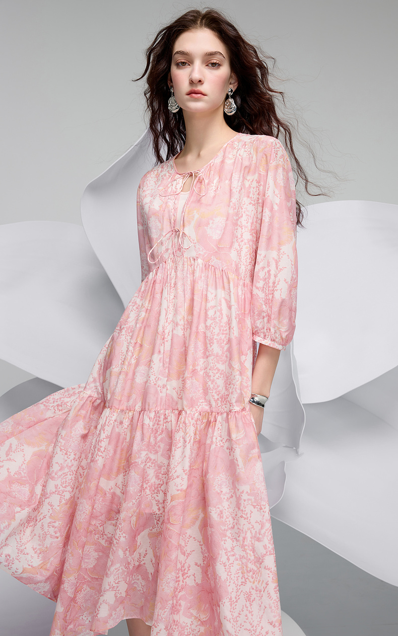 三彩2025春季新款碎花连衣裙两件套圆领系带七分袖长裙浪漫S