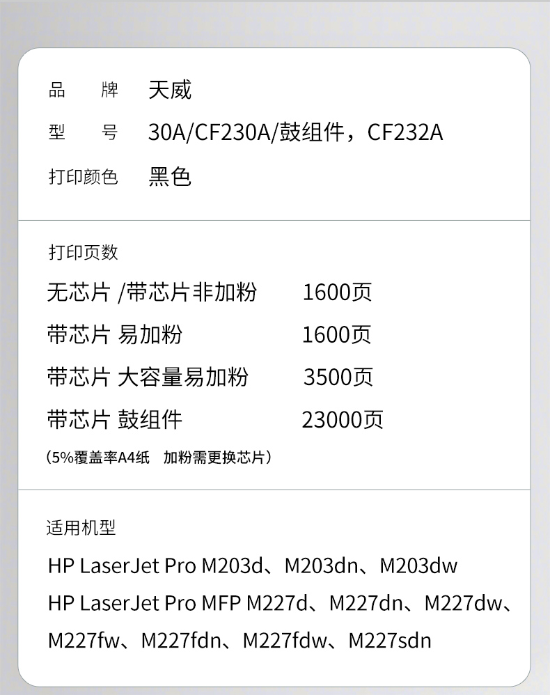 天威 CF230A粉盒 CF232A硒鼓 带芯片 适用惠普 HP30A M227fdw M227sdn M203dn M203d M203dw M227fdn 打印机墨盒