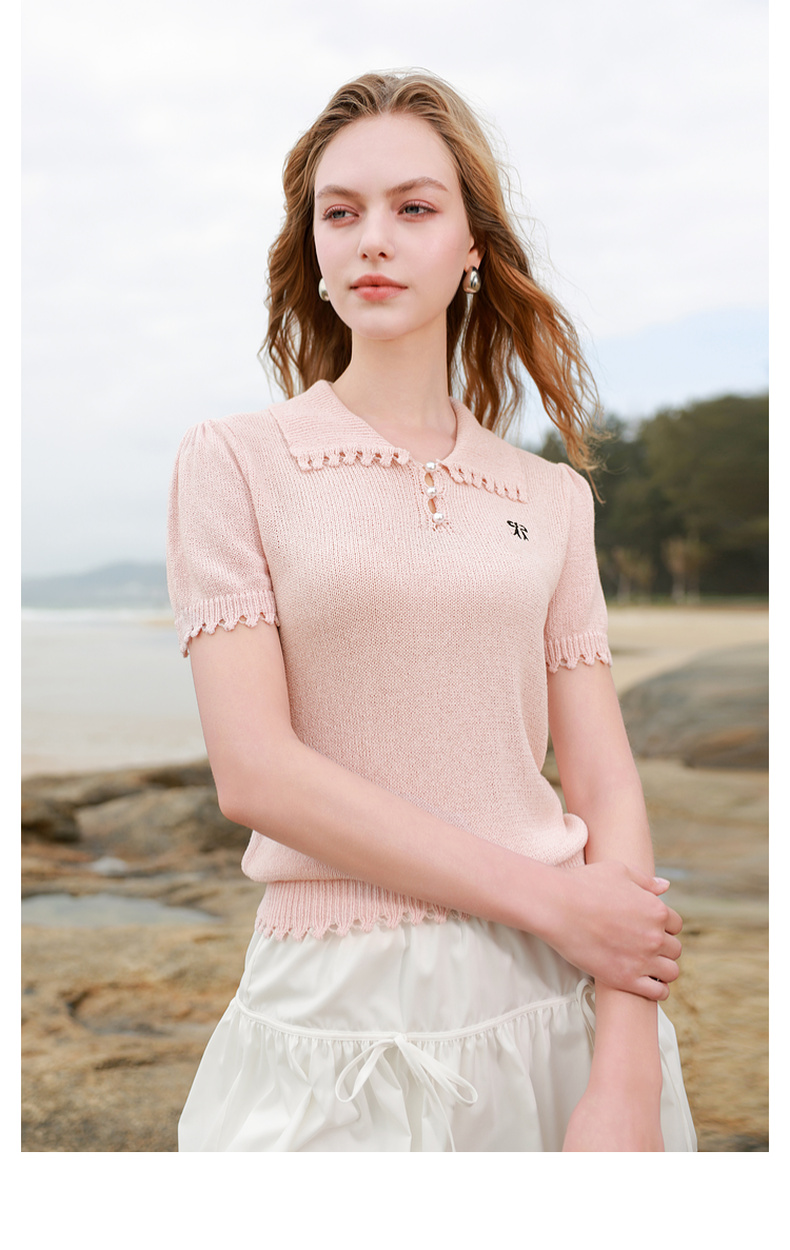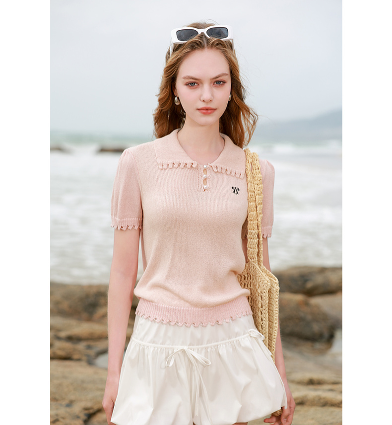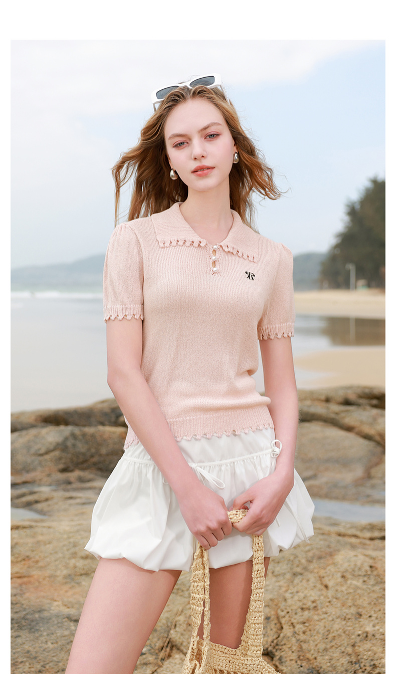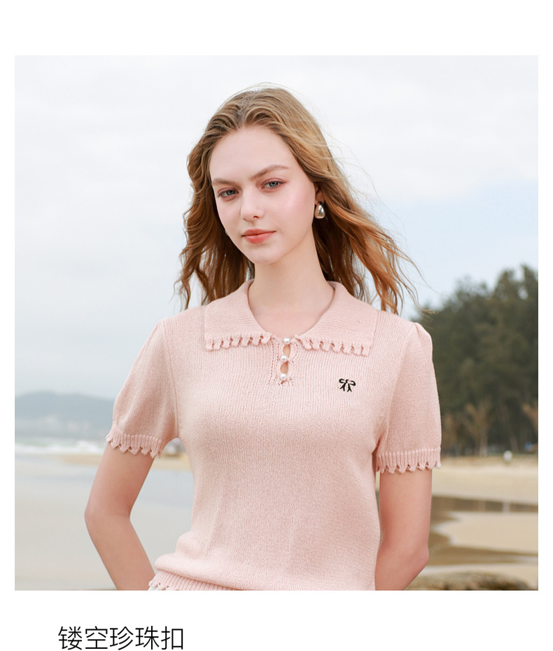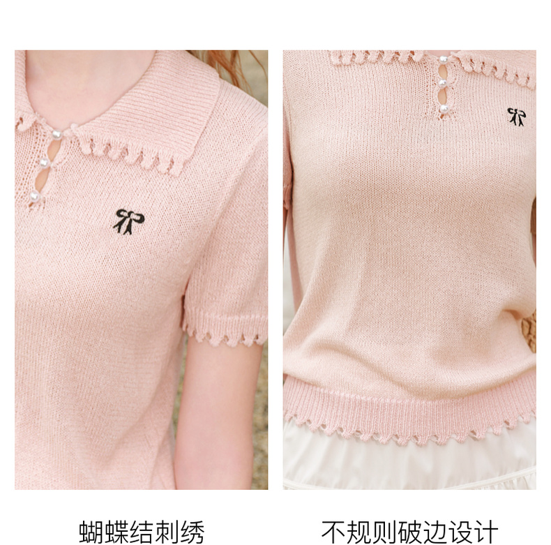三彩2025夏季新款圈圈纱针织衫蝴蝶结刺绣毛衫翻领泡泡袖甜美M