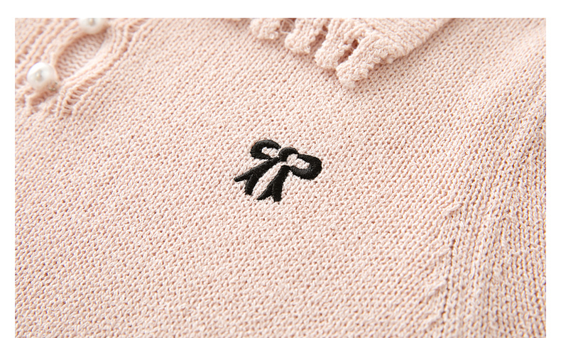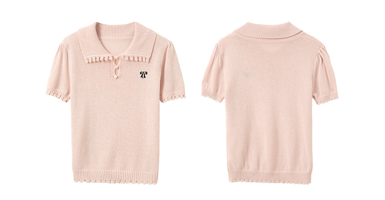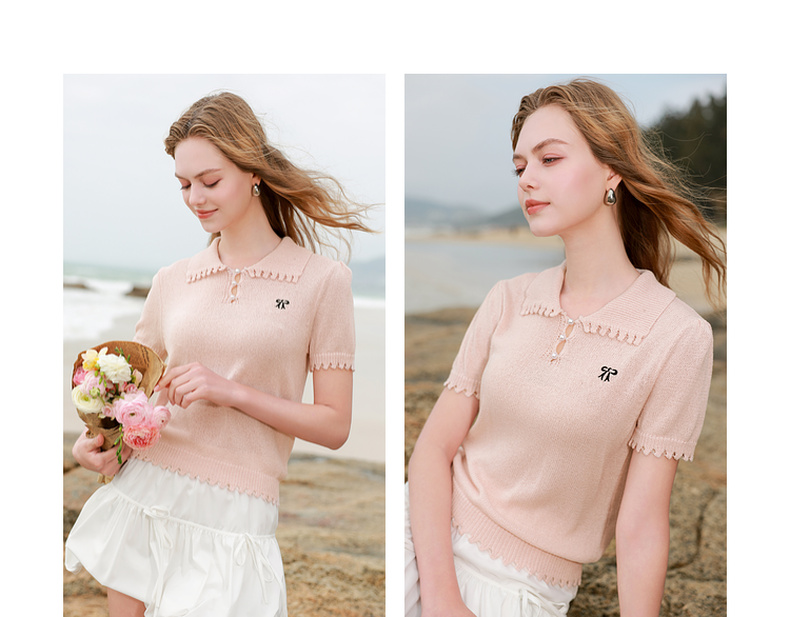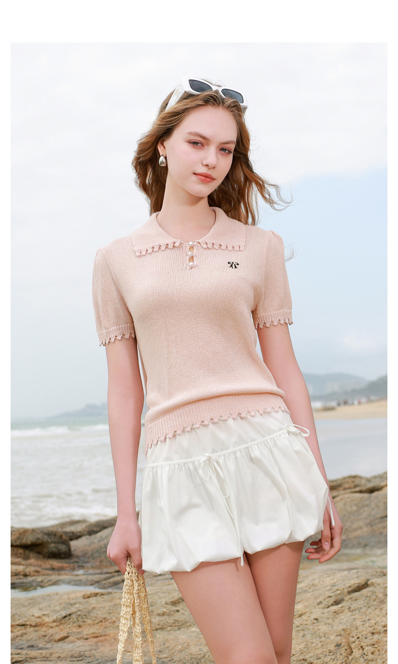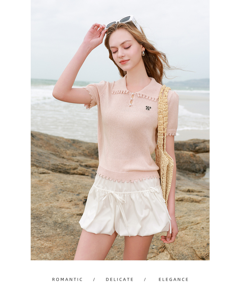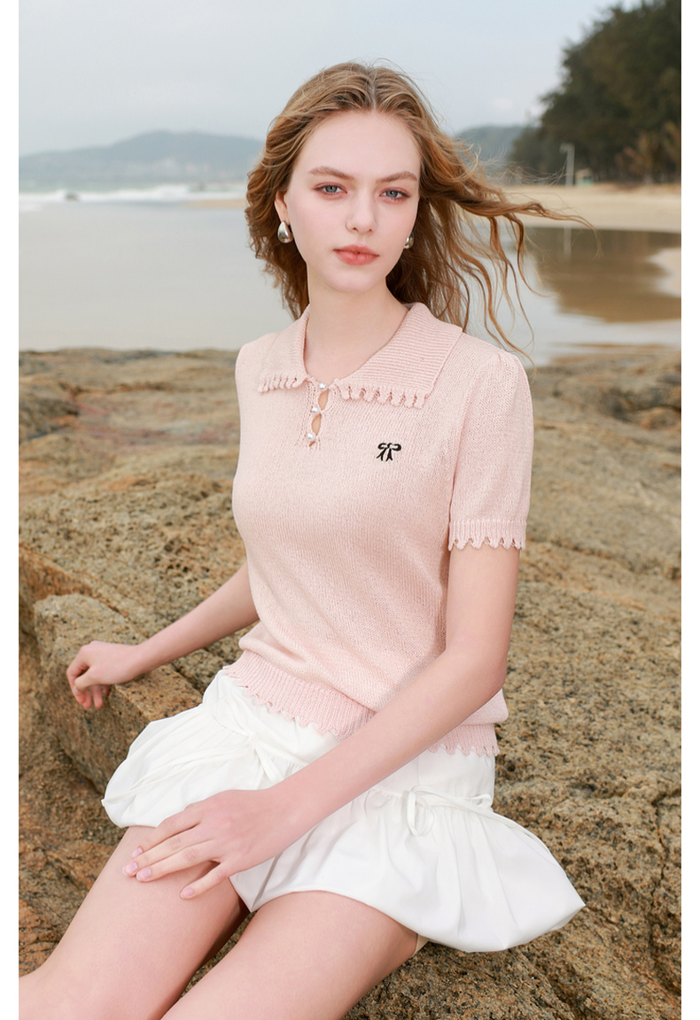 三彩2025夏季新款圈圈纱针织衫蝴蝶结刺绣毛衫翻领泡泡袖甜美M
