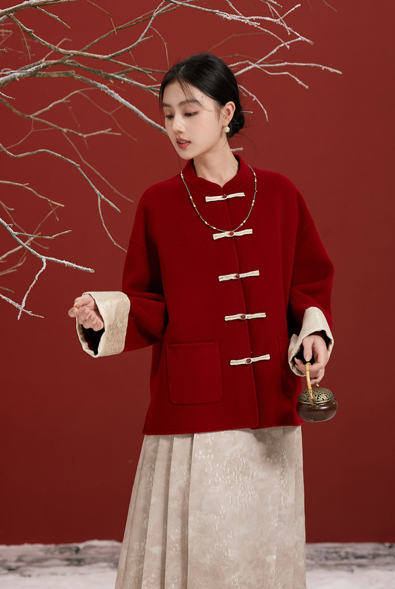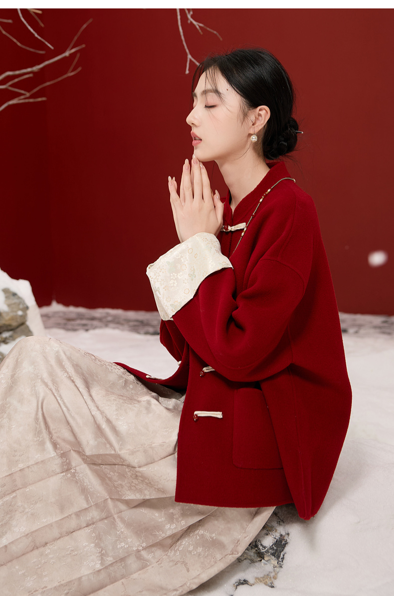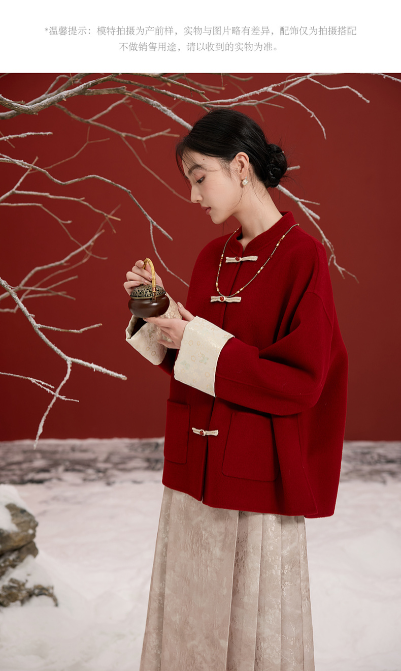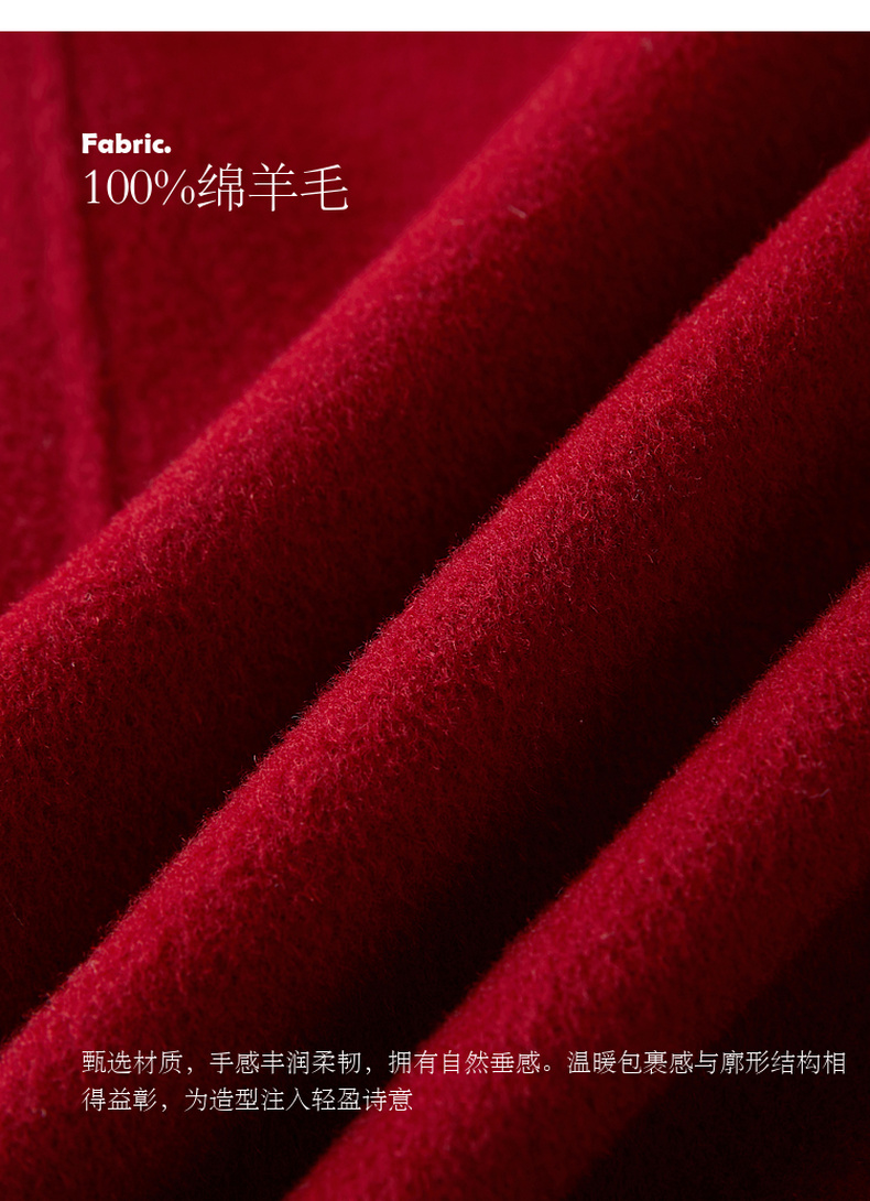 三彩【红梅映雪】2025冬季新款绵羊毛双面呢大衣宽松短款C