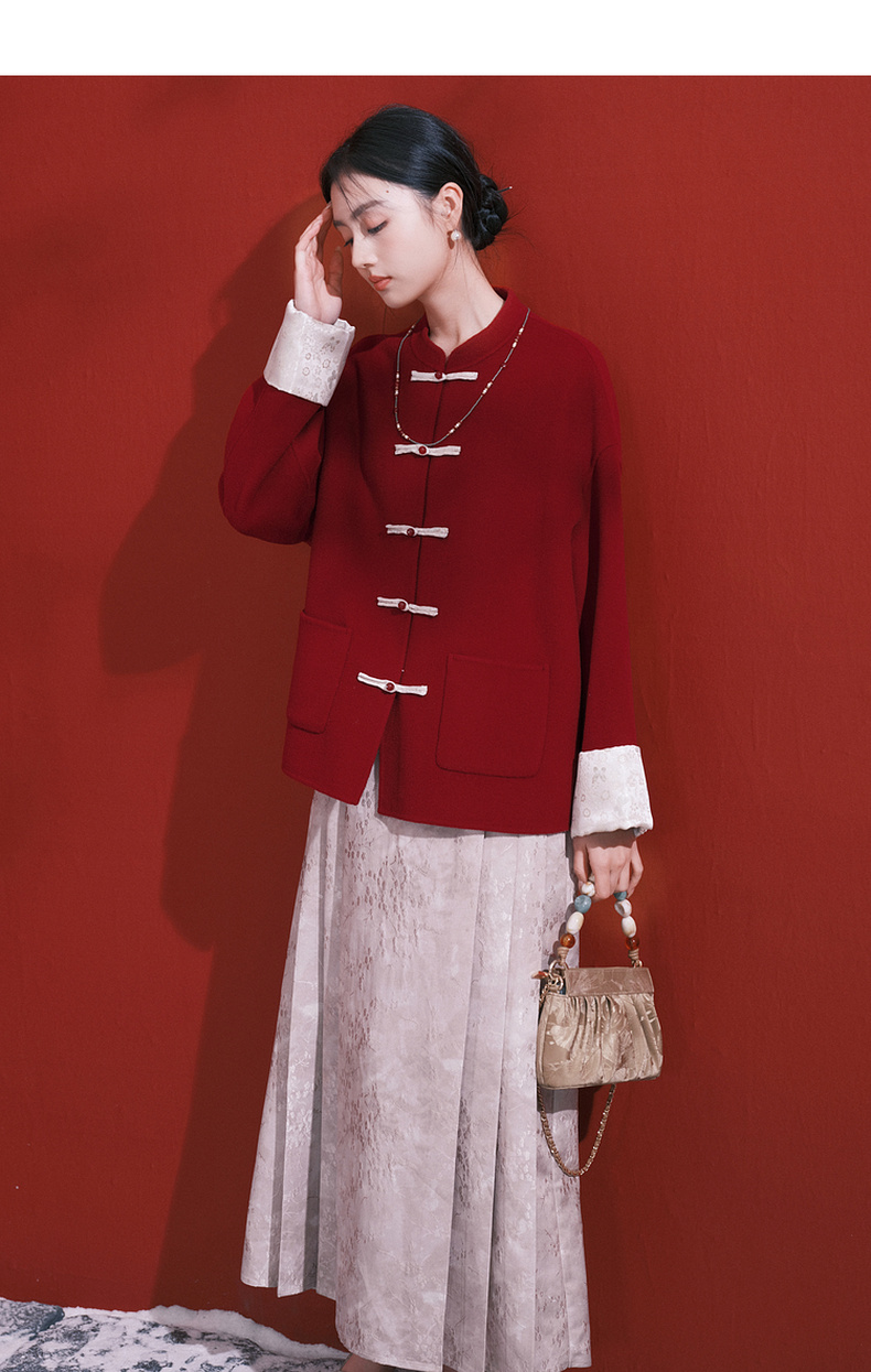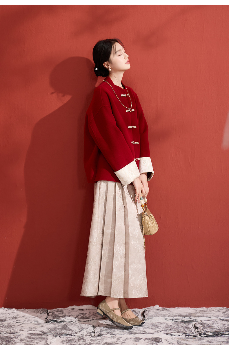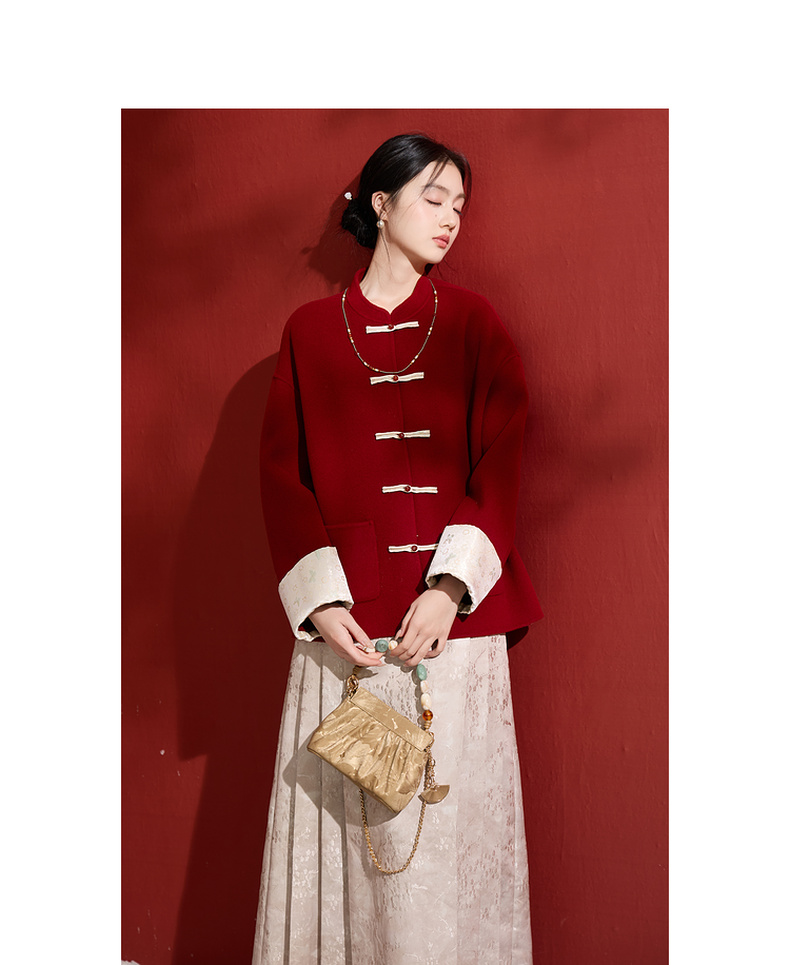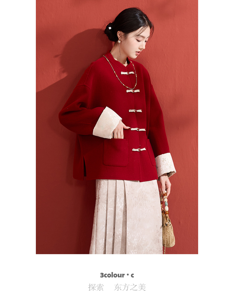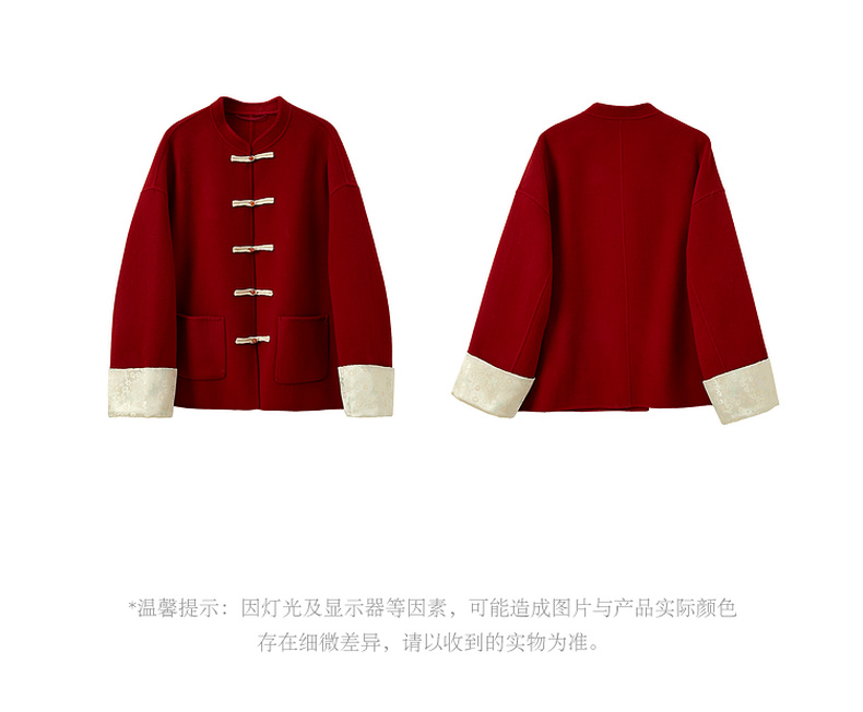 三彩【红梅映雪】2025冬季新款绵羊毛双面呢大衣宽松短款C