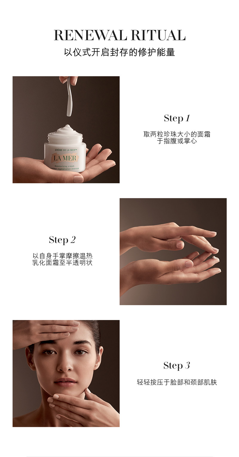 以指腹温热面霜数秒,直至呈现半透明状,可使面霜功效的完全释放。轻柔按摩于脸部和颈部肌肤,直至肌肤完全吸收。