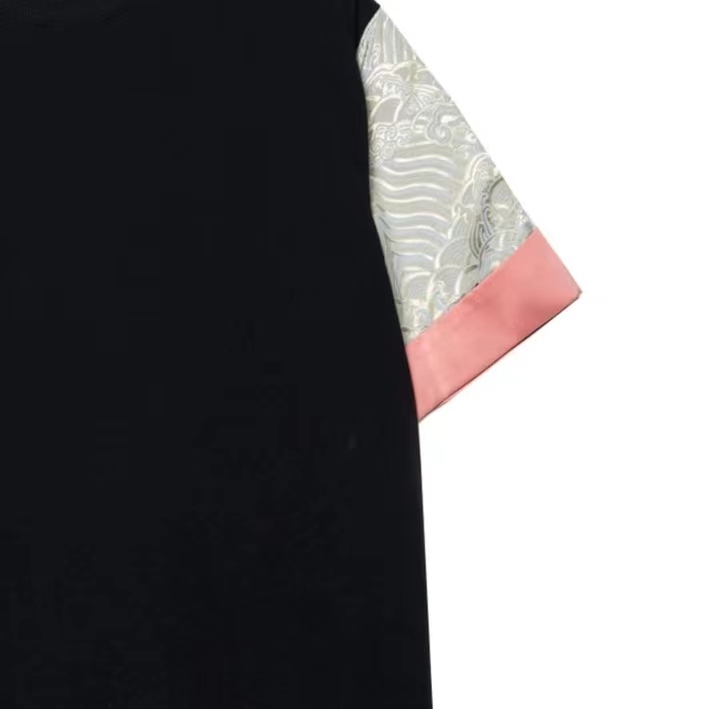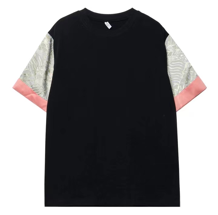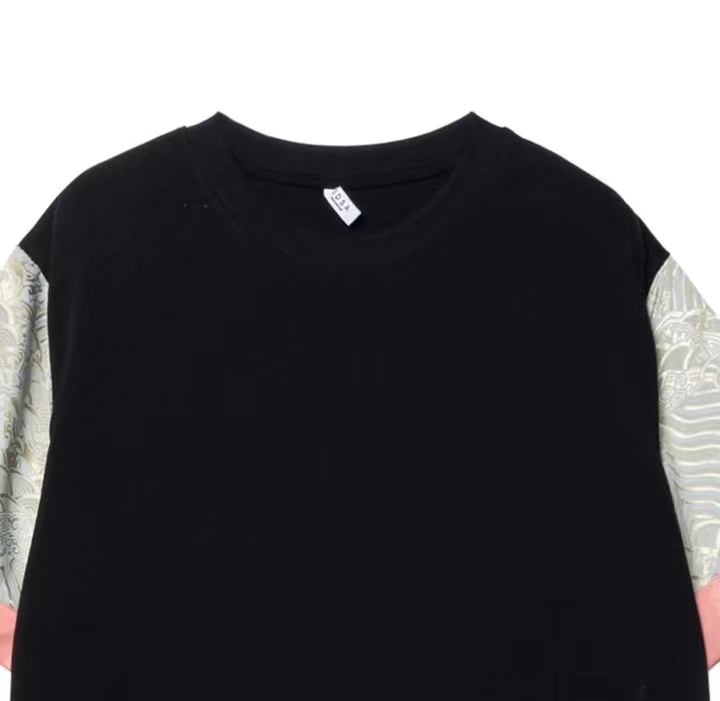 T281古布拼接短袖男夏季潮牌时尚撞色圆领半袖新款夏装休闲上衣服