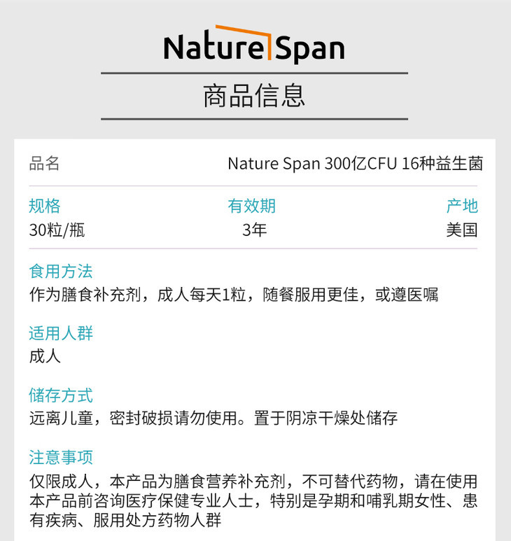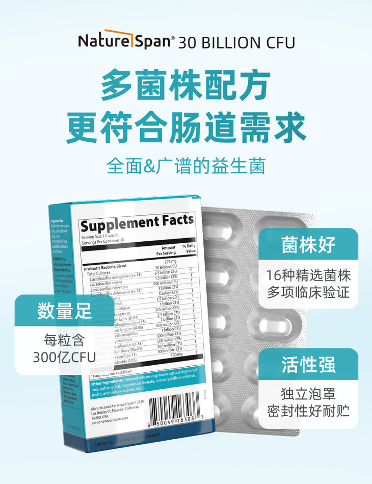 300亿16种调理肠胃菌群复合益生菌 经典版小肚腩救星罗伊氏乳杆菌成人全家 NATURESPAN倍能适