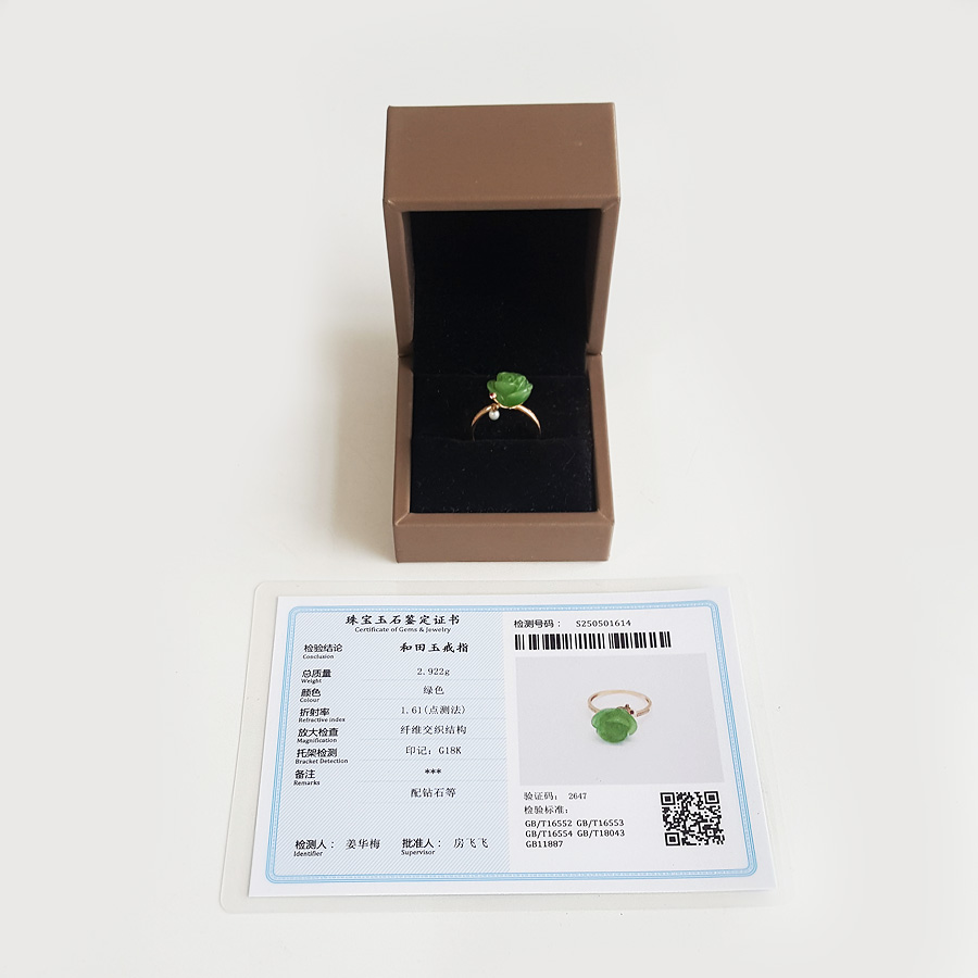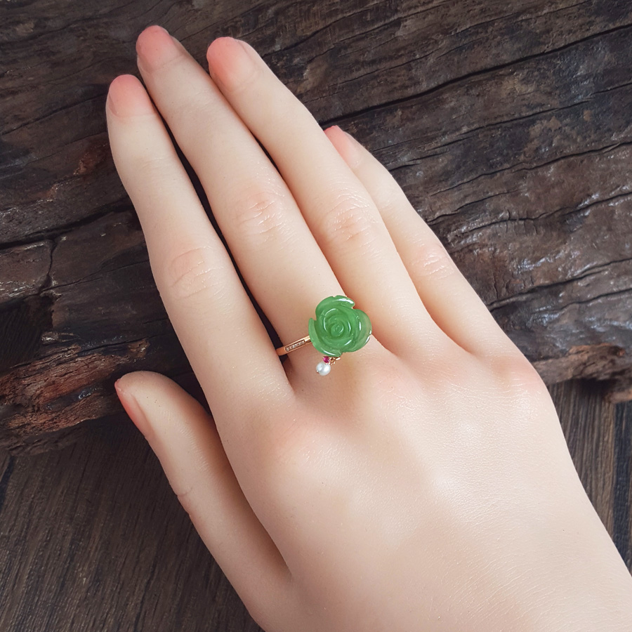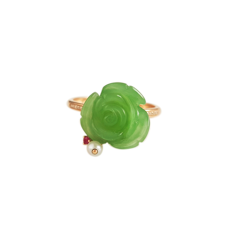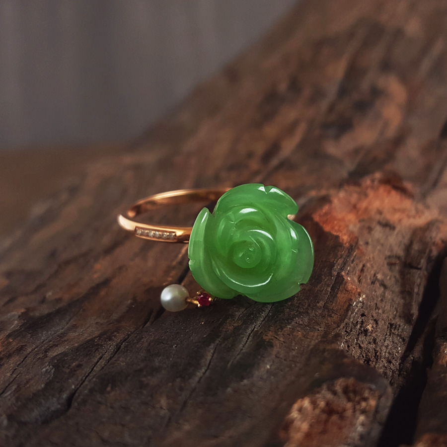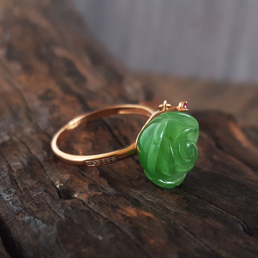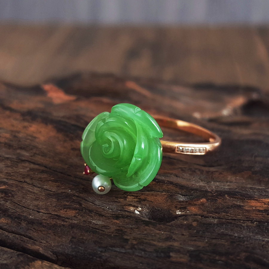 名称 | AU750玫瑰金镶钻镶无黑点苹果绿玫瑰花造型和田玉碧玉戒指 |