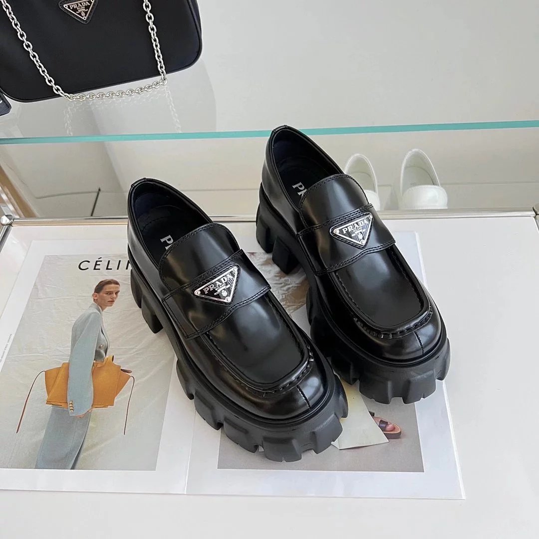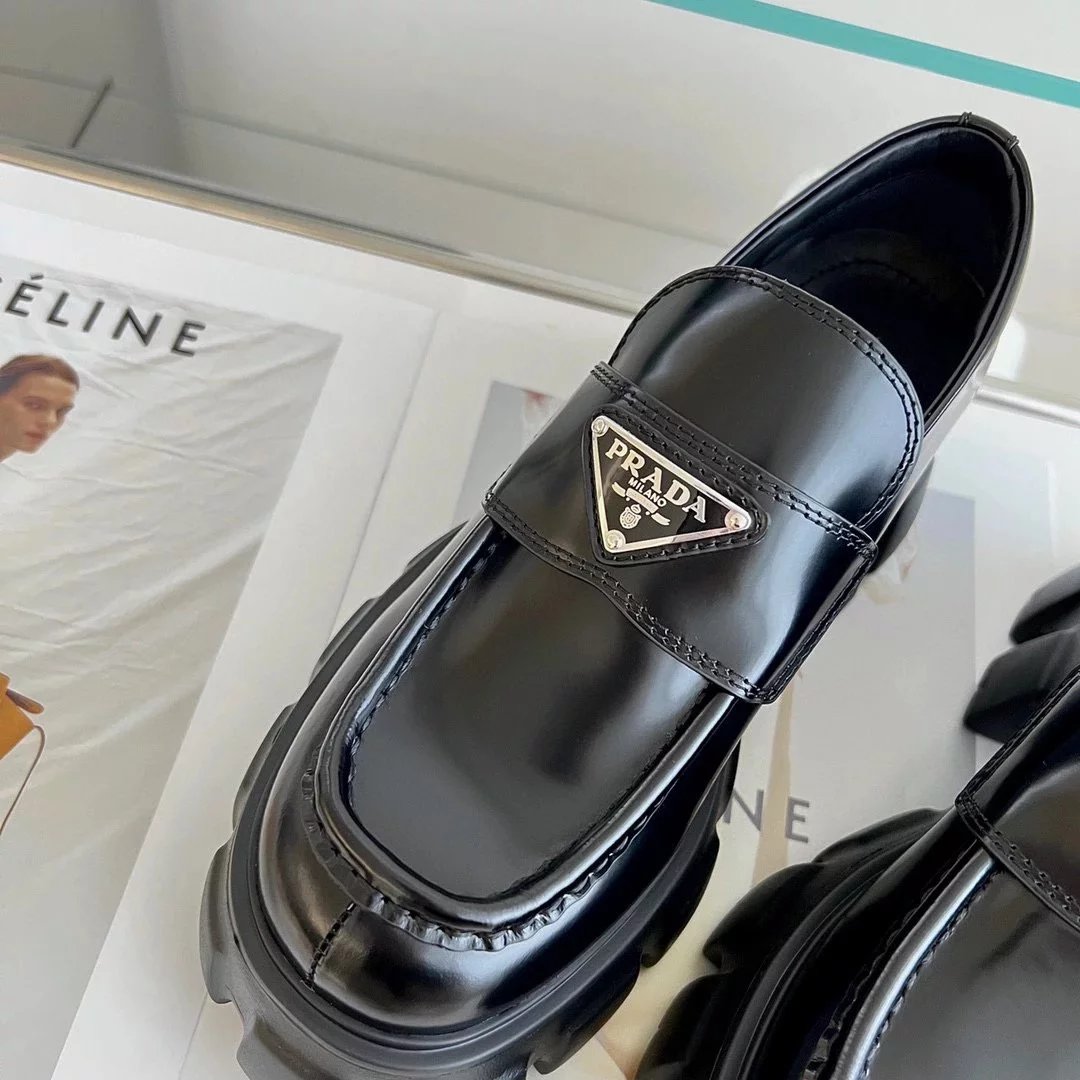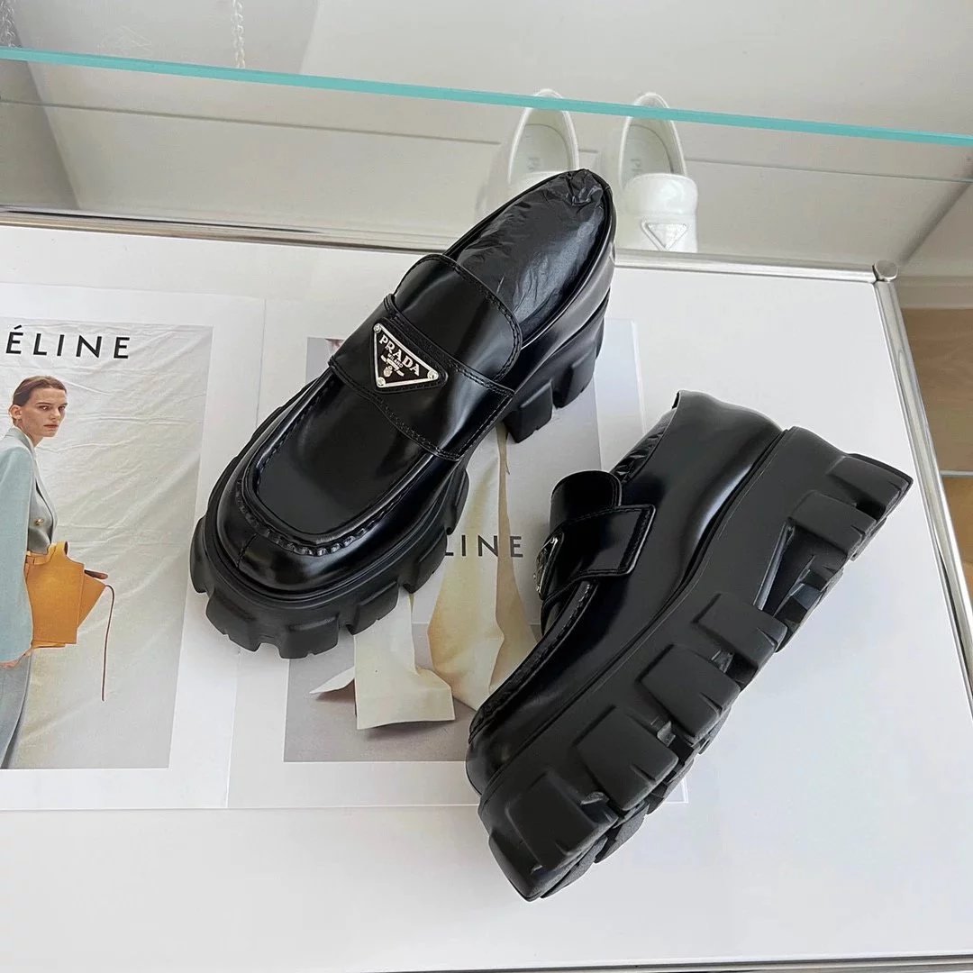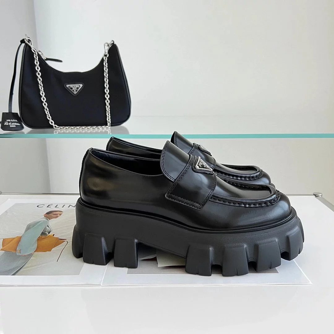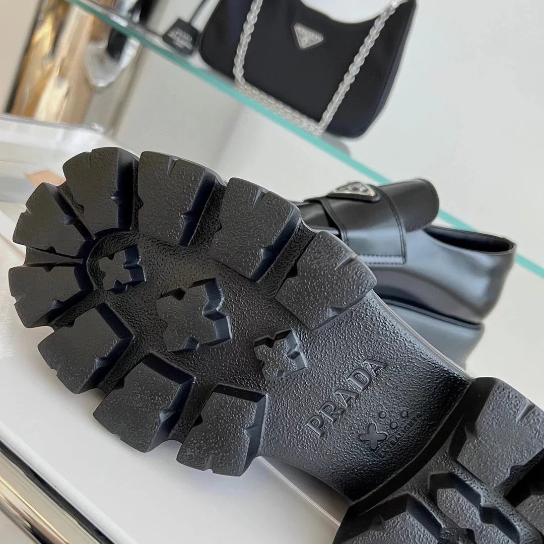 普拉达|锯齿三角标厚底乐福鞋 |7 * 经典Monolith系列锯齿三角标乐福鞋 |级别品质 材质与工艺: 原版开边珠面料 牛皮内里 开模5.5cm一体式轻质IP发泡凹凸纹大底 size:35-40