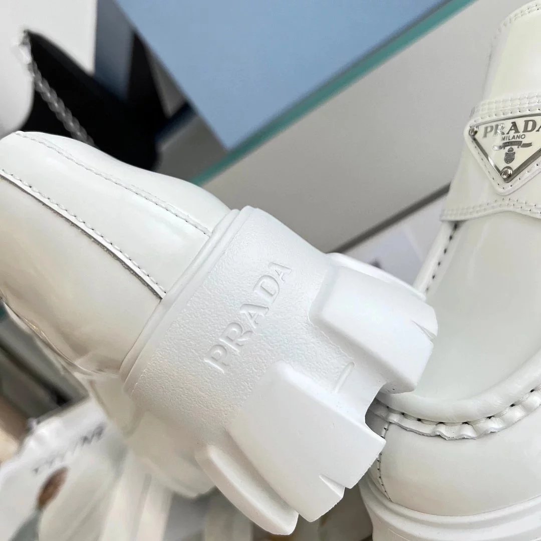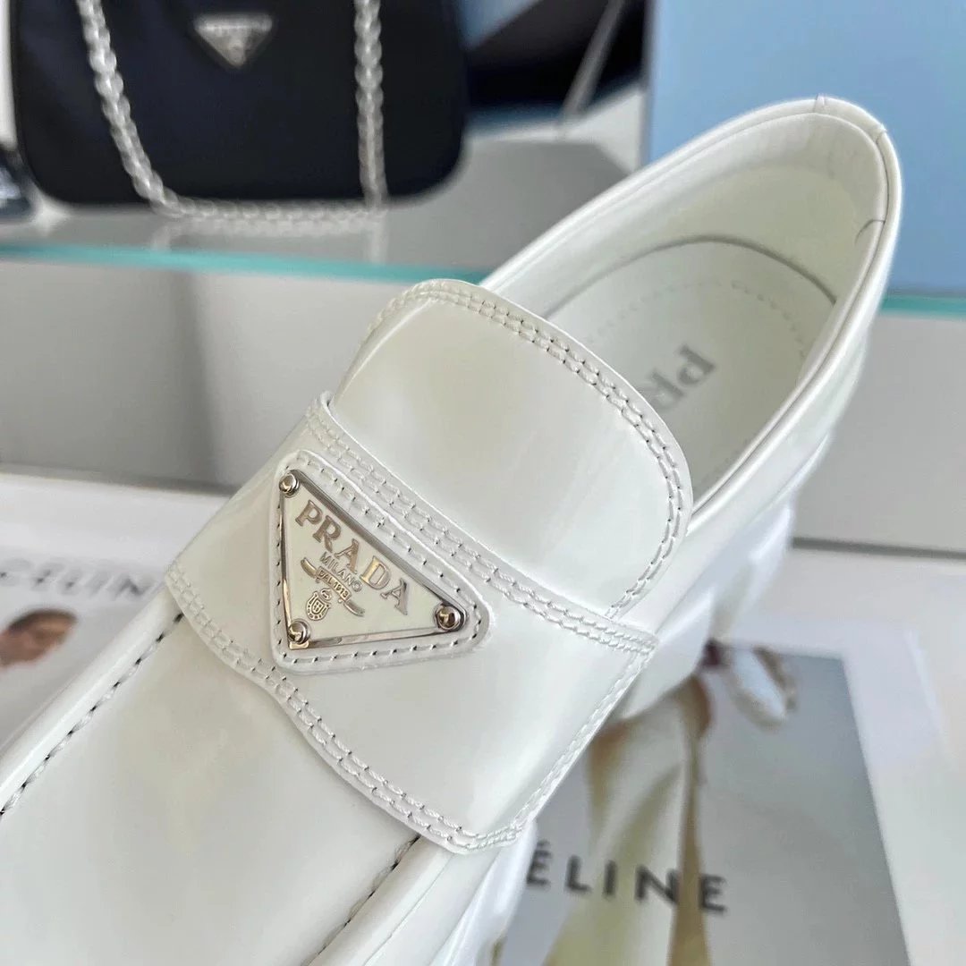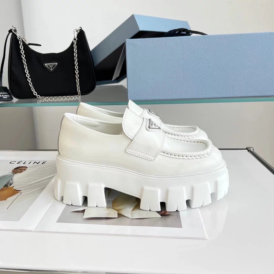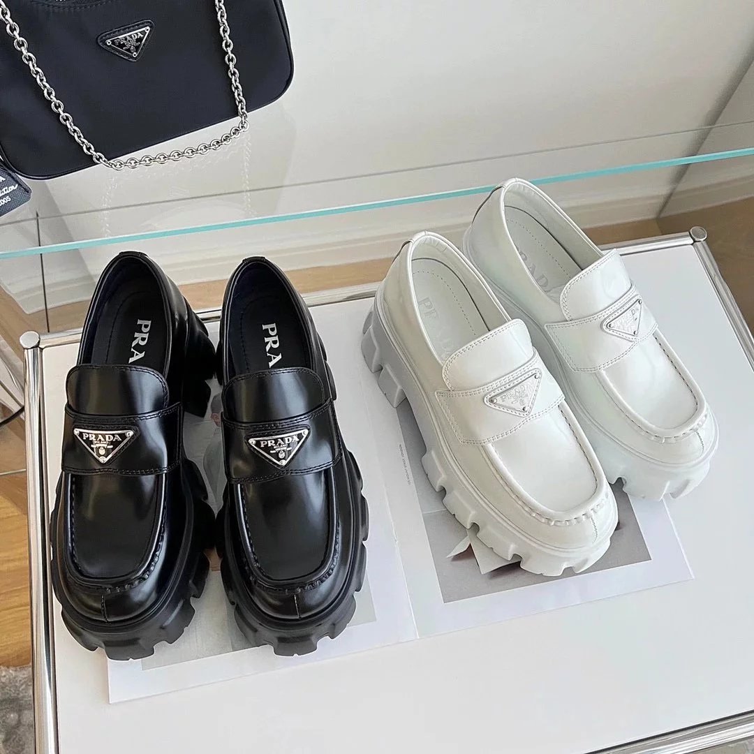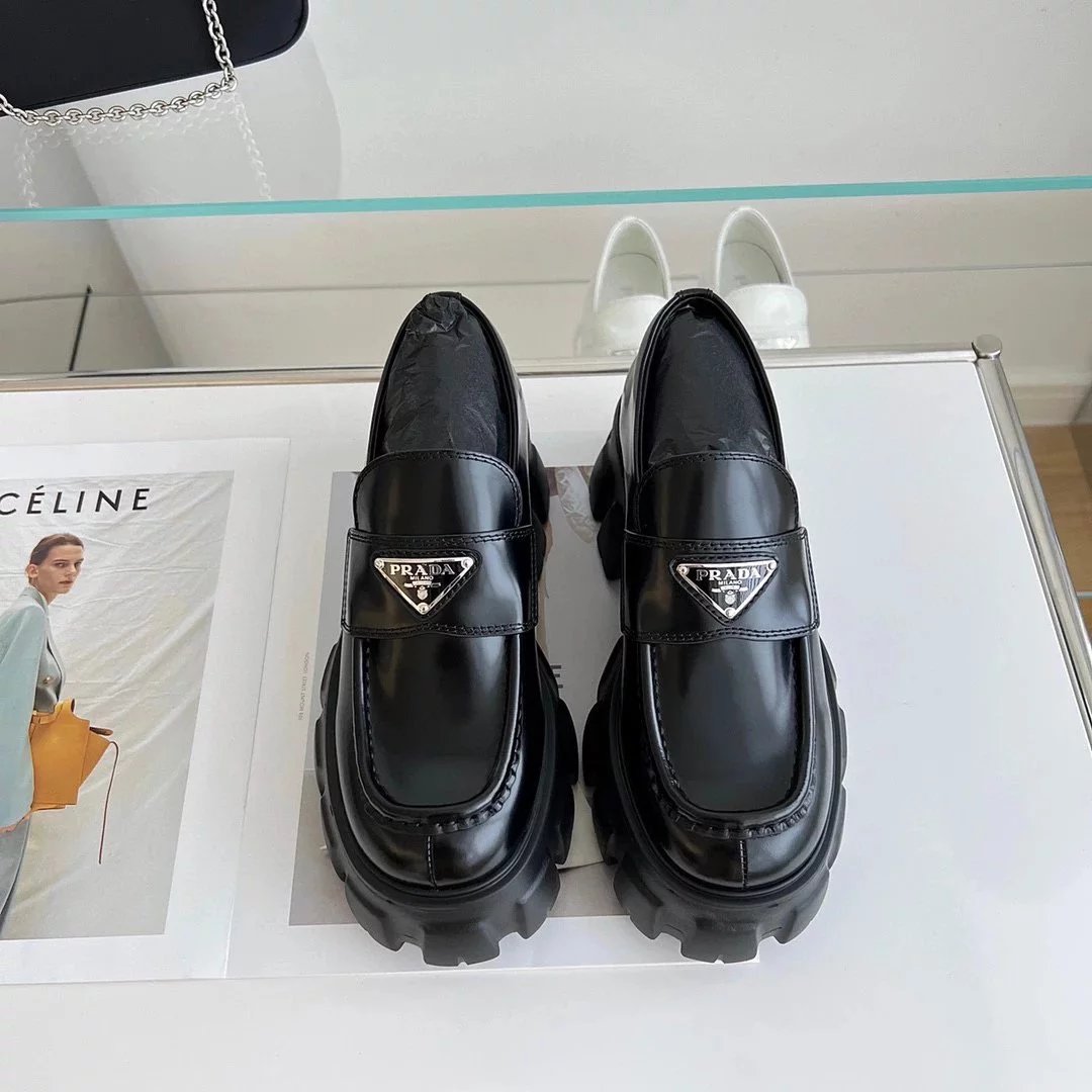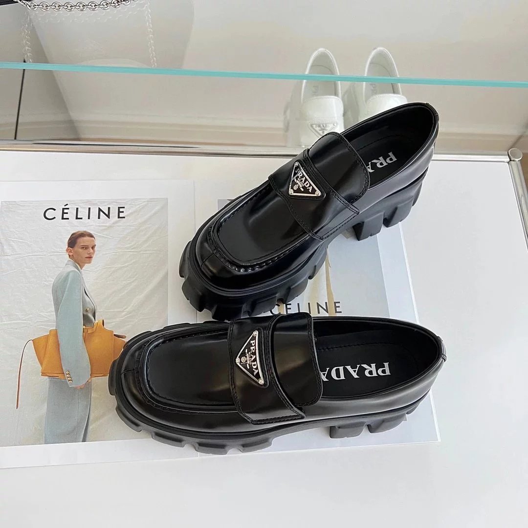普拉达|锯齿三角标厚底乐福鞋 |7 * 经典Monolith系列锯齿三角标乐福鞋 |级别品质 材质与工艺: 原版开边珠面料 牛皮内里 开模5.5cm一体式轻质IP发泡凹凸纹大底 size:35-40