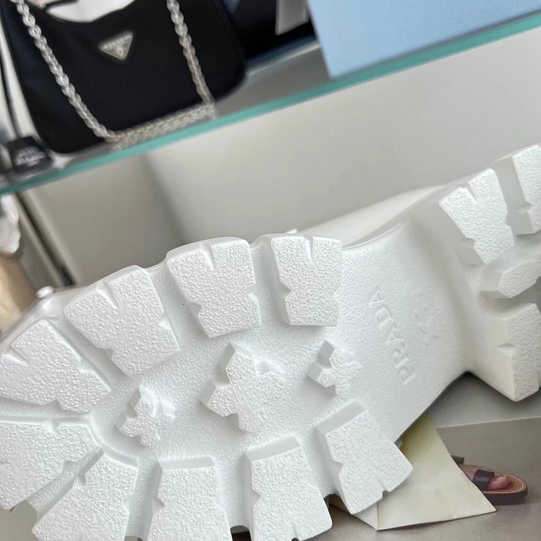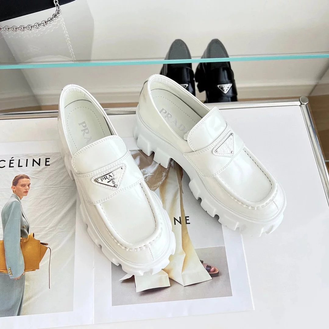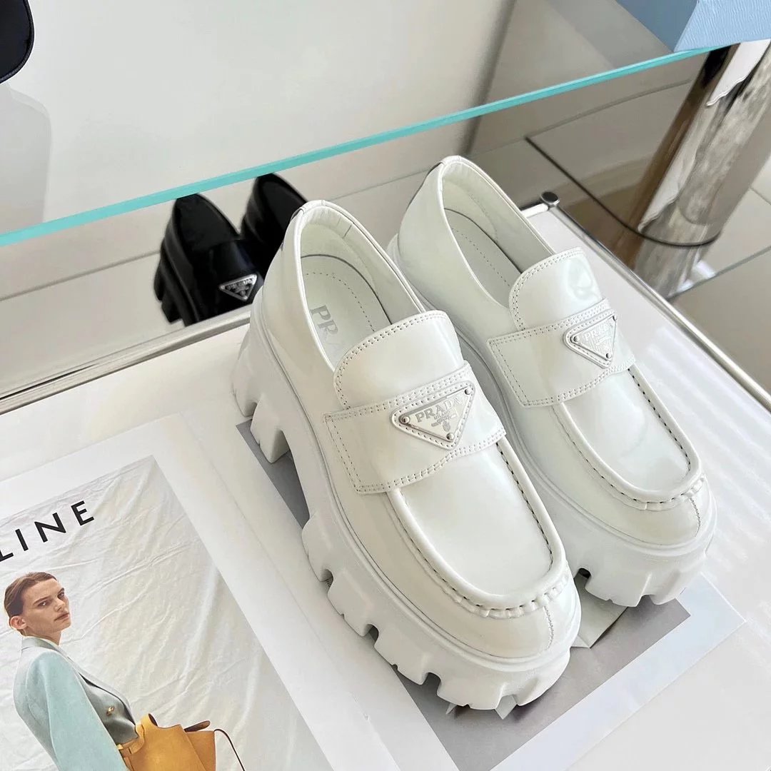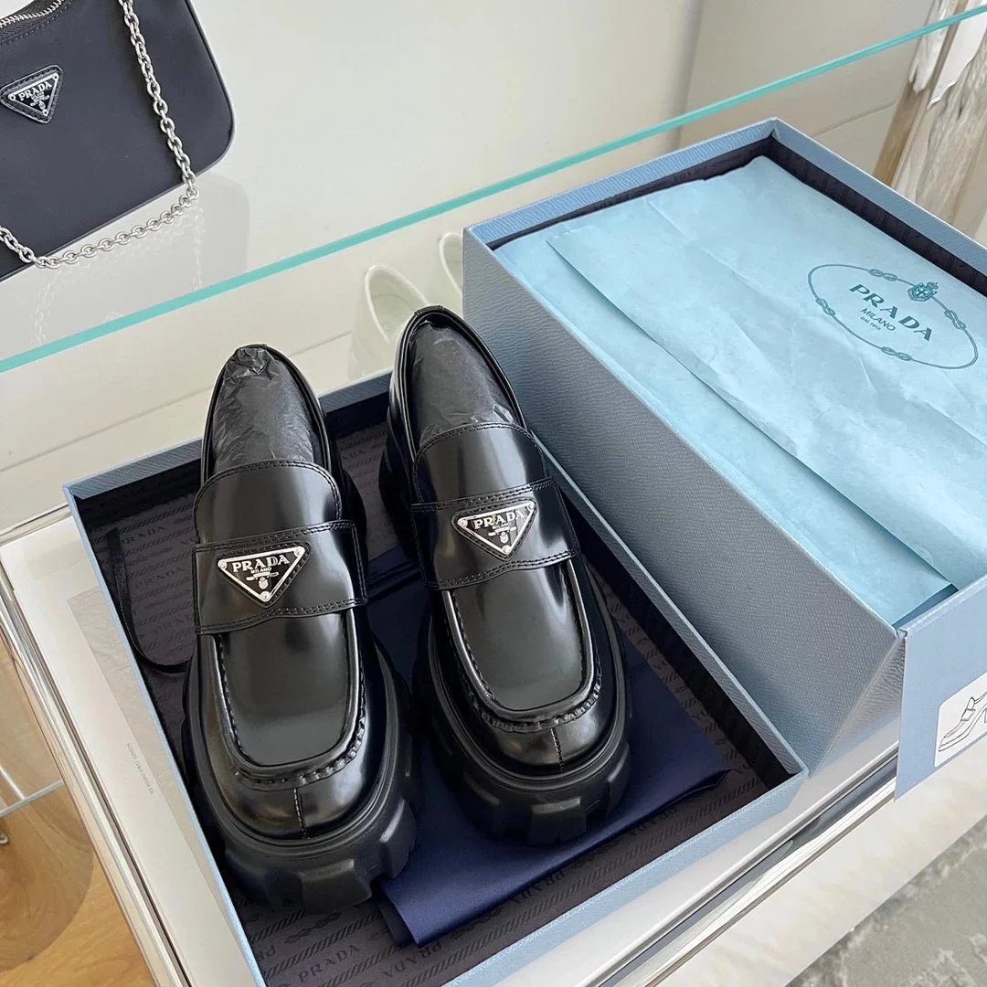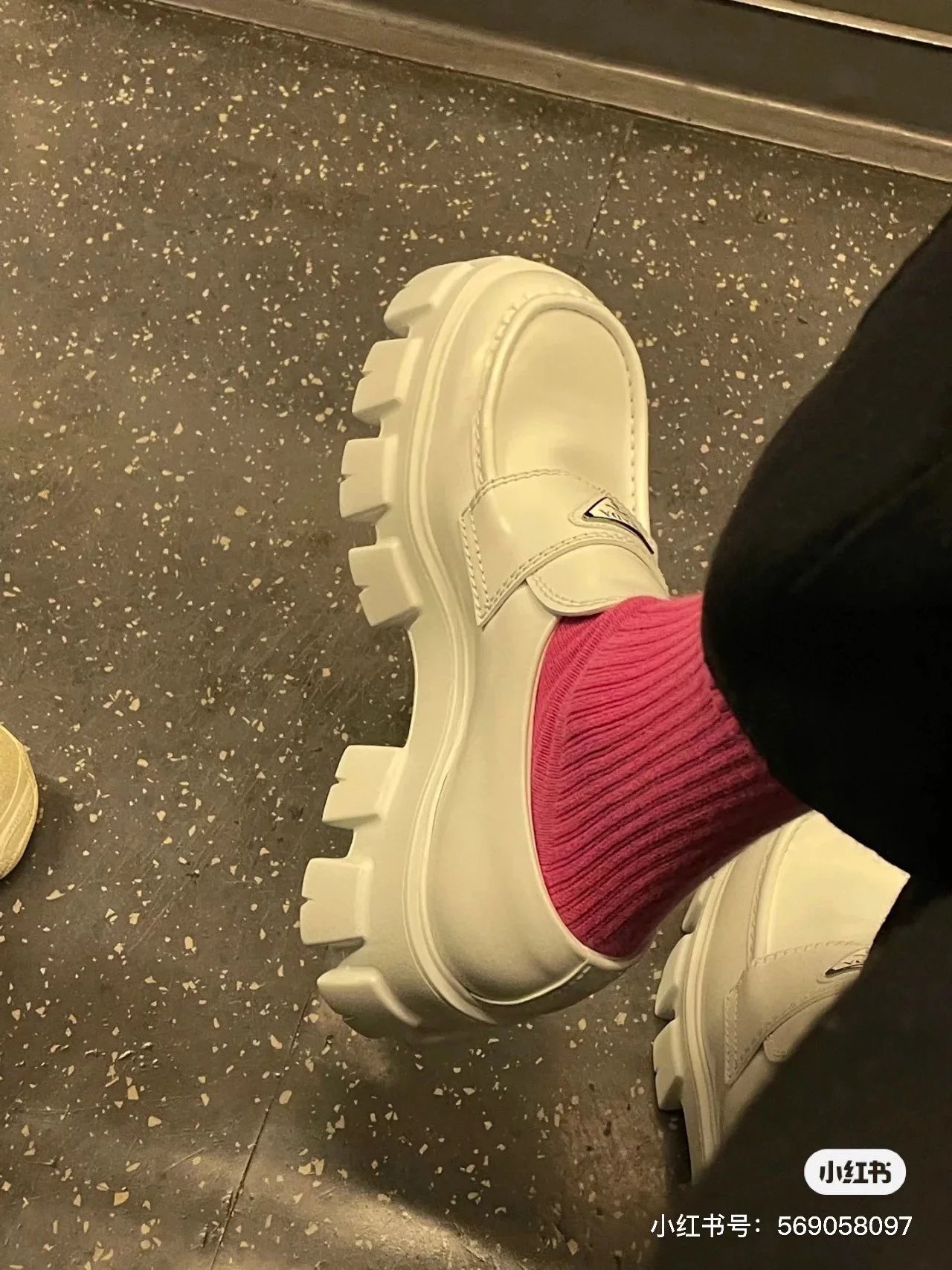普拉达|锯齿三角标厚底乐福鞋 |7 * 经典Monolith系列锯齿三角标乐福鞋 |级别品质 材质与工艺: 原版开边珠面料 牛皮内里 开模5.5cm一体式轻质IP发泡凹凸纹大底 size:35-40