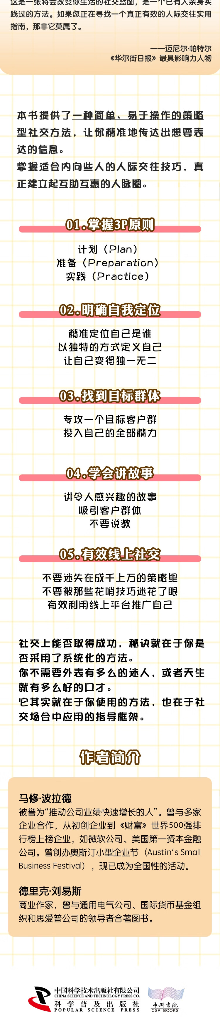 第一章 为什么内向者更擅长社交/1 我们是如何陷入这种混乱的/7 请不要再去模仿外向者了/10 调整社交对话中的平衡关系/12 内向者的优势之社交方式/27 第二章 发挥你的超能力/31 做你所爱,爱你所做/35 点燃你的内心之火/44 第三章 你无法讨好所有人/52 目标客户群范围之外/56 目标客户群定位基础知识/59 做出艰难的抉择/67 找出自己的与众不同之处/68 第四章 人人都在讲故事/76 吸引别人的注意力/82 讲故事的艺术/85 在谈业务时讲讲故事/92 好故事的结构/97 第五章 我们的与众不同定义了我们/108 一个失误,改变了一切/117 受邀分享/123 不要害怕与众不同/125 打造自己的“统一话术”/127 第六章 与正确的人交流/137 你永远不知道下一次会遇见谁/140 不要束于刻板预期/147 给予者、索取者和权衡者/151 我是如何学会社交的/155 进入社交场合前,请先做好调查/158 第七章 社交场合里应该怎么做/166 为成功社交做准备/168 如何邀请他人与你交谈/172 别急着达成交易/176 结束时约好下次见面的时间地点/177 两则社交故事/180 实践、实践,再实践/186 第八章 被人遗忘的一步/192 如何跟进捍卫者/196 如何跟进资源伙伴/200 如何跟进目标客户/202 第九章 反馈工厂/206 工厂生产线/217 第十章 数字前沿/220 我个人关于开展线上业务的恐惧心理/227 你拥有线上社交的成功要素/231 后记/234