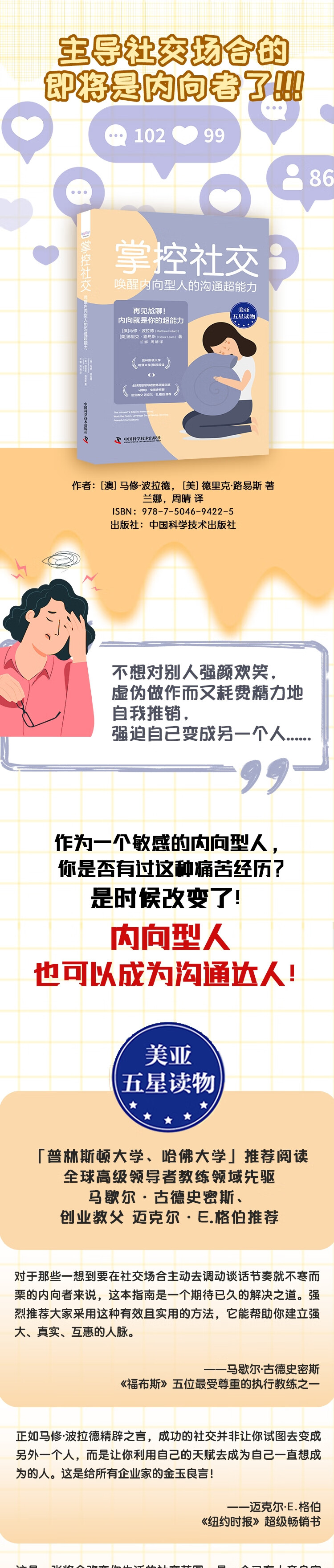 1.不想对别人强颜欢笑,虚伪做作而又耗费精力地自我推销,强迫自己变成另一个人......作为一个敏感的内向型人,你是否有过这种痛苦经历?是时候改变了!内向型人也可以成为沟通达人! 2.本书提供了一种简单、易于操作的策略型社交方法,让你精准地传达出想要表达的信息。掌握适合内向些人的人际交往技巧,真正建立起互助互惠的人脉圈。 3.普林斯顿大学、哈佛大学推荐阅读,全球高级领导者教练领域先驱 马歇尔·戈德史密斯、创业教父 迈克尔·E.格伯推荐。