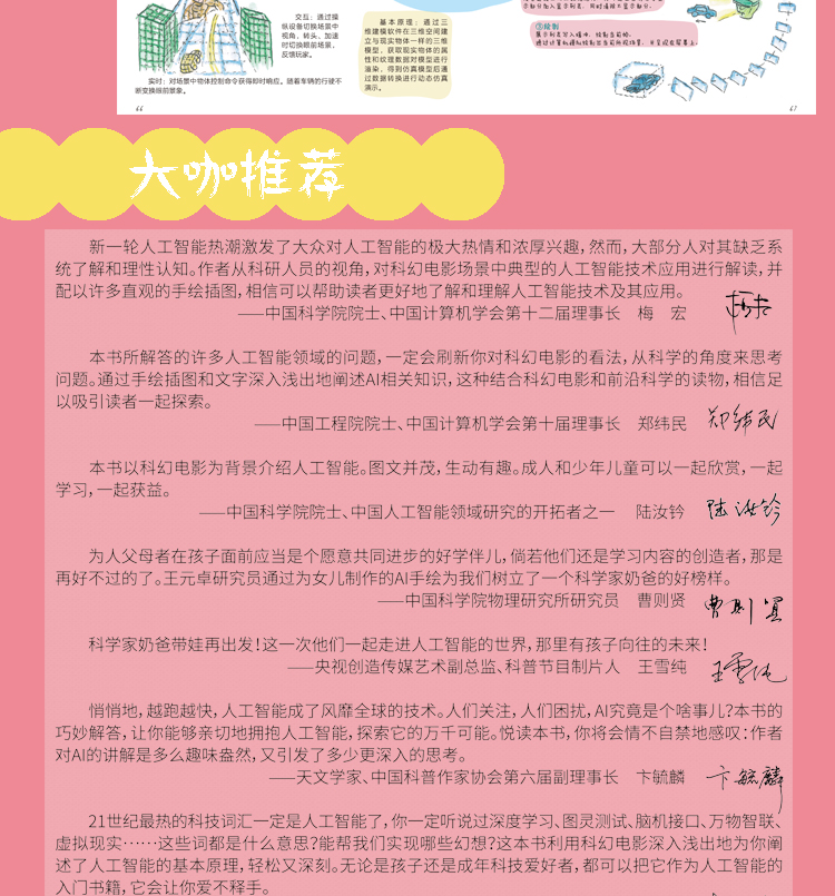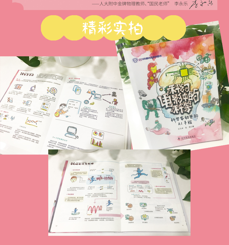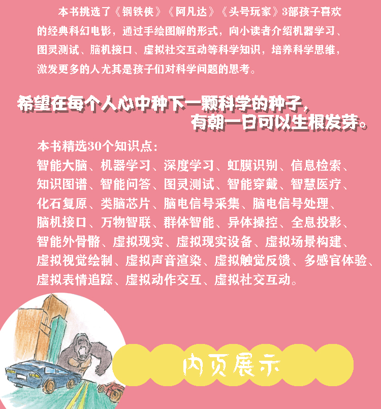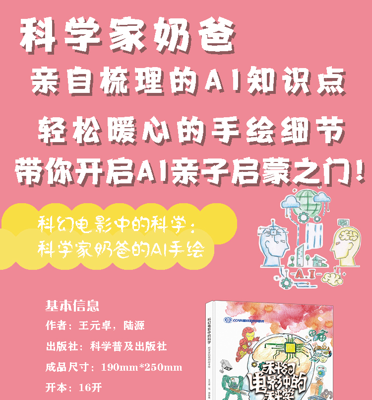 《科学家奶爸的AI手绘》一书是《科学家奶爸的宇宙手绘》的姊妹篇。《宇宙手绘》出版当月重印,入选科普作协百种优秀科普读物推荐榜单、“中国好书”7月初评、 2020年中华优秀科普图书榜年度榜单,受到较好社会反响。《科学家奶爸的AI手绘》挑选了《钢铁侠》《阿凡达》《头号玩家》3部孩子们喜欢的经典科幻电影,通过手绘图解的形式,向公众介绍机器学习、图灵测试、脑机接口、虚拟社交互动等科学知识,培养科学思维,激发更多的人尤其是孩子们对科学问题的思考。书中挑选的知识点以及所回答的问题,都是作者选自在自媒体与读者互动过程中读者提出的问题,它在一定程度上能够代表孩子对一个特定科幻场景下的思考和关注点。本书希望在每个人心中种下一颗科学的种子,有朝一日可以生根发芽。