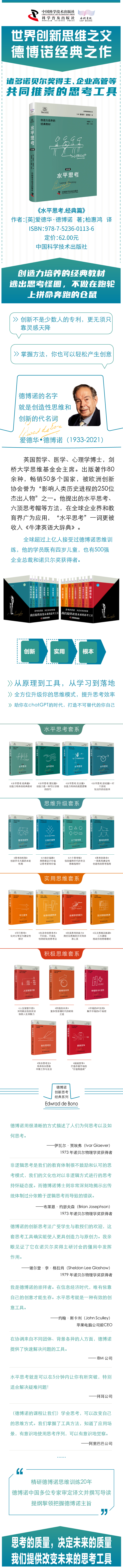 爱德华?6?1德博诺,英国哲学、医学、心理学博士,剑桥大学思维基金会主席。出版著作80余种,畅销50多个国家,被欧洲创新协会誉为“影响人类历史进程的250位杰出人物”之一。他提出的水平思考、六顶思考帽等方法,在全球企业界和教育界广为应用,“水平思考”一词更被收入《牛津英语大辞典》。他的名字已成为创造性思维和创新的代表。