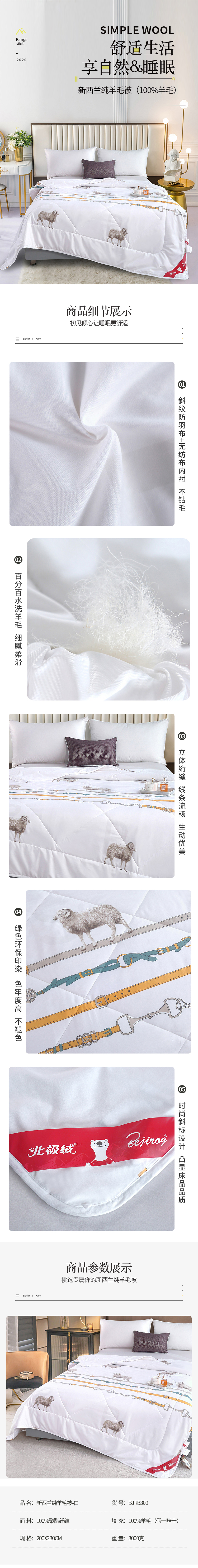 北极绒 BJRB309新西兰纯羊毛被-白 200x230cm( 3kg)