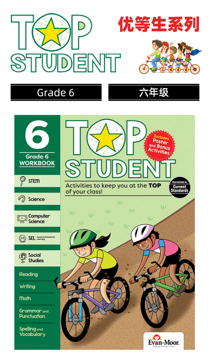 美国加州教辅优等生系列练习册小学六年级 英文原版 Evan Moor Top Student Grade 6 英语数学STEM科学计算机社交情感 英文版