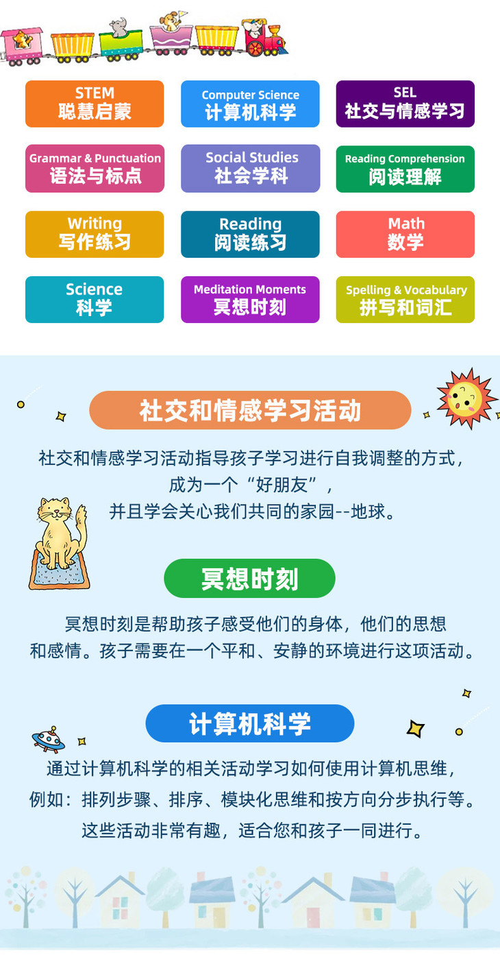 优等生系列是一个设计非常全面的教育系列。它从写作、阅读、科学、数学、地理、社交与情感学习等方面帮助孩子一起快乐学习!