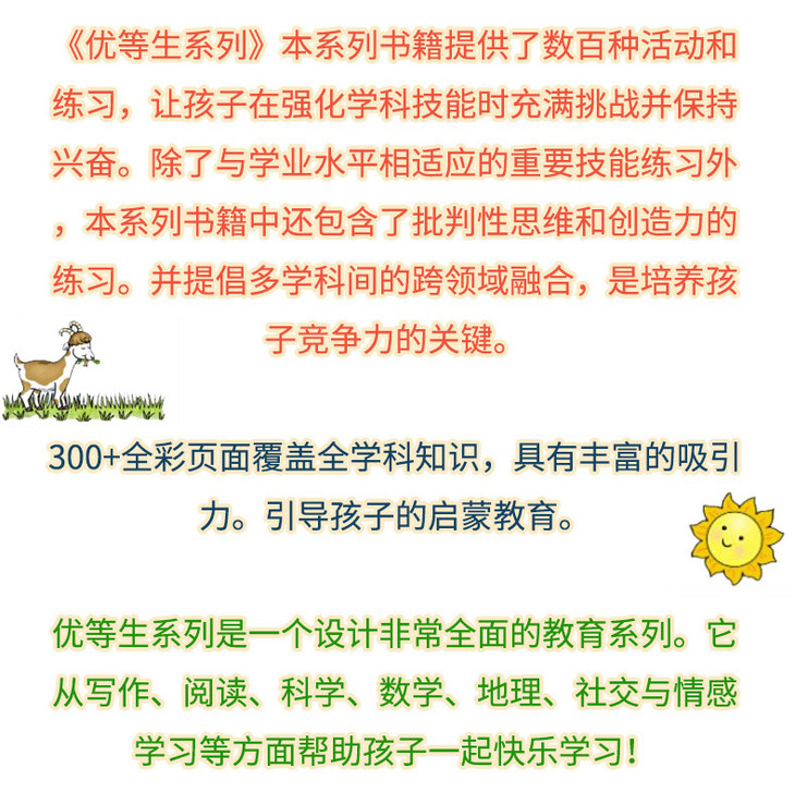 Top Student《优等生系列》书籍提供了数百种活动和练习,让孩子在强化学科技能时充满挑战并保持兴奋。除了与学业水平相适应的重要技能练习外,本系列书籍中还包含了批判性思维和创造力的练习。并提倡多学科间的跨领域融合,是培养孩子竞争力的关键。