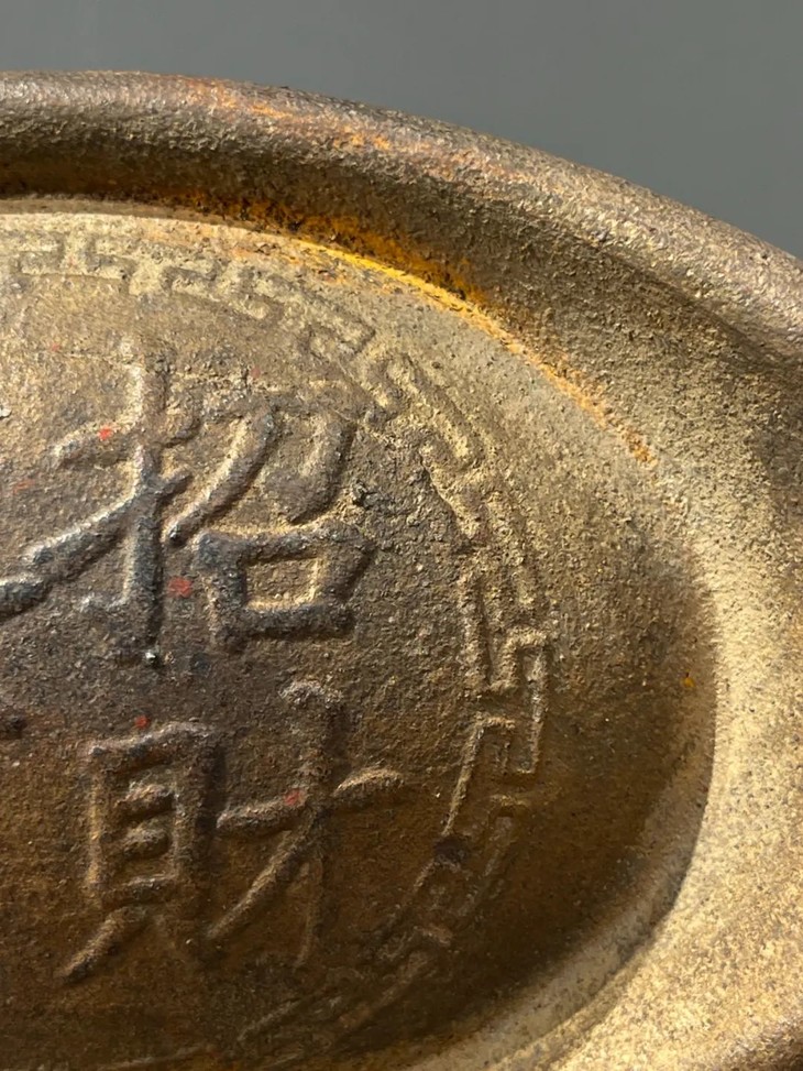 这是一件古代庙宇或是民间供奉于道贯的铁质“招財進寶“纹元宝型镇纸,底部阴刻“宣“字,古代匠人设计以及铸造这件材质坚硬比重高,造型典雅的金元宝型镇纸,匠心独具,精巧别致,风格优雅,可以当室内案头装饰、或可取期沉重掌中尺寸,充书房镇纸、佛前压經书镇等吉祥物。