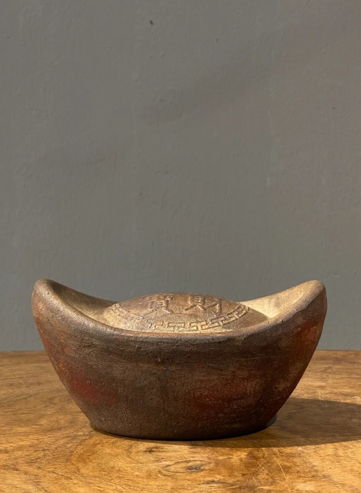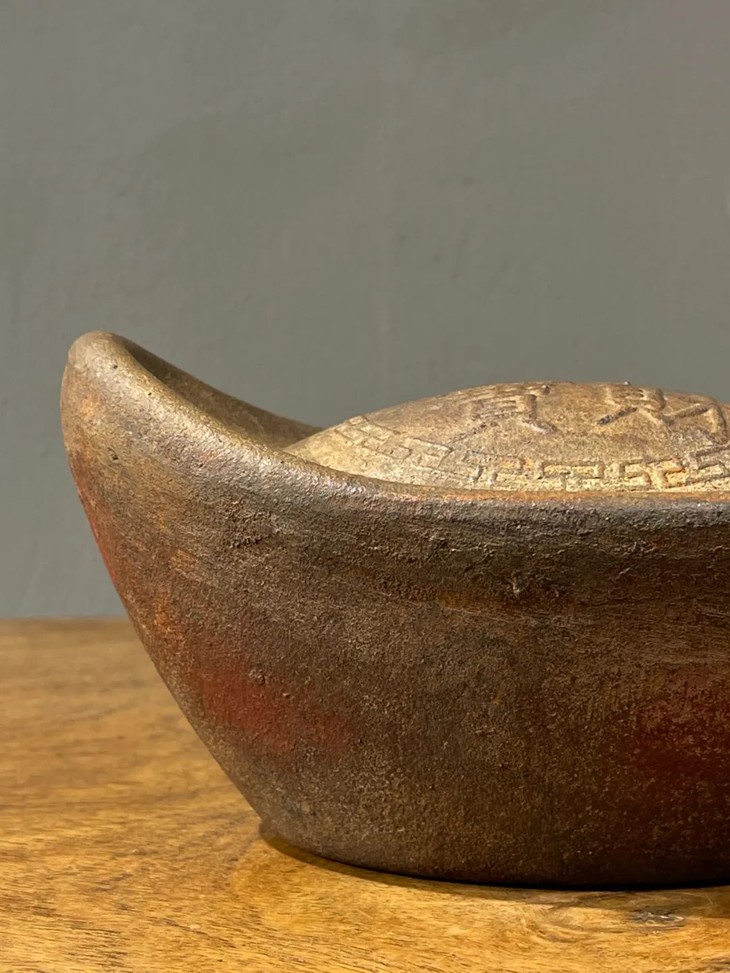 这件铁质金元宝形镇纸,年代老,尺寸适中,形式简约贵气,自然洒脱老铁表面锈斑与包浆皮壳共存,置于案头或茶席上,立显主人之优雅品味。此铁质金元宝形镇纸,除了表面锈斑外,基本保存完整无损。