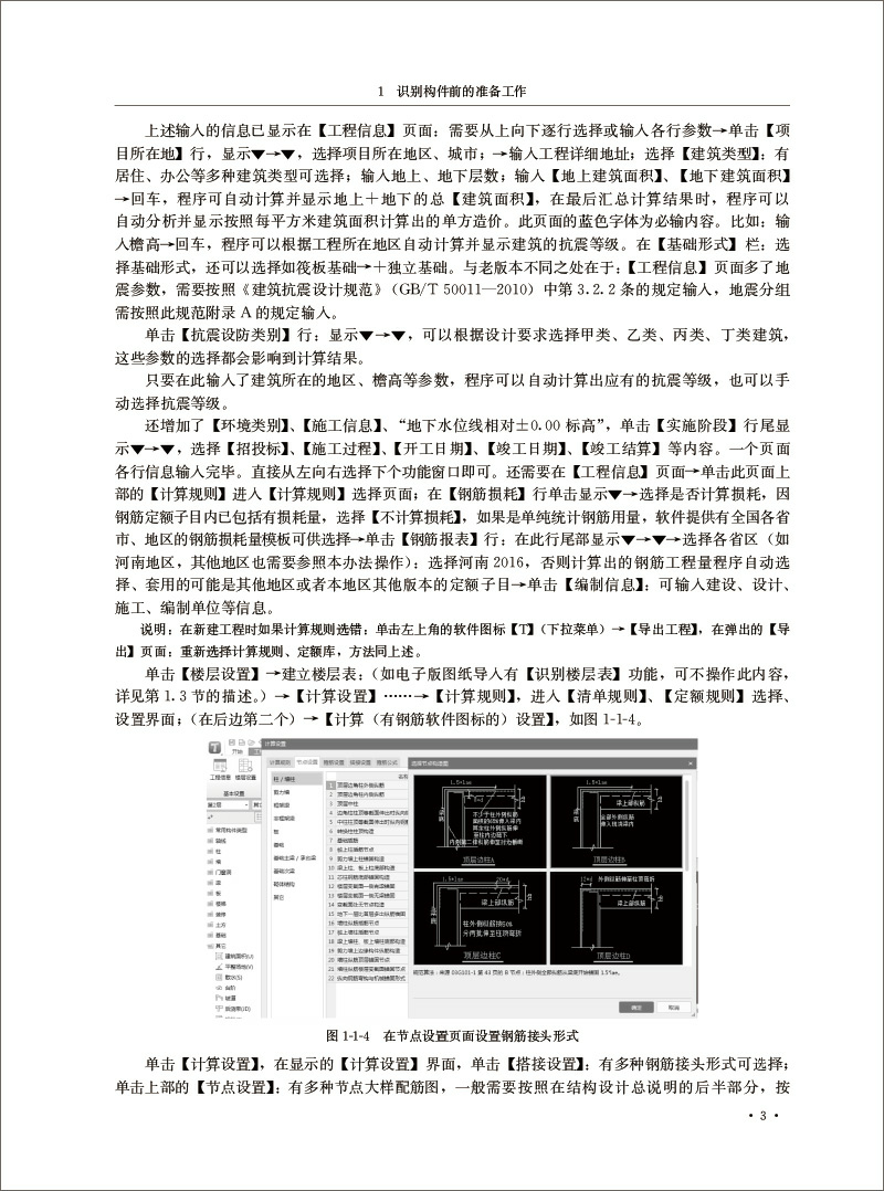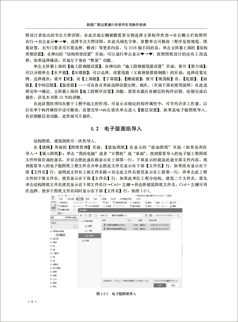 本书的目录框架与之前版本大致相同,但在内容上进行了较大更新。如2.3节增加了 【测量距 离】、【测量面积】、【查看长度】、【测量弧长】、【看属性】等内容;第3章增加了3.6节计算装配式 建筑预制柱;4.3节尾部增加了补画CAD线、【拾取构件】小技巧;第5章增加了5.3节计算装配式 建筑预制剪力墙的工程量、5.4节计算装配式建筑预制剪力墙与后浇柱的工程量;第6章中增加了6.7 节绘制装配式建筑预制梁、6.8节智能布置主肋梁、6.9节梁加腋;第9章中增加了9.10节计算装配 式建筑预制叠合底板、9.11节绘制装配式建筑预制叠合板 (整厚)、9.12节智能布置装配式建筑预制 板缝、9.13节绘制装配式建筑预制楼板和后浇叠合层、9.14节智能布置空心楼盖板、9.15节智能布 置空心楼盖板柱帽;10.1节增加了绘制弧形阳台、放射筋;第16章增加了16.3节计算 【自定义面】 的工程量;新增了第18章设置施工段;第21章增加了计价软件的操作方法。 对于软件使用比较熟练但手算经验不足的读者,本书还设置了手算技巧用于对量的章节,读者可 以在识别或绘制构件图元后,使用软件的 【工程量】→ 【汇总选中图元】→ 【查看工程量】→在 【查 看构件图元工程量】页面,对照软件计算的工程量做手算对比。 本书可作为高等院校专业教科书或自学教材使用。读者按照本书掌握基本操作方法后,如遇版本更新会很容易适应。