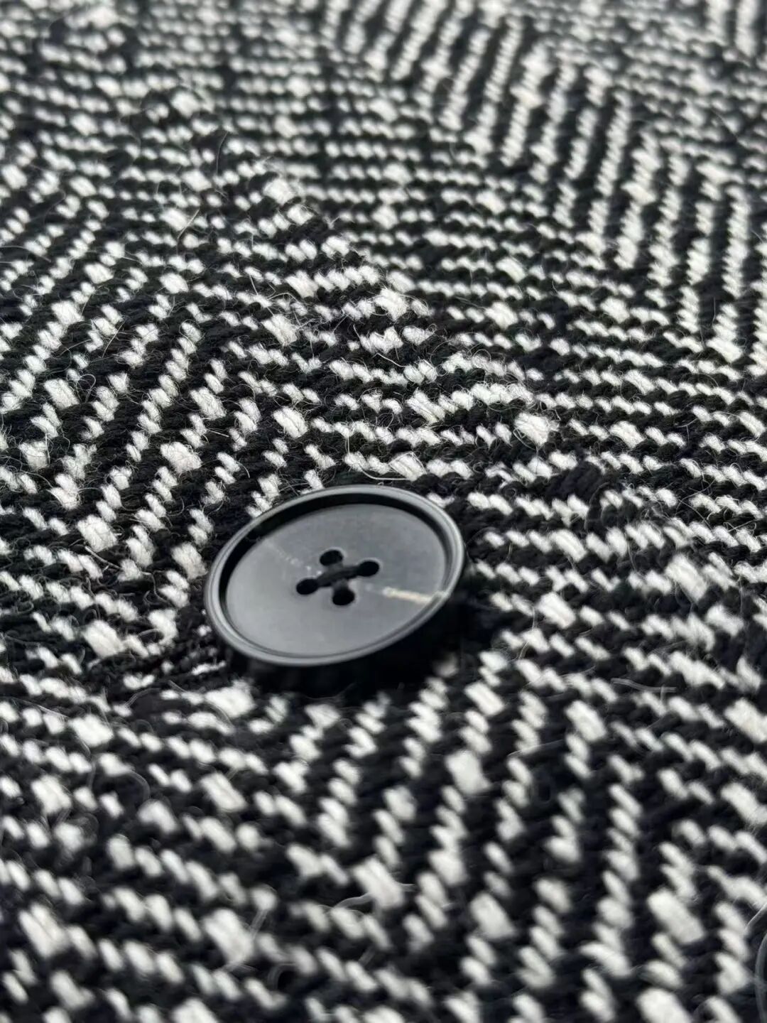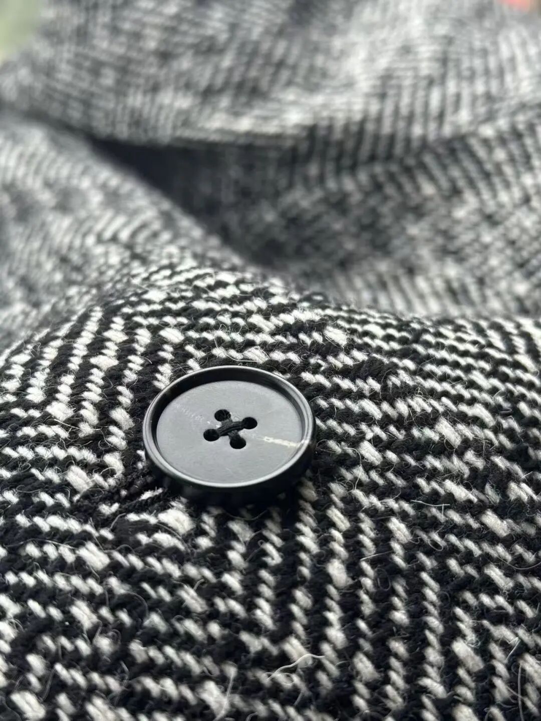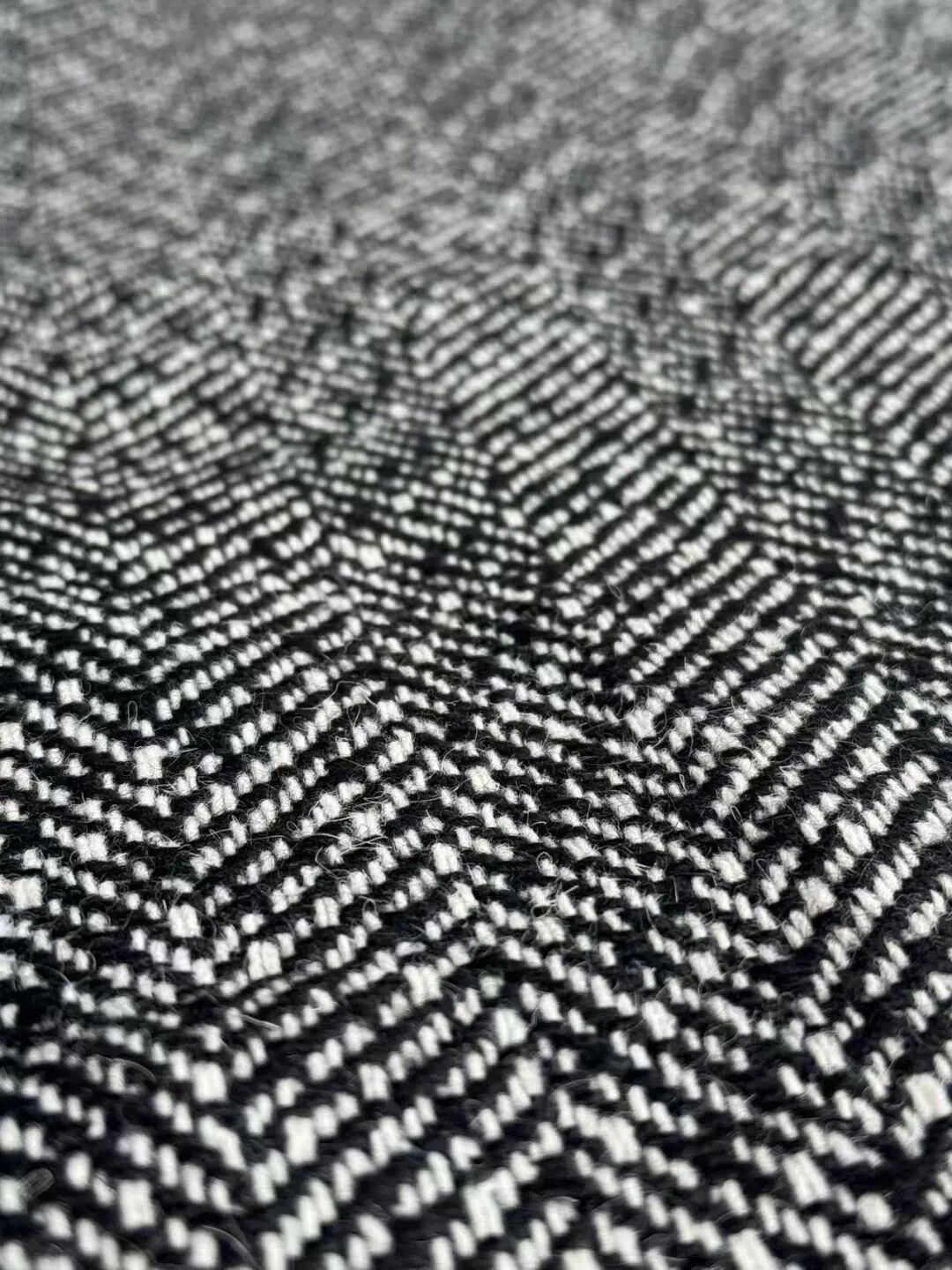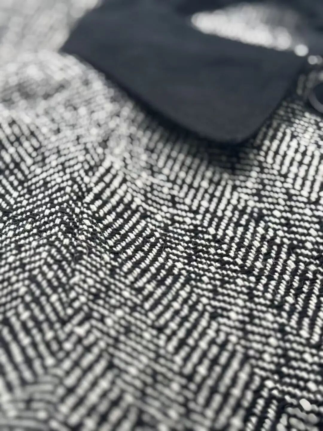 注意观察:咱们客供面料的人字纹,黑白交叉的白色,是带灰度的,接近灰米白,不是直愣愣的白,这样的配色才高级,视觉感受是柔和优雅的,而市面通货用直愣愣的白和黑色搭配,一下子档次就掉下来了。