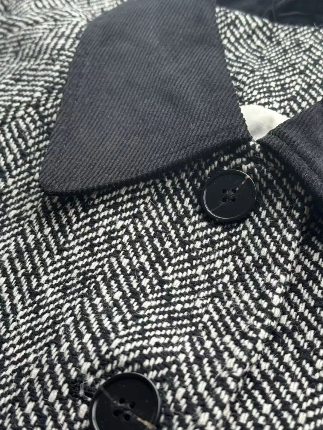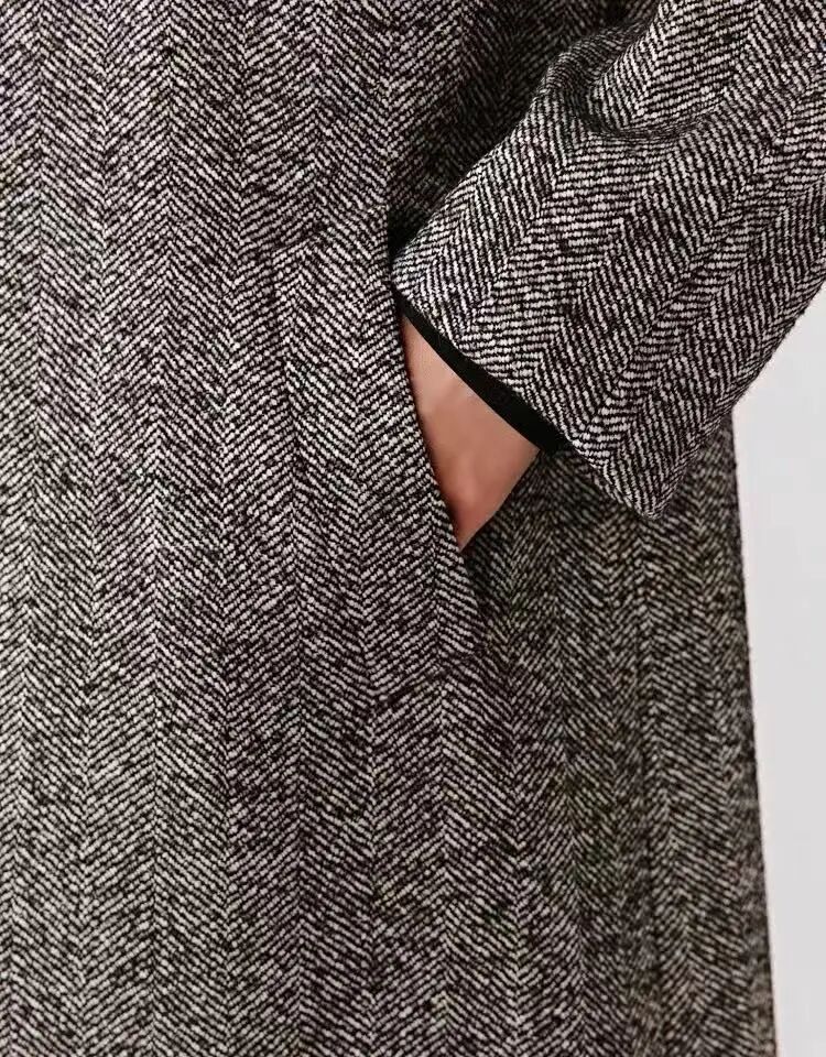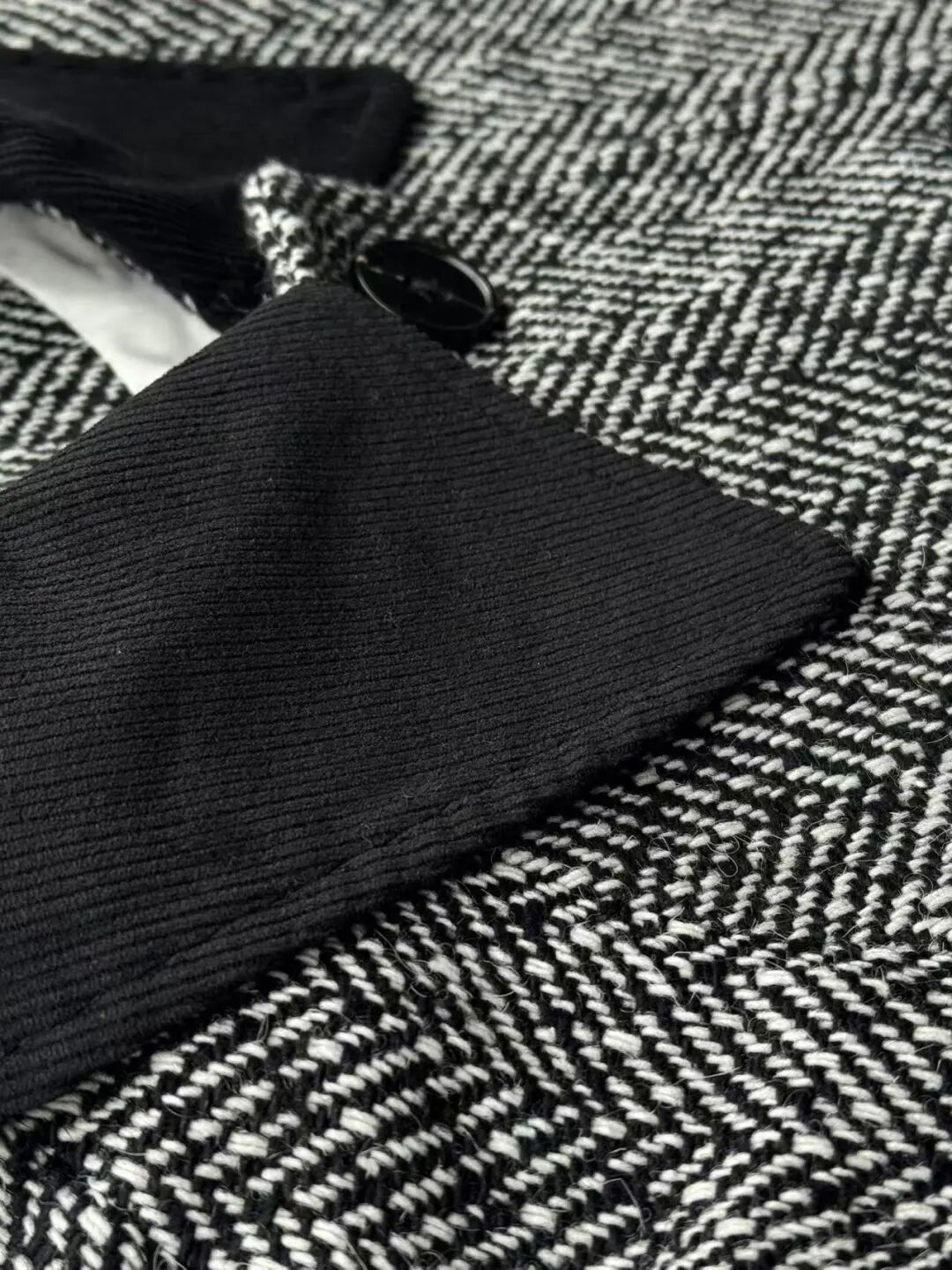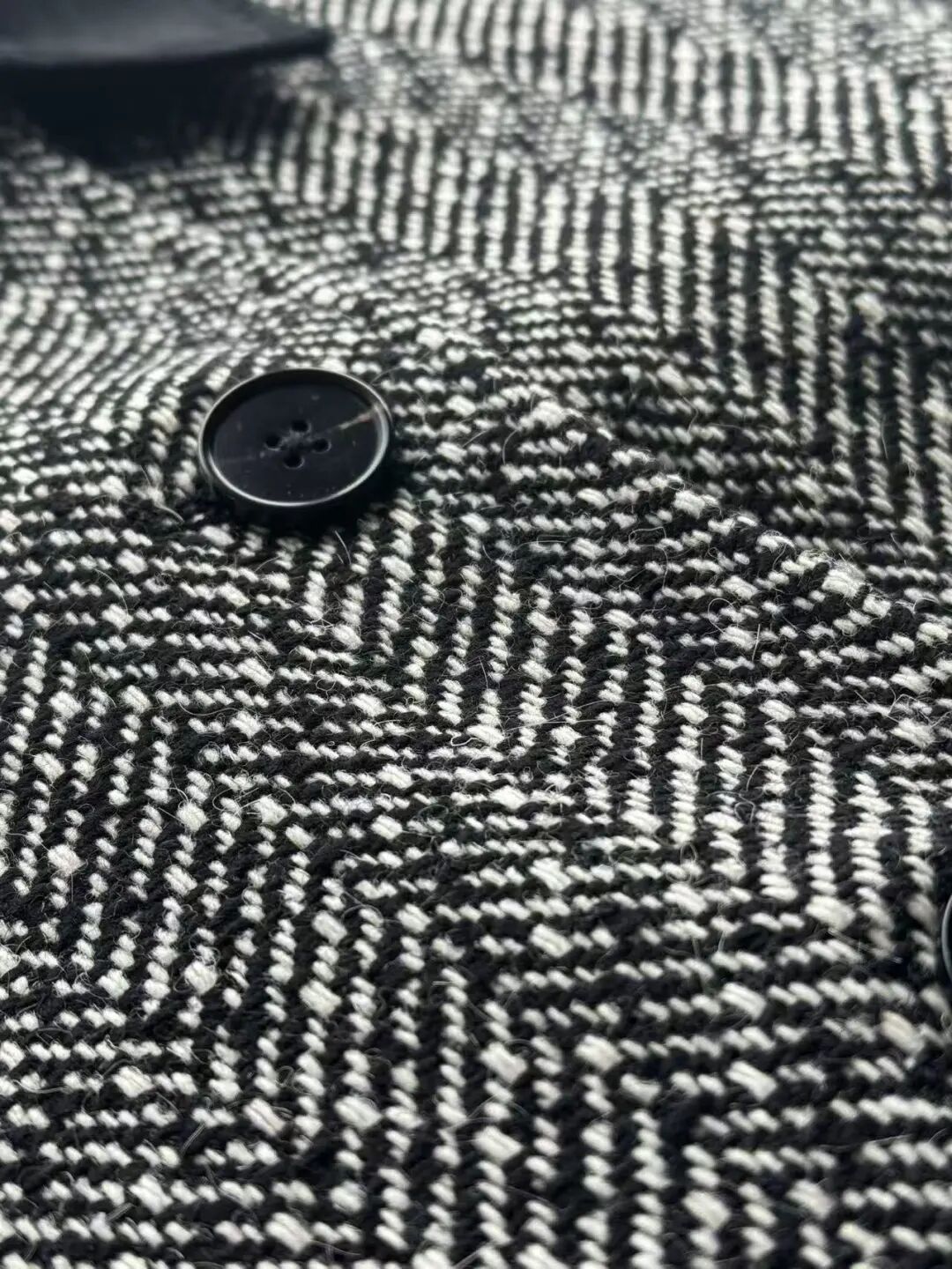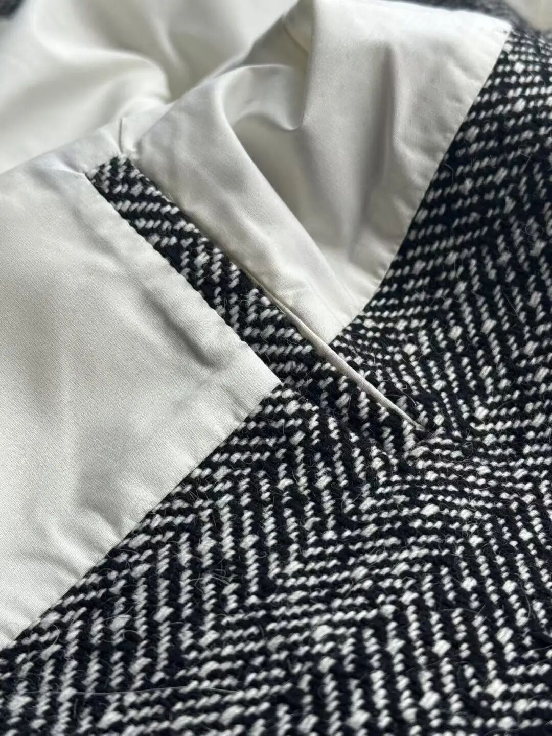 注意观察:咱们客供面料的人字纹,黑白交叉的白色,是带灰度的,接近灰米白,不是直愣愣的白,这样的配色才高级,视觉感受是柔和优雅的,而市面通货用直愣愣的白和黑色搭配,一下子档次就掉下来了。