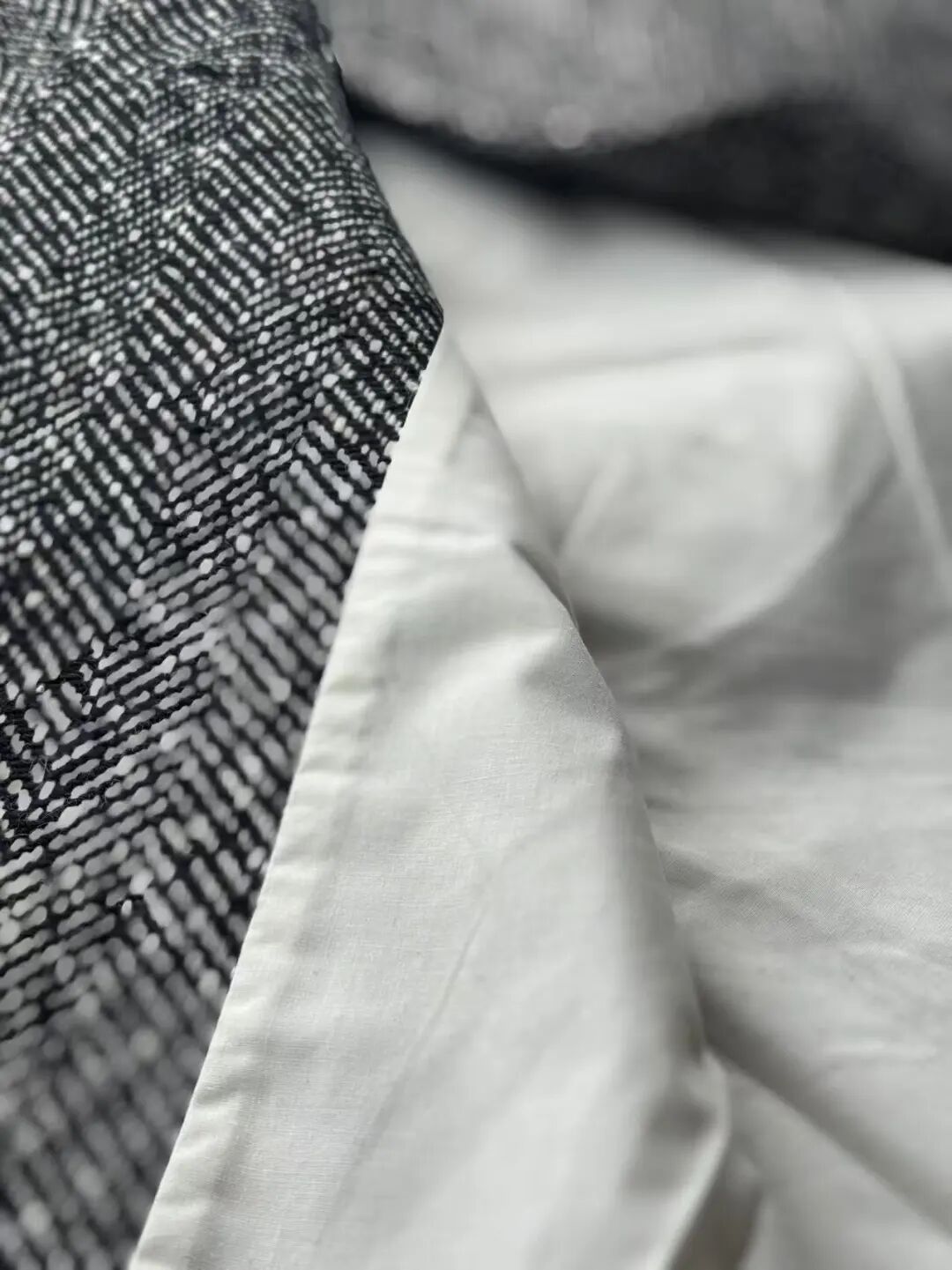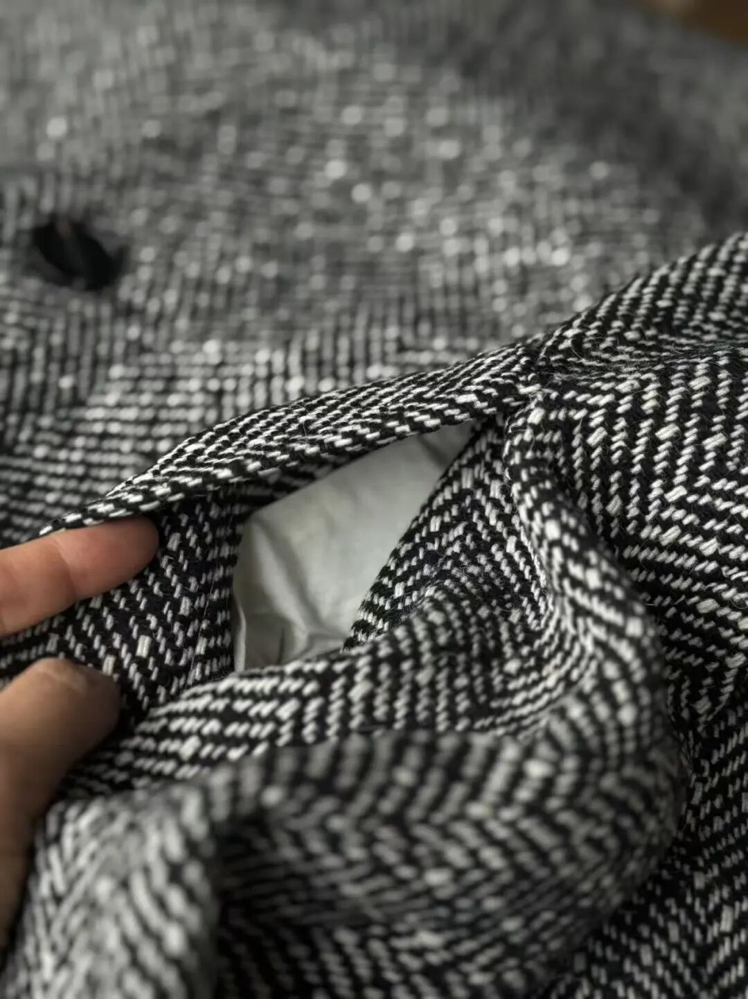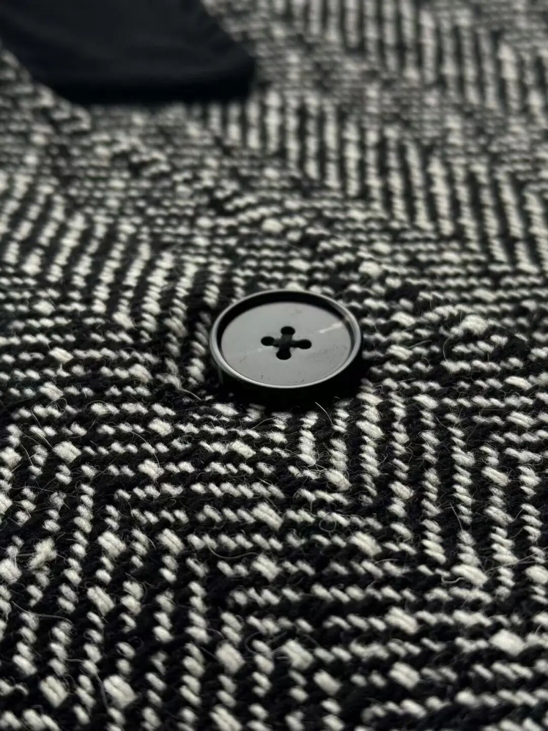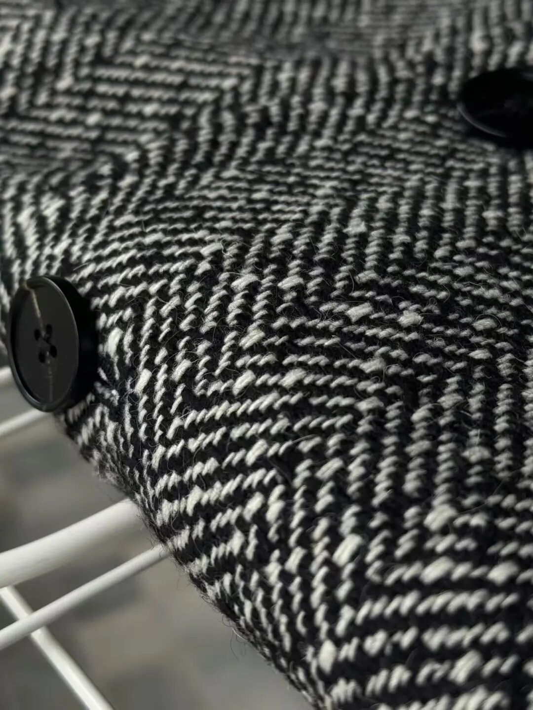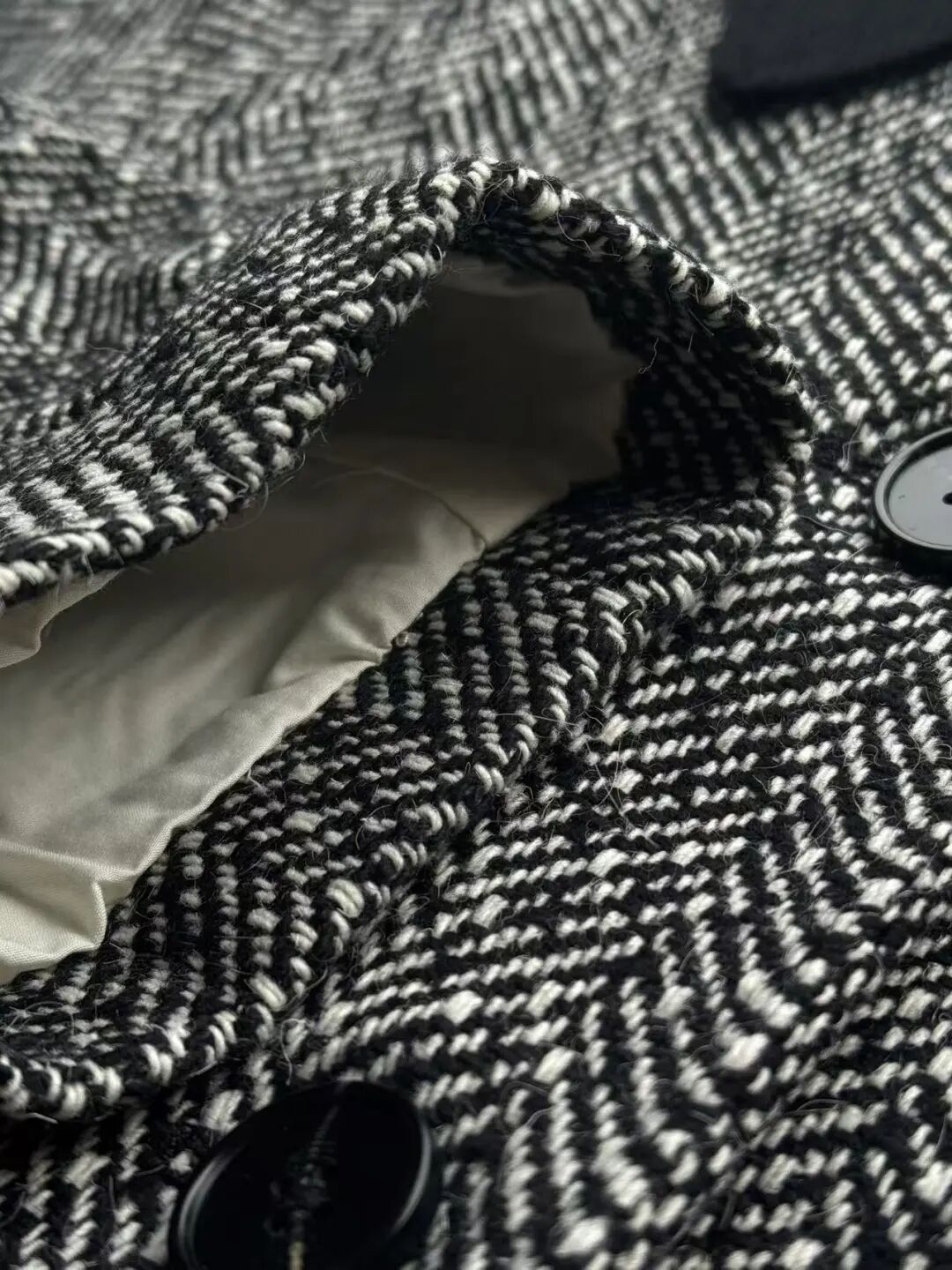 注意观察:咱们客供面料的人字纹,黑白交叉的白色,是带灰度的,接近灰米白,不是直愣愣的白,这样的配色才高级,视觉感受是柔和优雅的,而市面通货用直愣愣的白和黑色搭配,一下子档次就掉下来了。