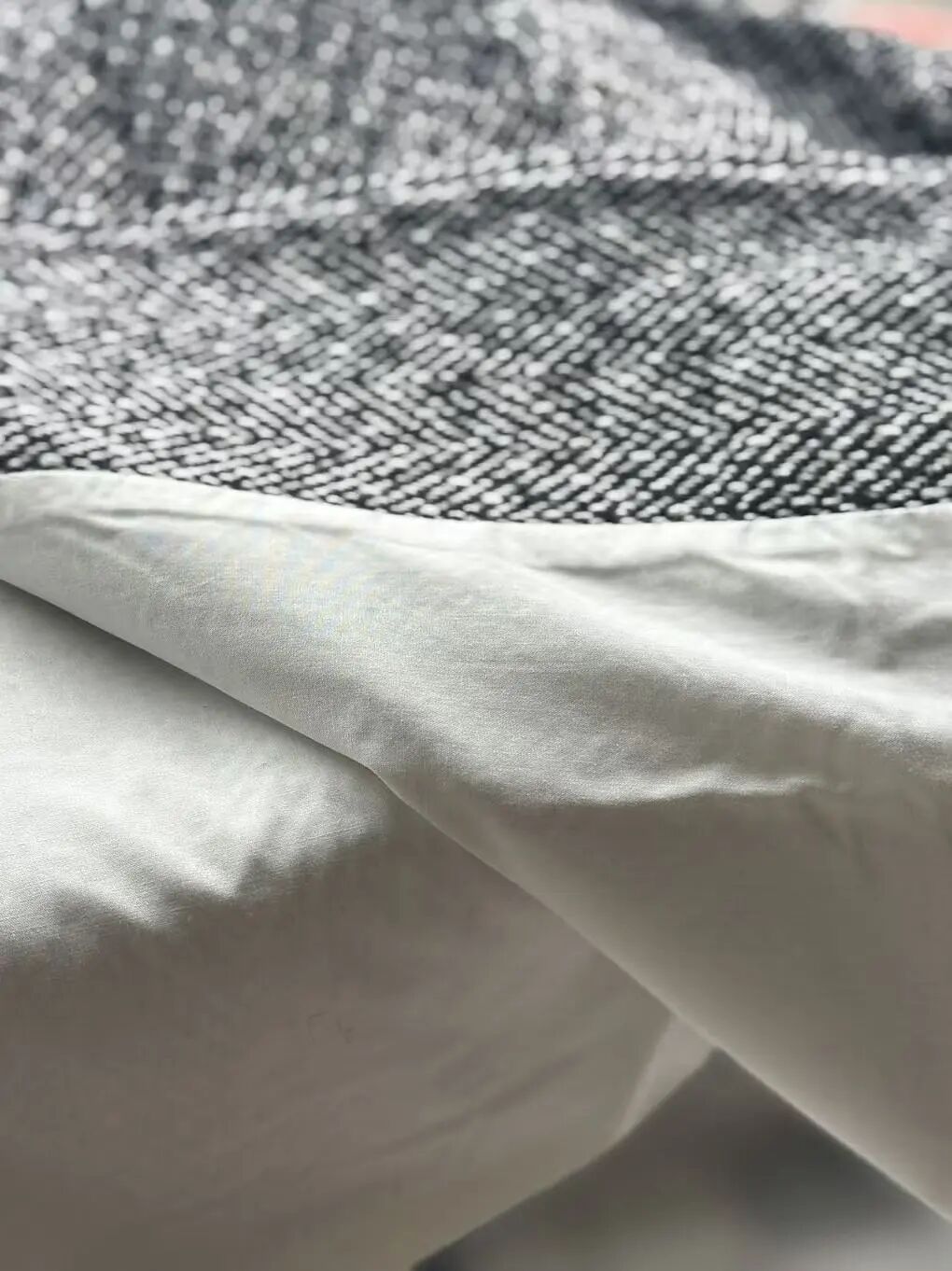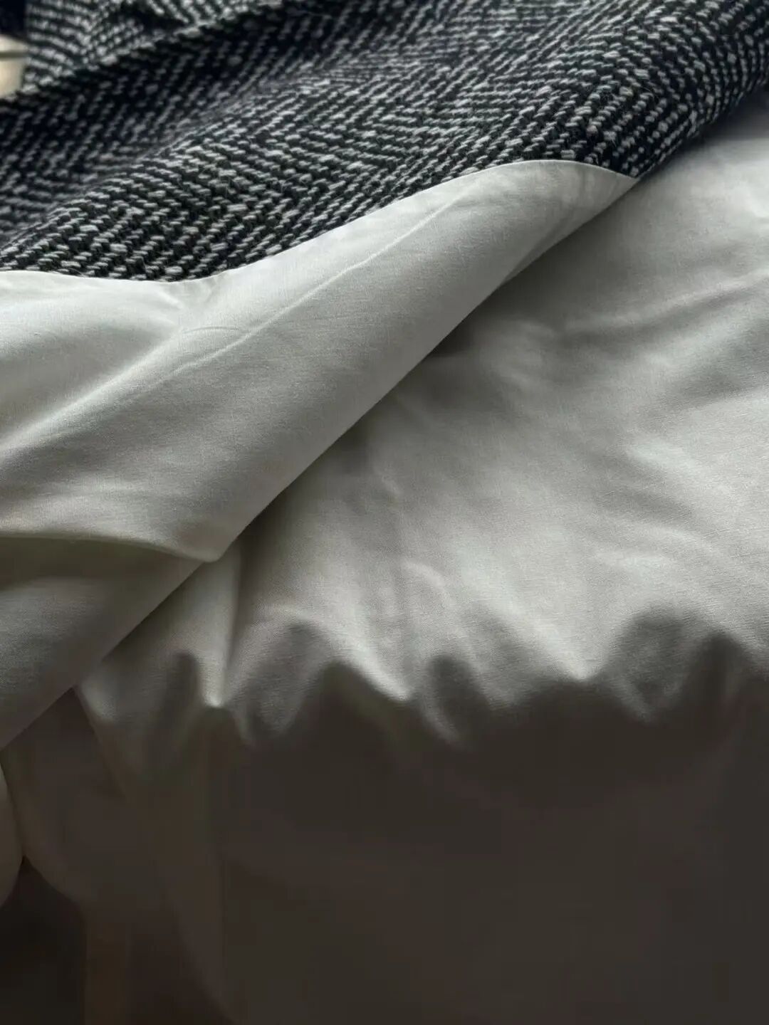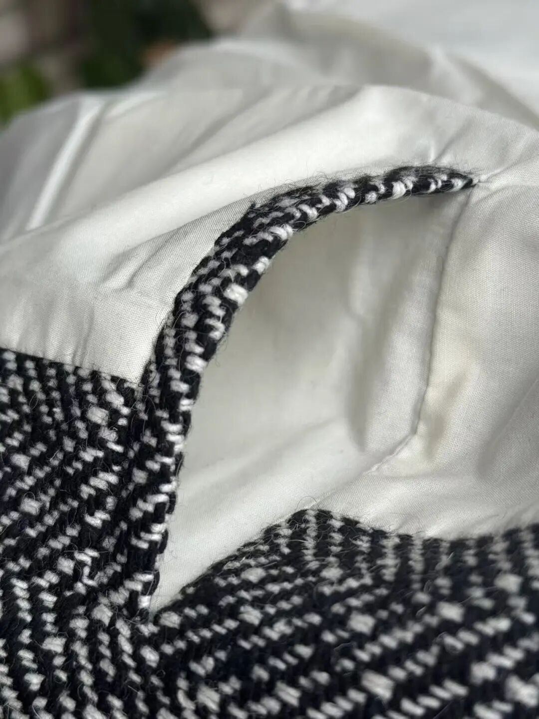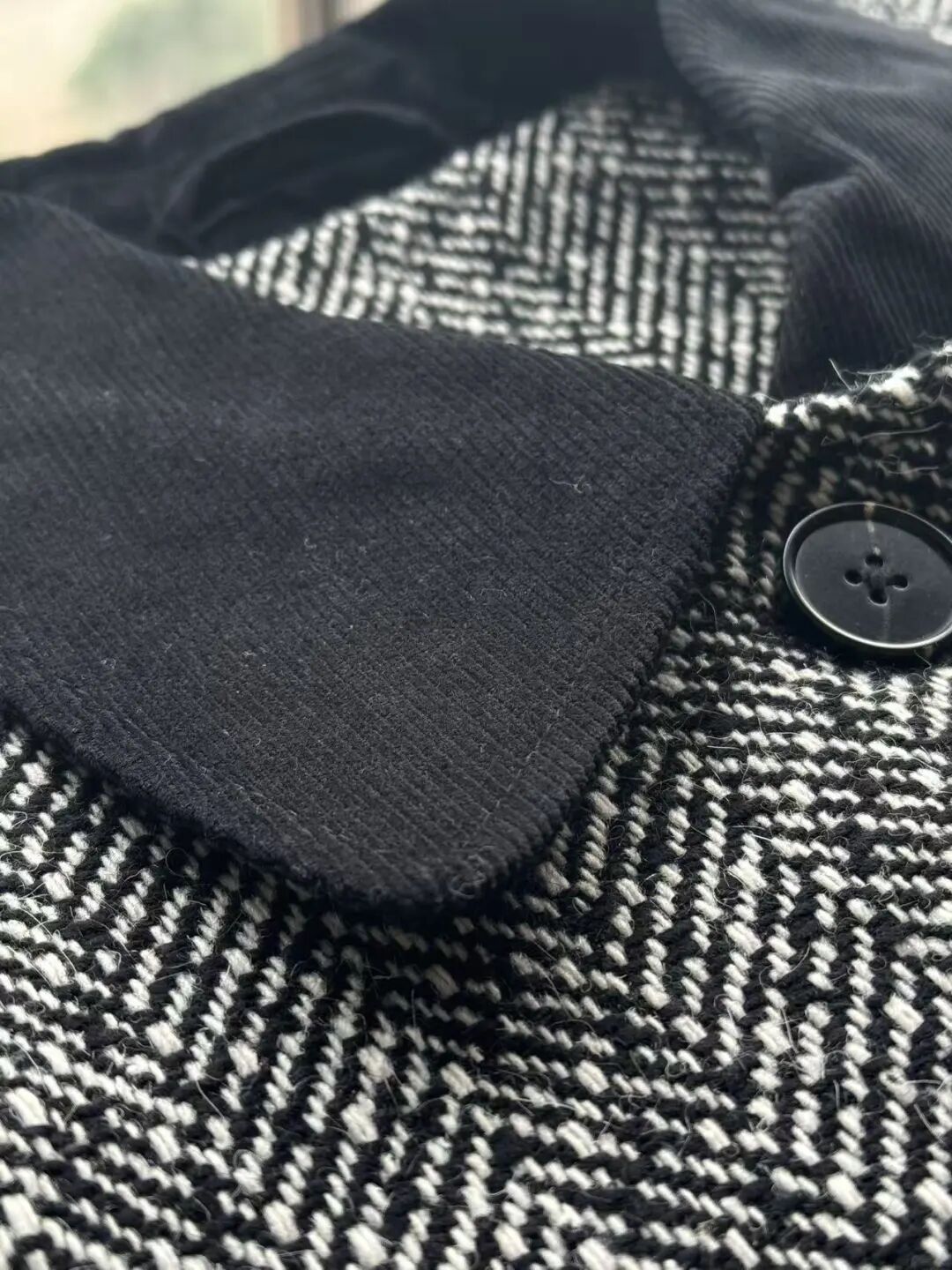 注意观察:咱们客供面料的人字纹,黑白交叉的白色,是带灰度的,接近灰米白,不是直愣愣的白,这样的配色才高级,视觉感受是柔和优雅的,而市面通货用直愣愣的白和黑色搭配,一下子档次就掉下来了。