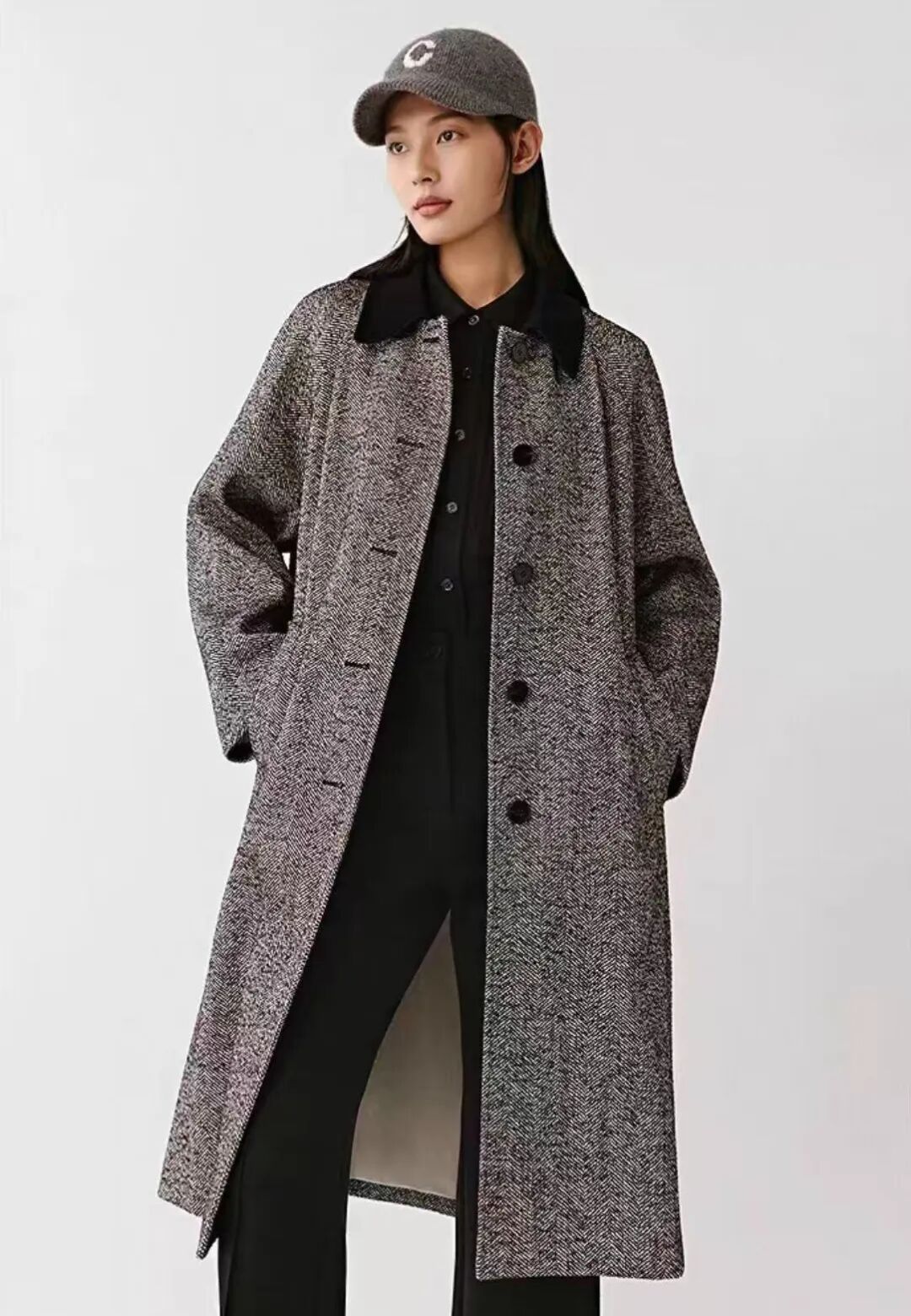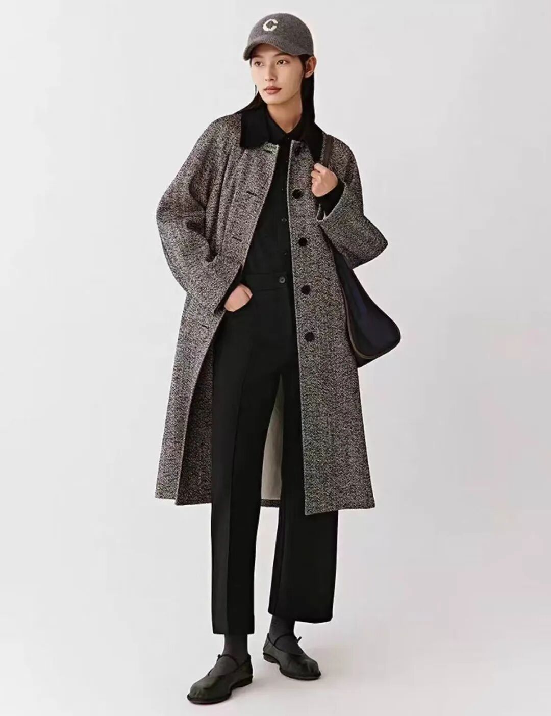 廓形设计为插肩袖的茧型大衣,不对身体进行紧密包裹,而是保留一丝空气感,看似宽松,其实有着巧妙的遮肉效果,中央微膨的造型能够自然修饰腹部与臀部线条,柔和曲线成为修饰身材的绝佳选择。