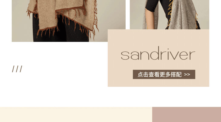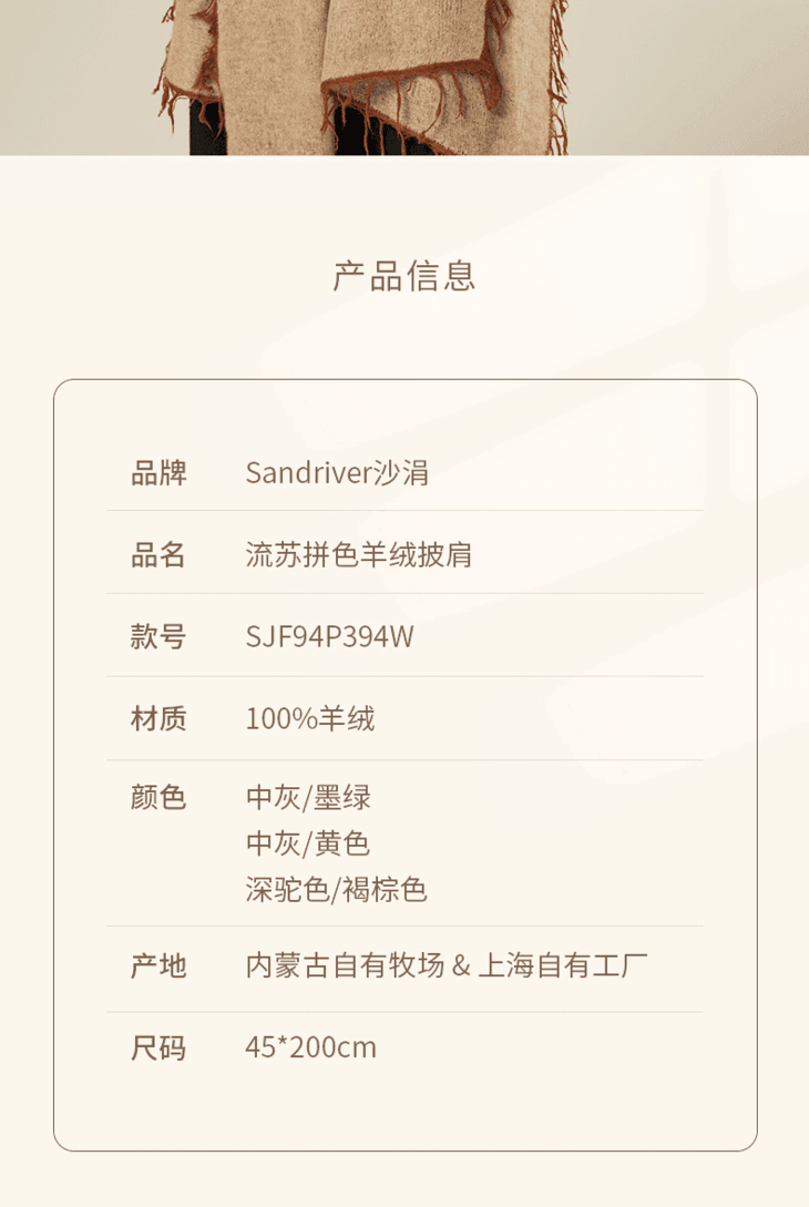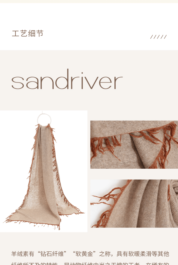 历年在巴黎时装周亮相,享誉世界的艺术羊绒品牌[Sandriver 沙涓]由羊绒布道者郭秀玲女士创立。阿拉善自有牧场纯种羔羊绒,日本国宝设计师小筱顺子,上海自有基地精工细作。承载羊绒情怀,坚持匠人品质。