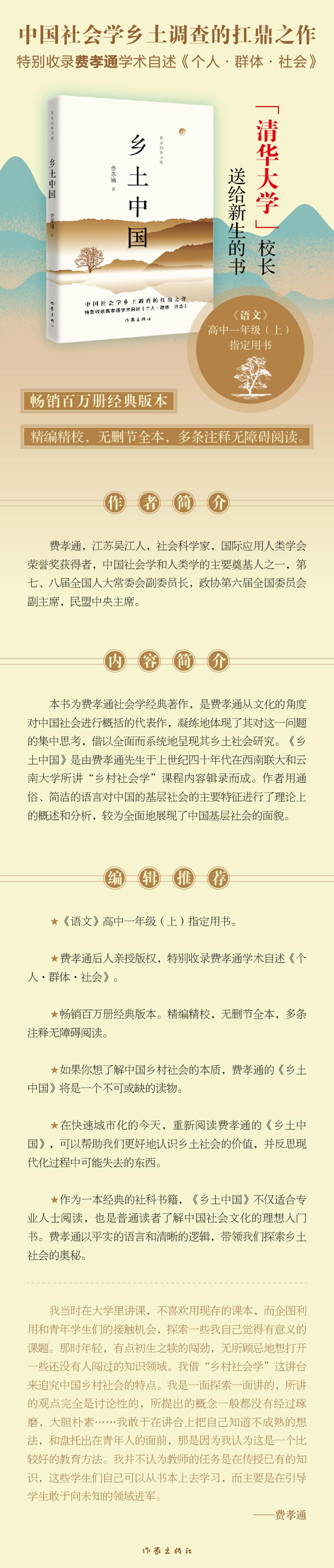 本书为费孝通社会学经典著作,是费孝通从文化的角度对中国社会进行概括的代表作,凝练地体现了其对这一问题的集中思考,借以全面而系统地呈现其乡土社会研究。《乡土中国》是由费孝通先生于上世纪四十年代在西南联大和云南大学所讲“乡村社会学”课程内容辑录而成。作者用通俗、简洁的语言对中国的基层社会的主要特征进行了理论上的概述和分析,较为全面地展现了中国基层社会的面貌。