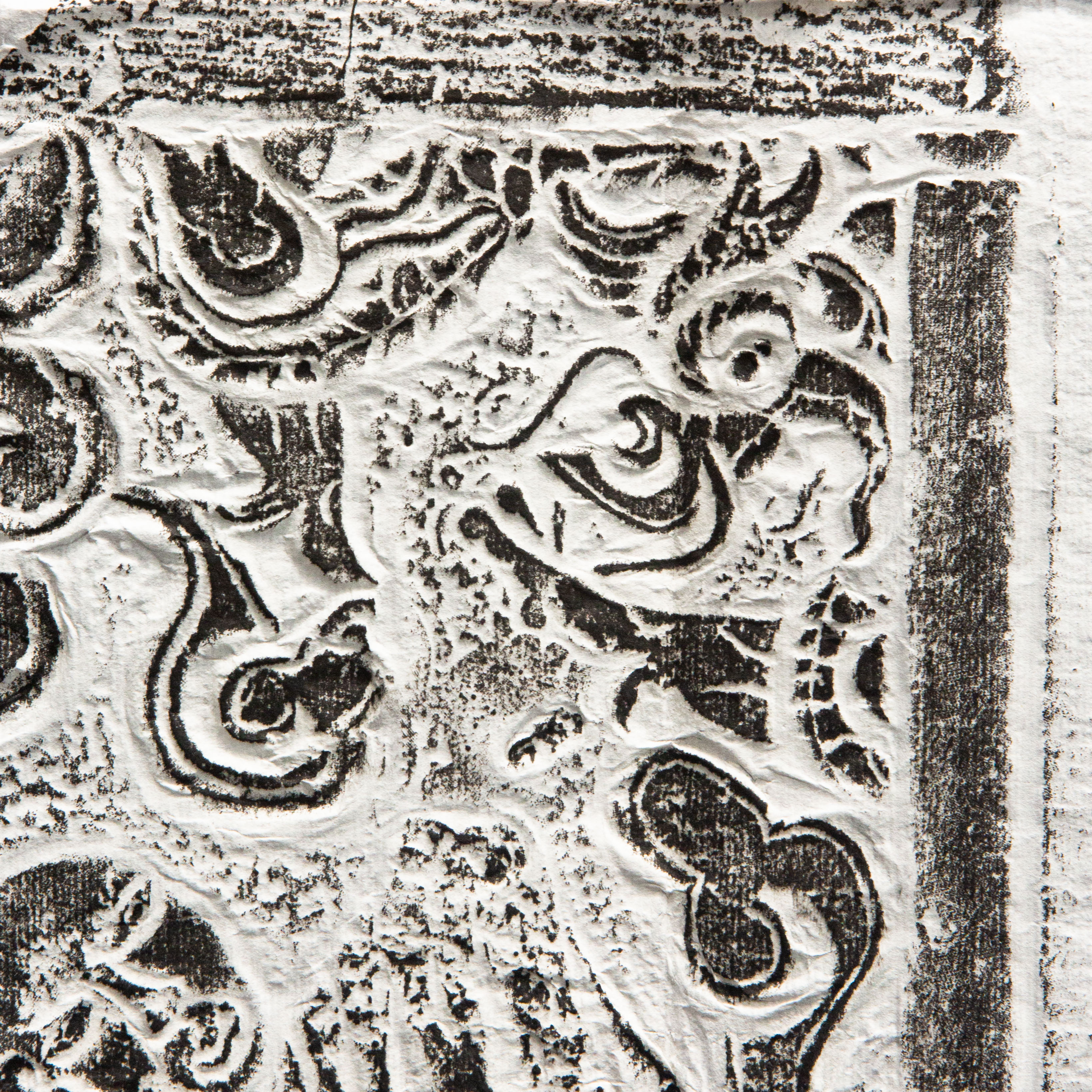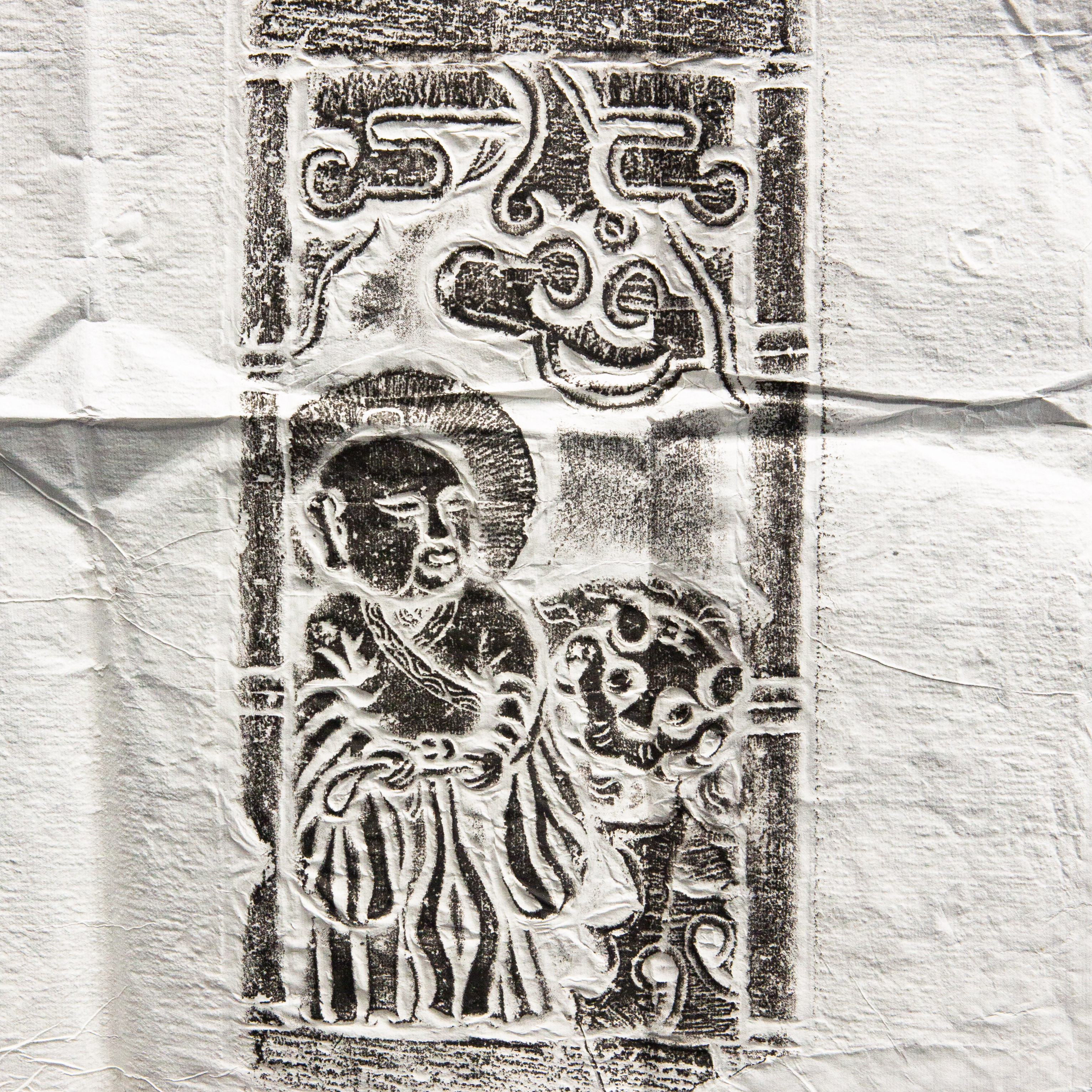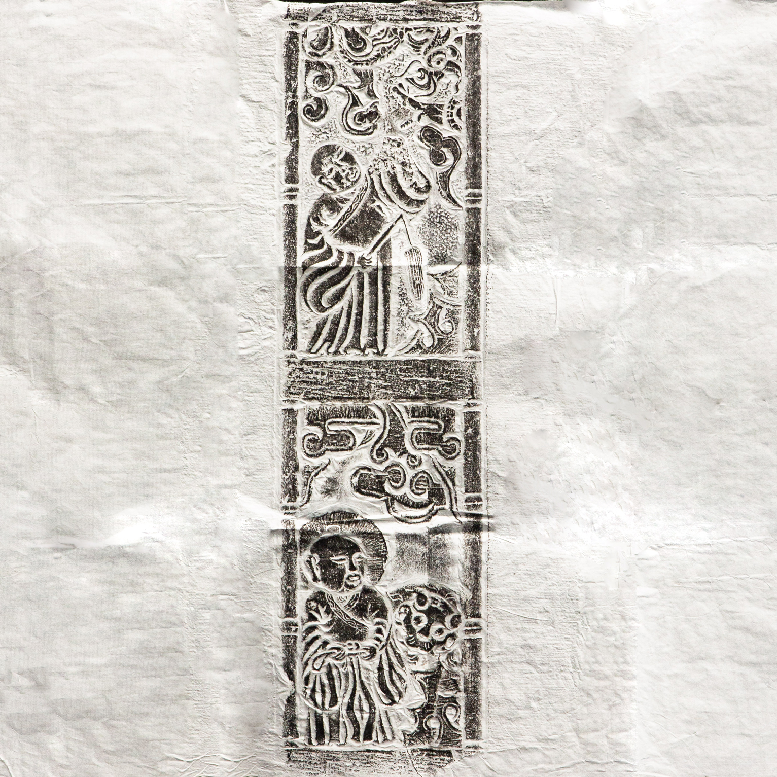 明代罗汉刻石拓片,原石原拓,刻画内容为降龙和伏虎两位罗汉,画面生动,气息古朴沉着,是难得之佳品。