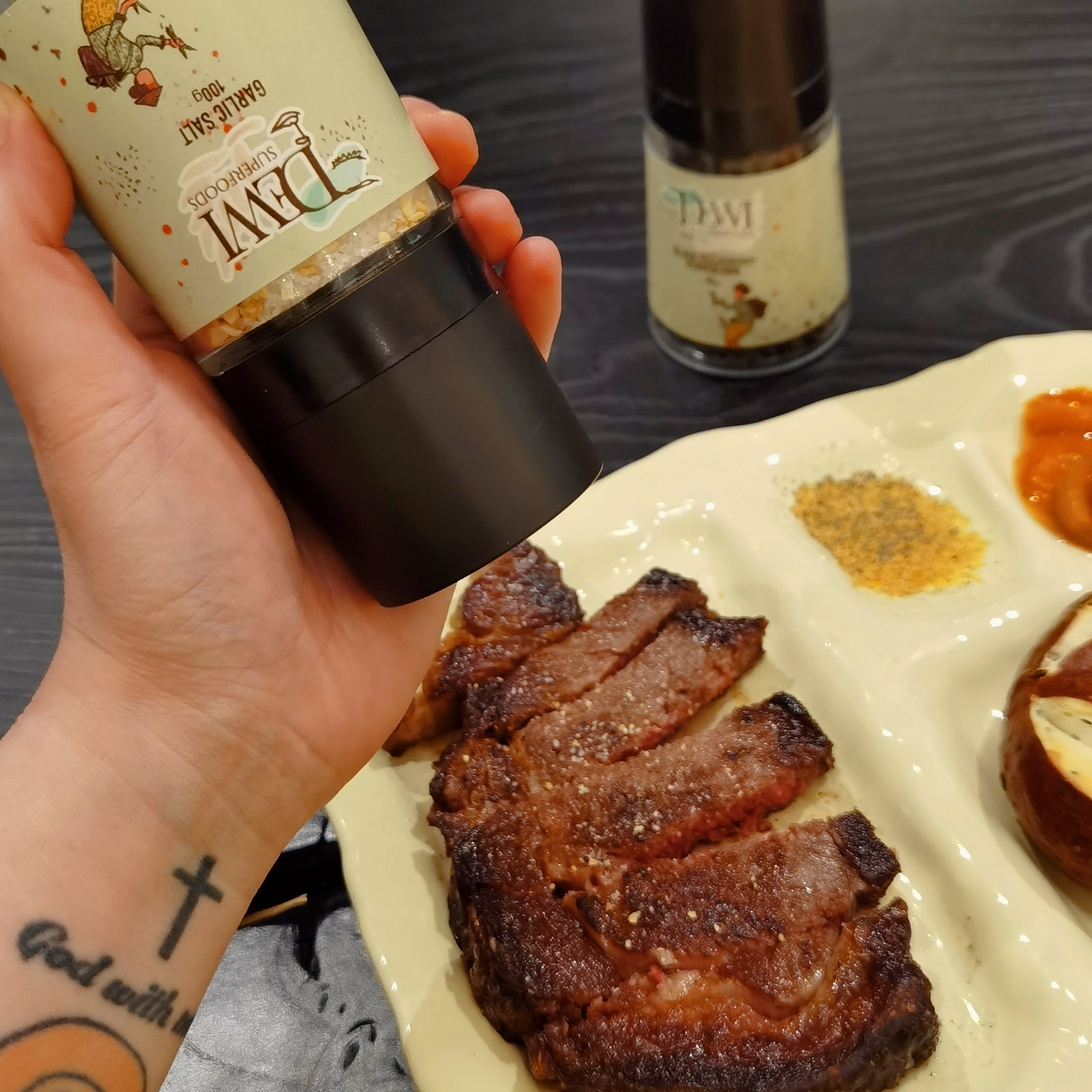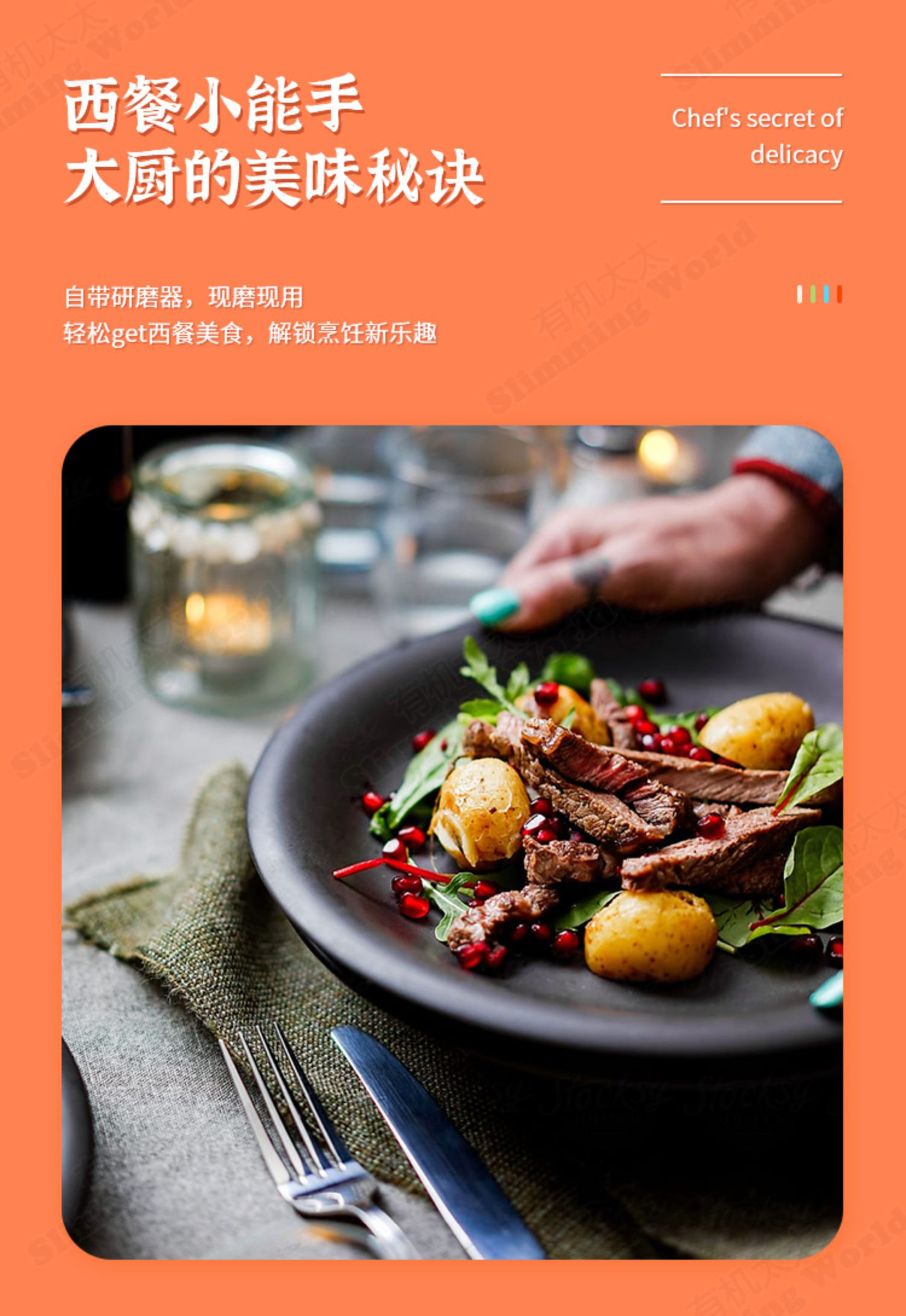 我坠常用到的是蒜和蒜盐,还有黑胡椒和芫荽籽粉,主要是吃牛排时撒上,也能用来拌沙拉,口感可比酱汁高级多咯!热量也低,减脂很需要!我还试了用蒜盐给鸡按摩入味煮了高压锅焗鸡,也是超美味!所谓差生文具多,如果手艺一般,就多来些调料,让简简单单的菜肴变幻出与众不同的异域情调,而且不管中餐还是西餐,都是能用得上的,中西合璧,完美!