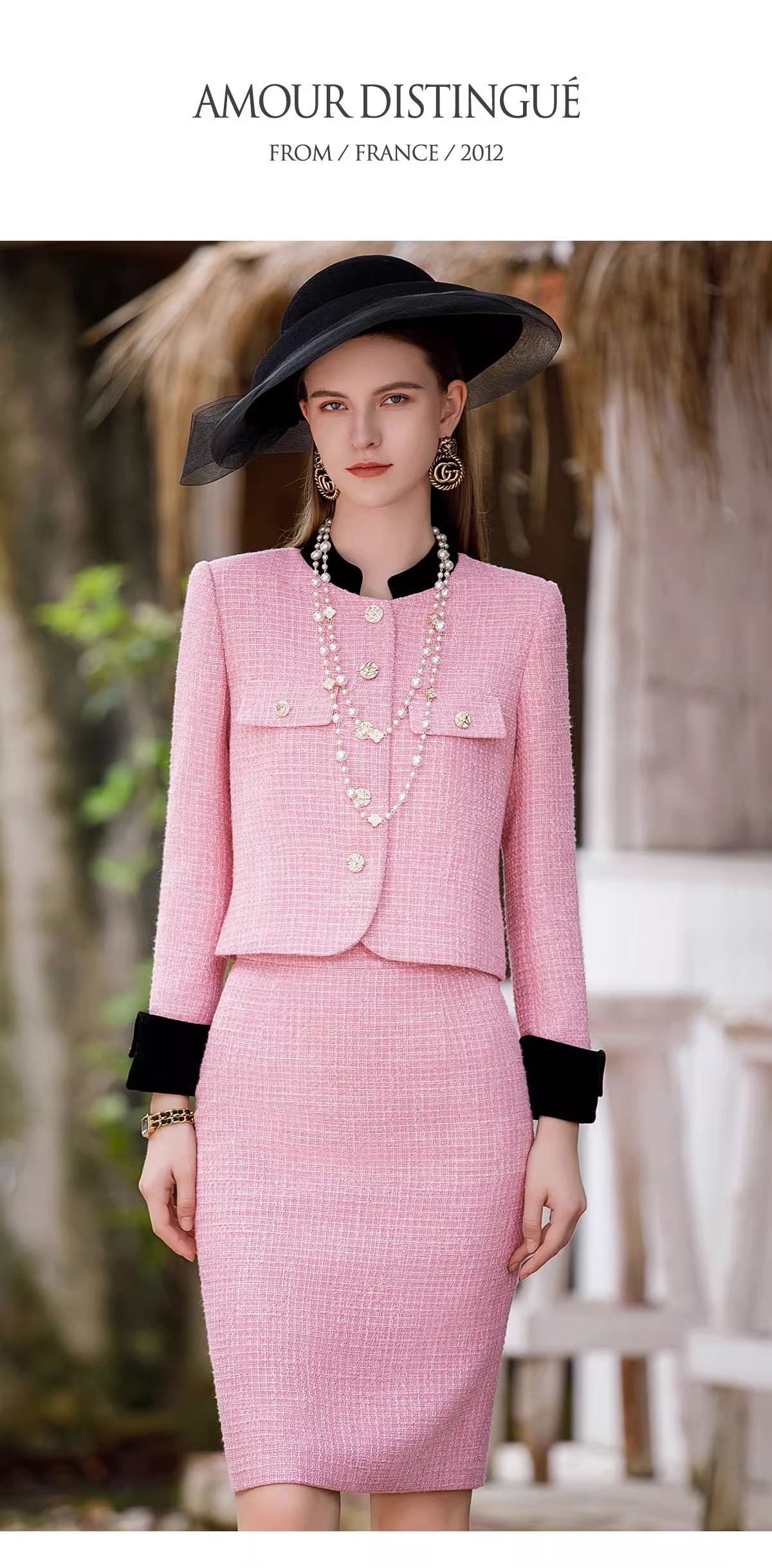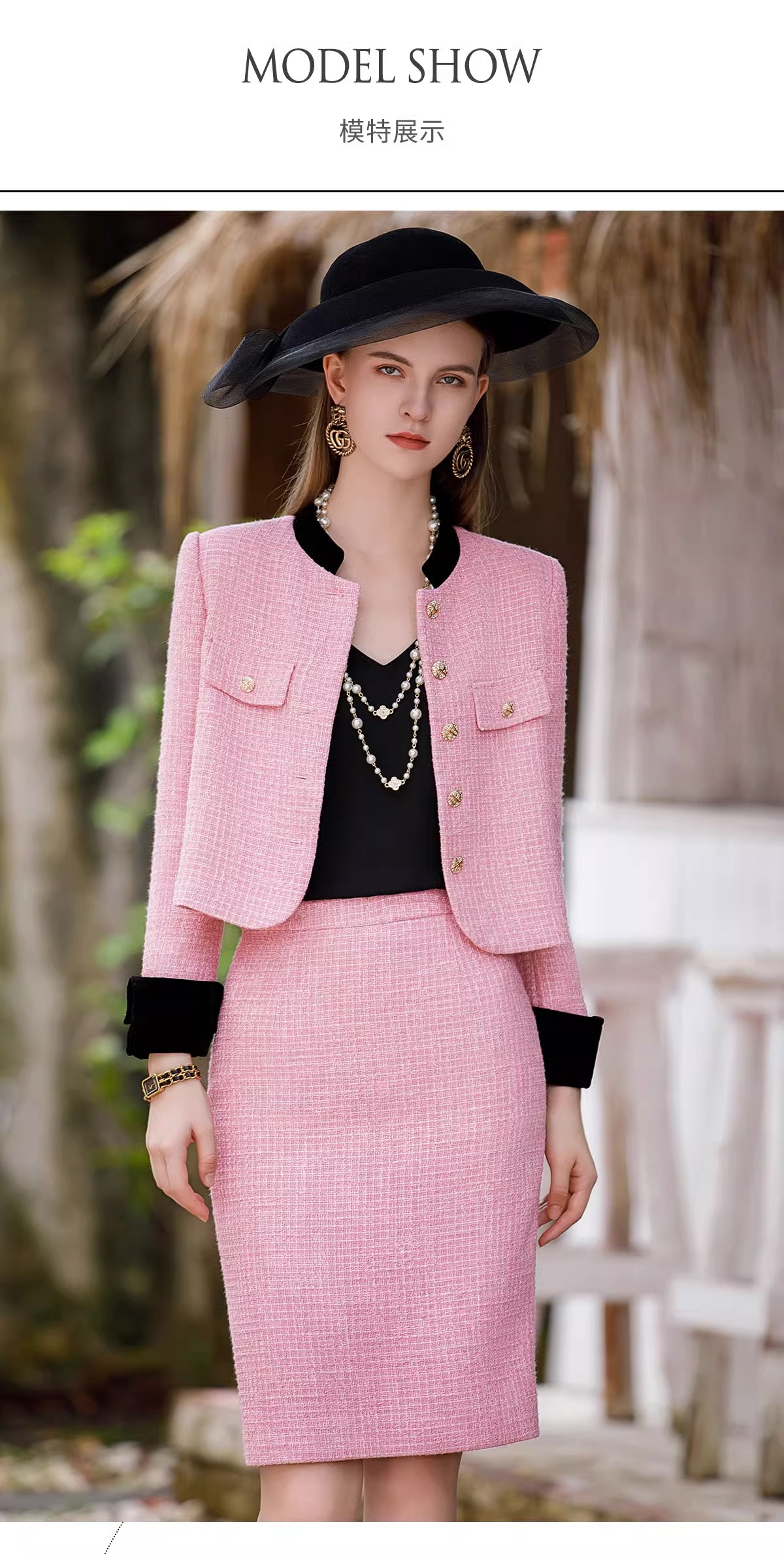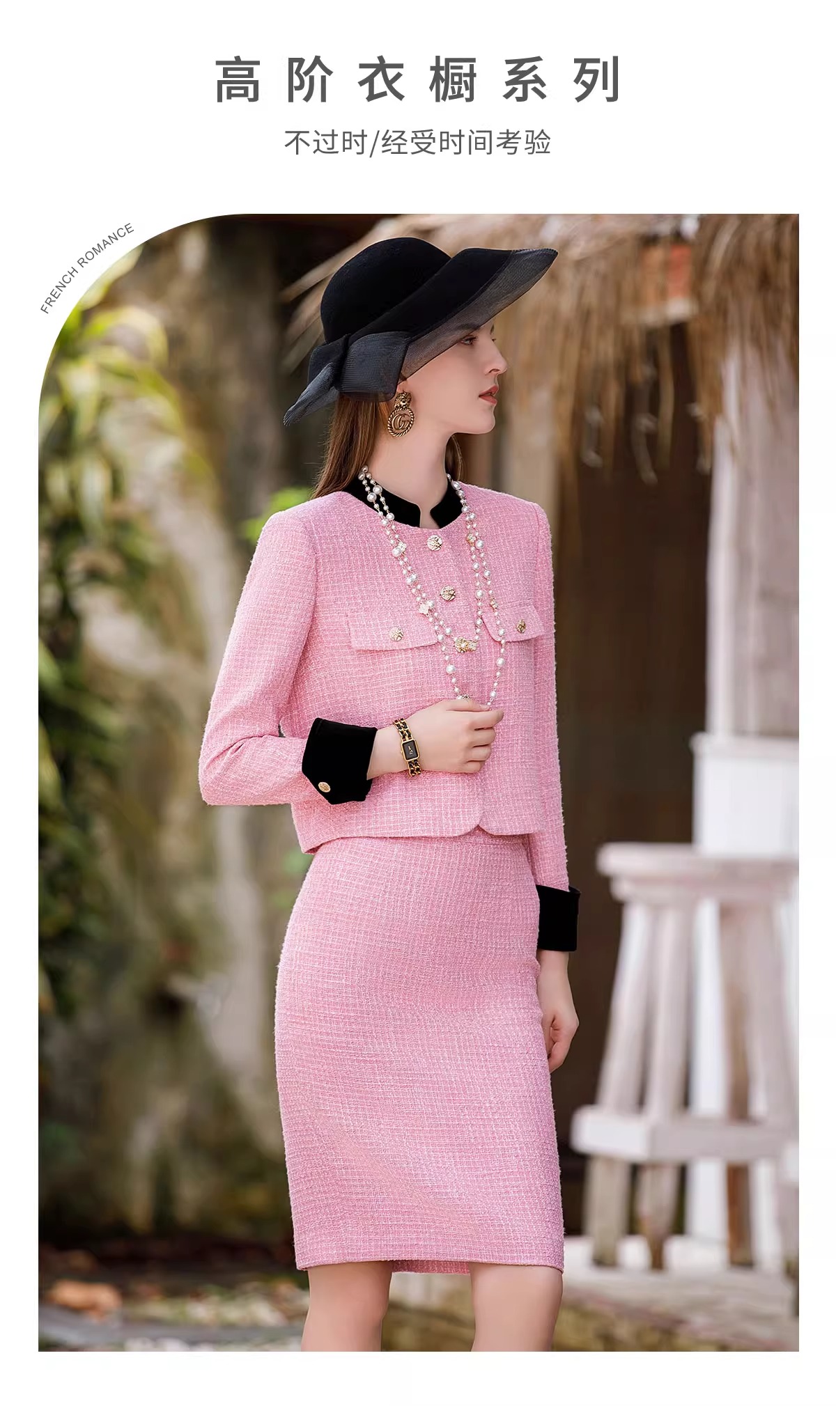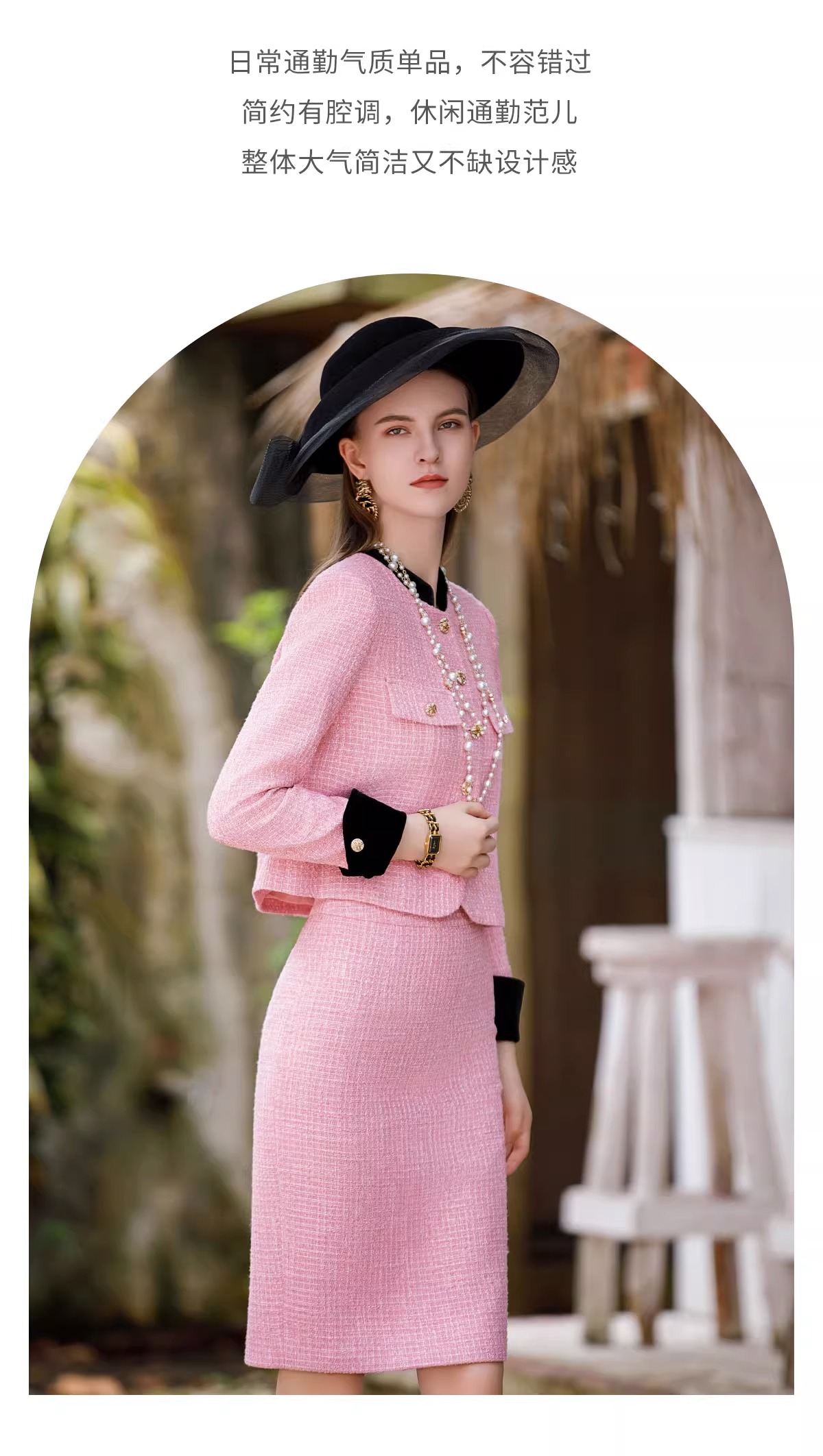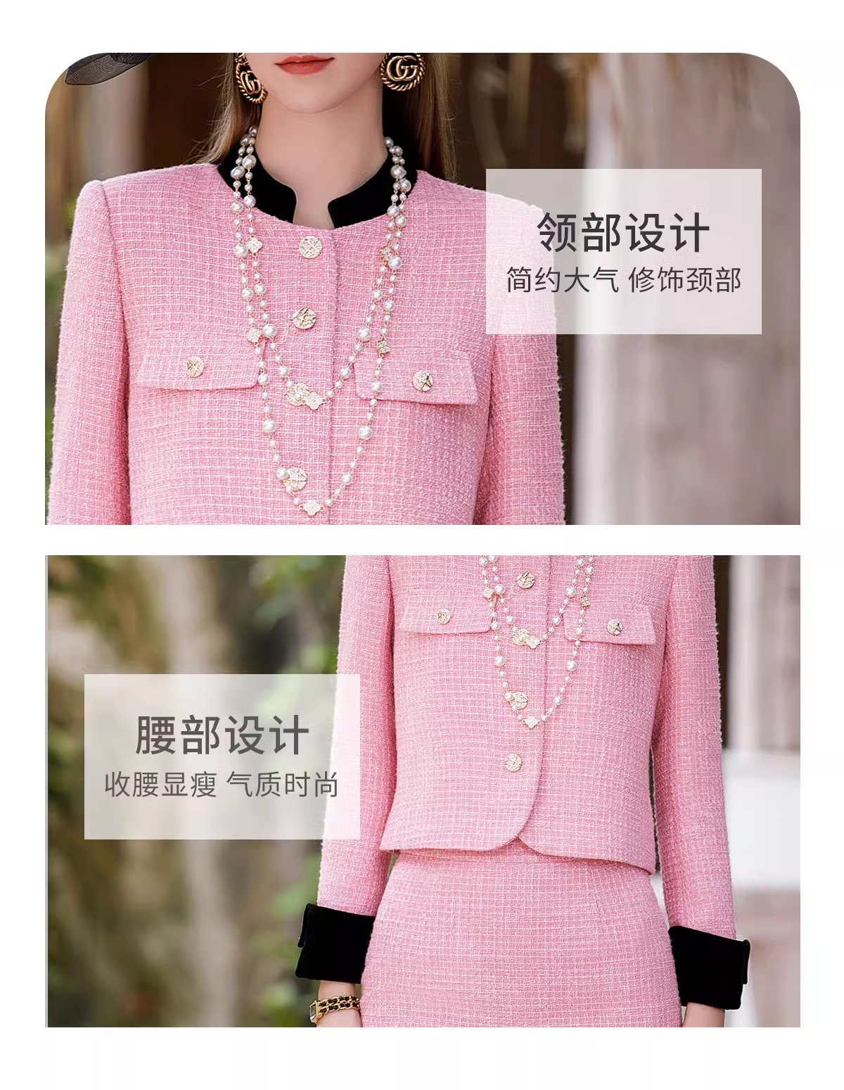 小香风套装女2023秋装新款西装外套粉色粗花呢两件套名媛正装裙