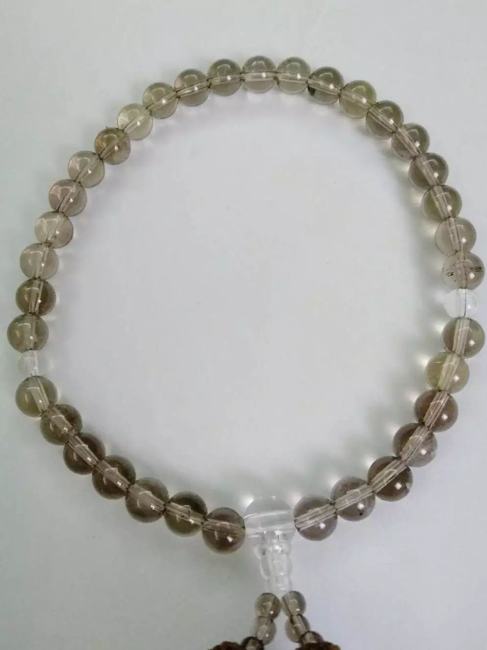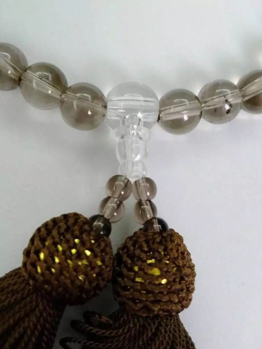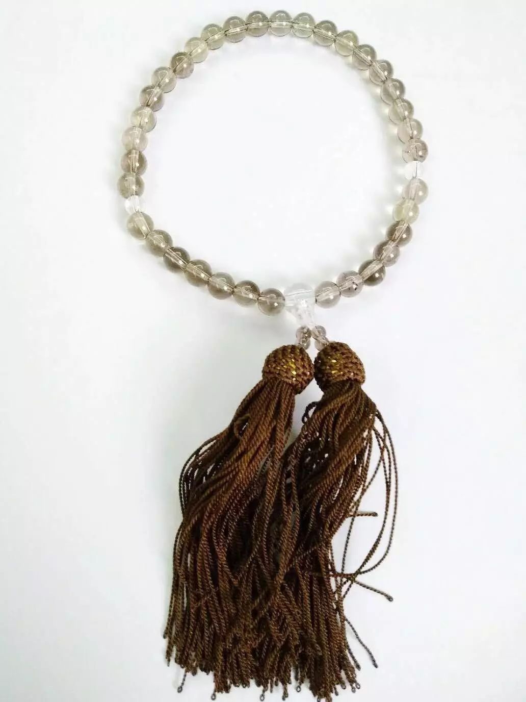 这是一串以俗称茶晶的淡褐色天然水晶串成的手持念珠,是念珠风格成串,配有较大之白水晶三通与佛塔,以及精致的流苏,茶晶圆珠纯净无瑕,整体风格高雅细腻。