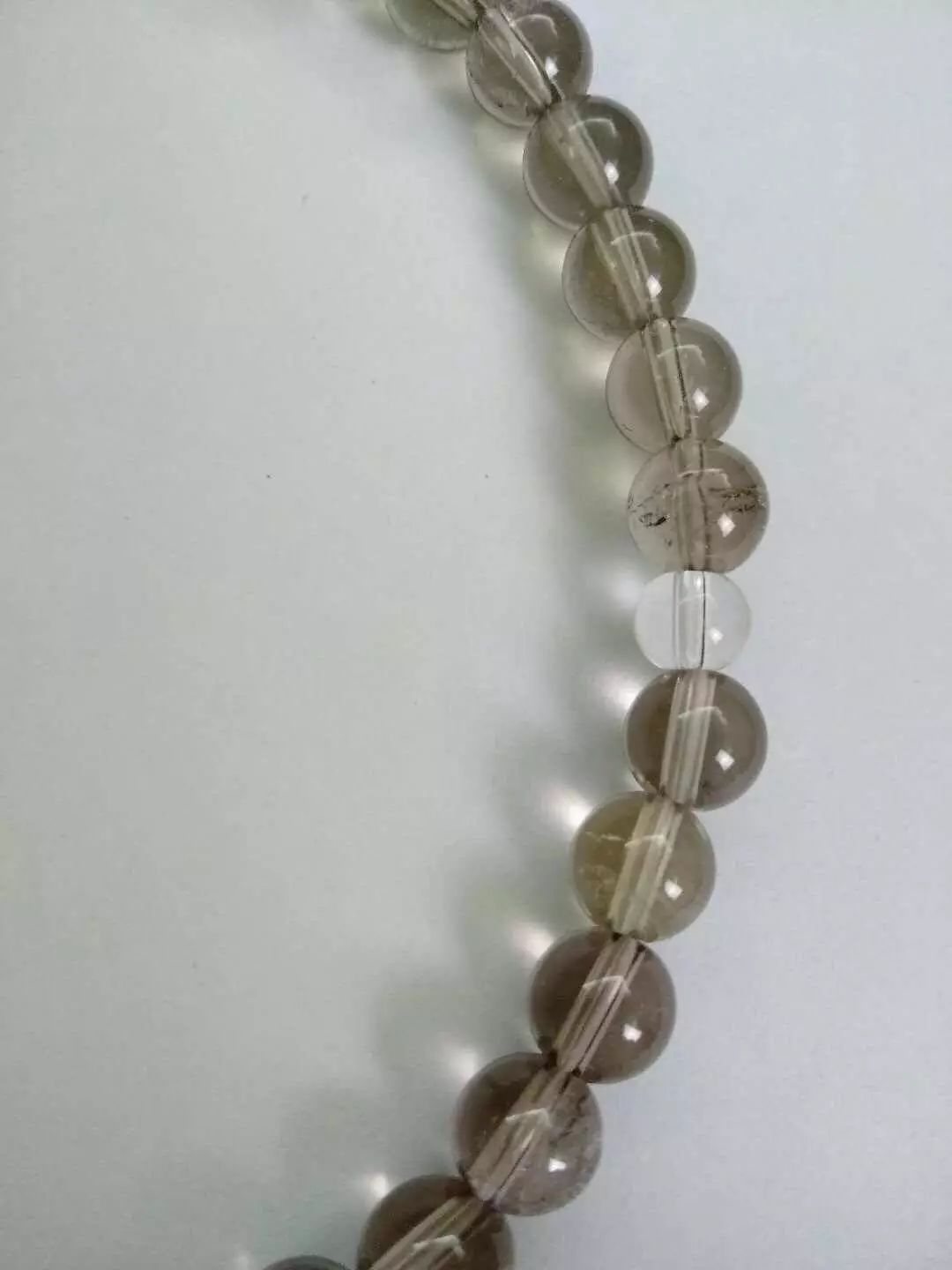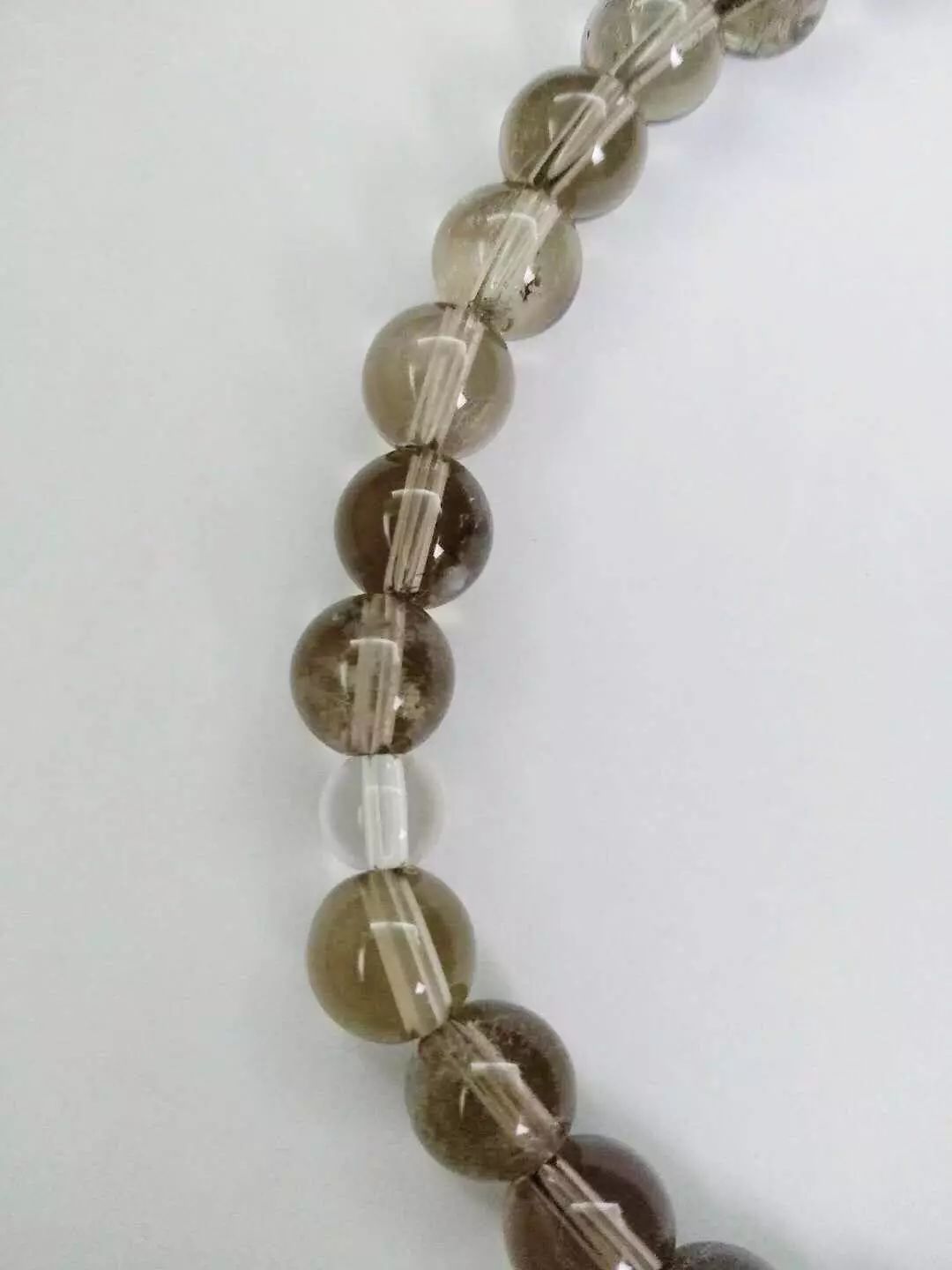 尺寸:茶晶主珠共35粒,直径:0.81厘米;三通白水晶,直径:1.0厘米;二粒小白水晶隔珠,四粒茶晶小尾珠。
