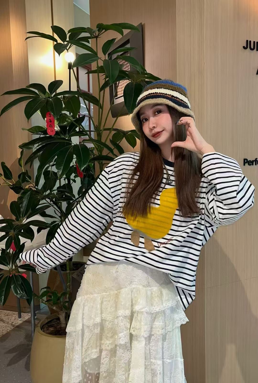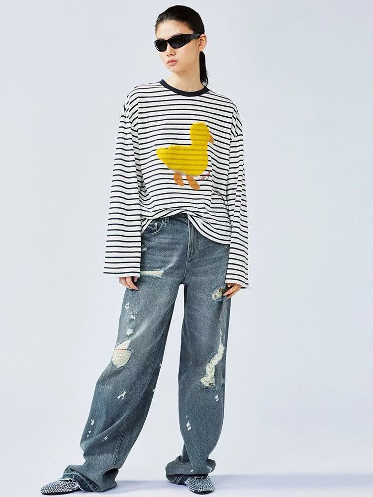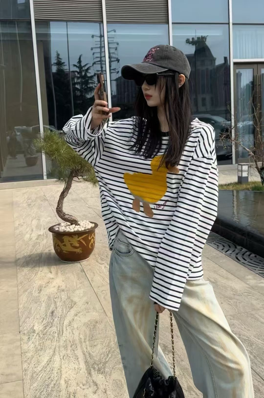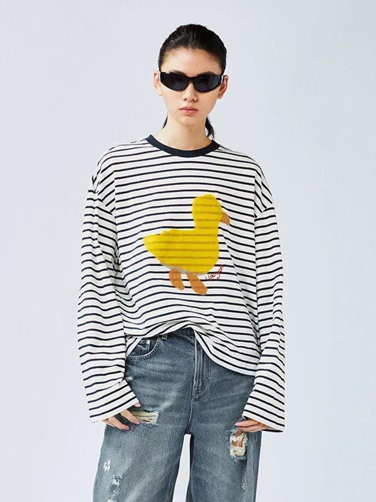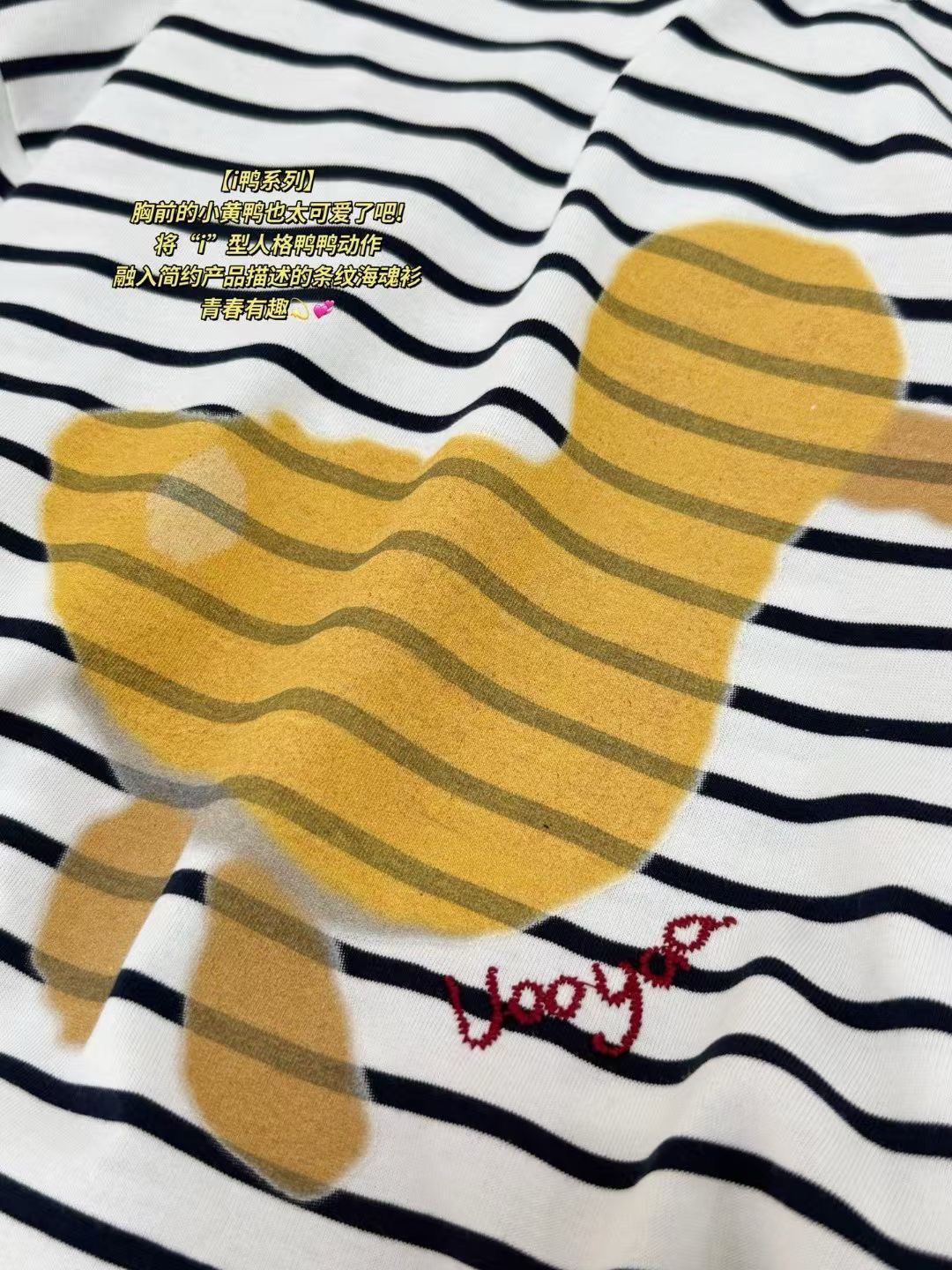 乌丫 25春季新款 可爱小黄鸭印花海魂条纹T恤