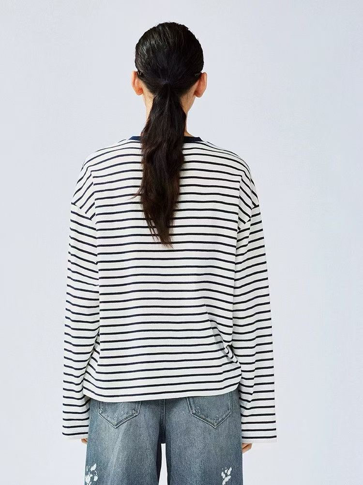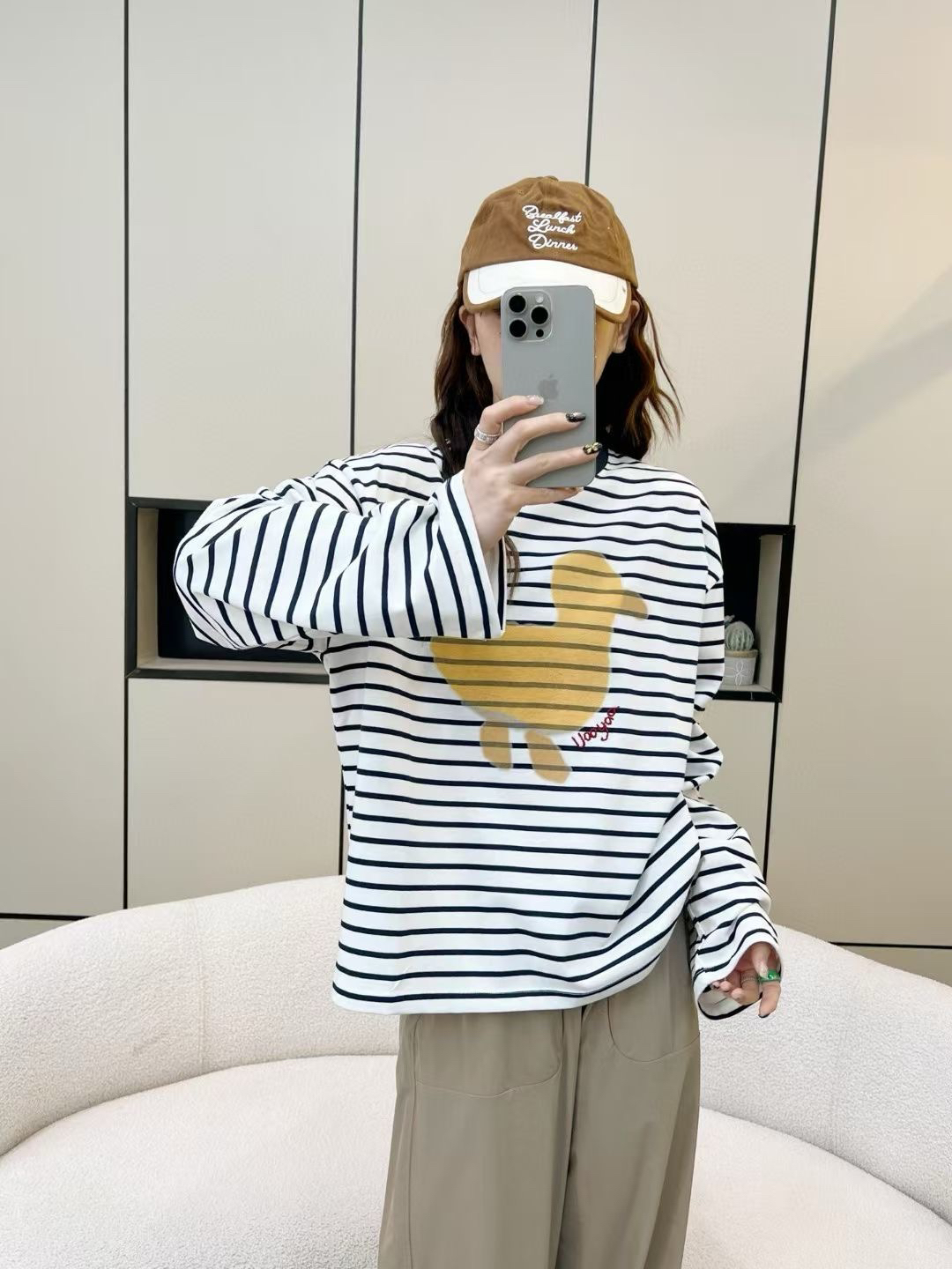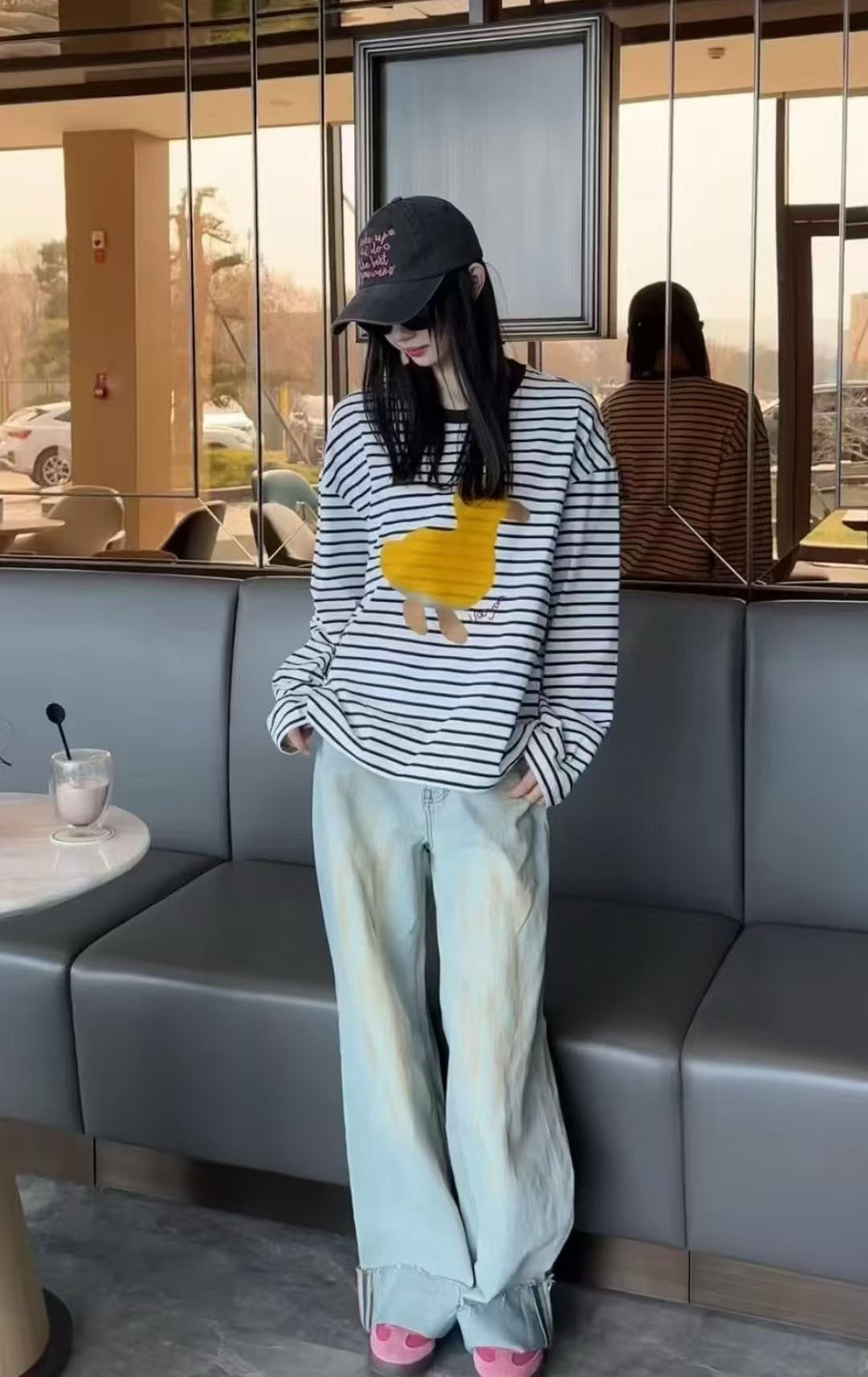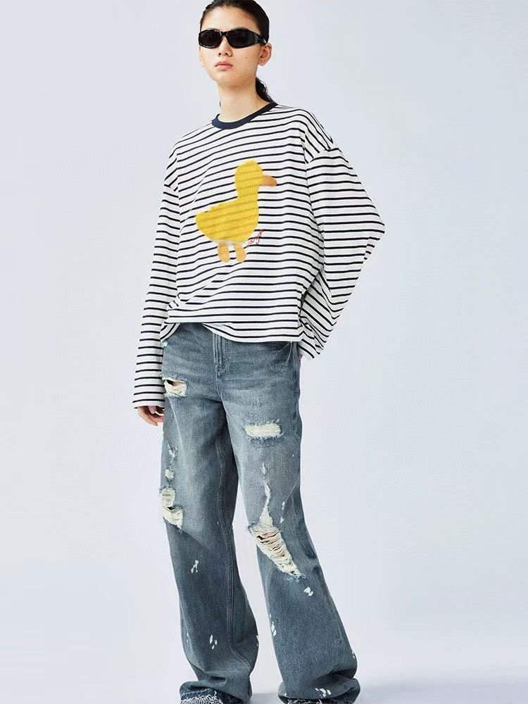 乌丫 25春季新款 可爱小黄鸭印花海魂条纹T恤