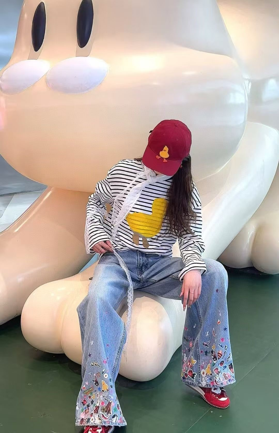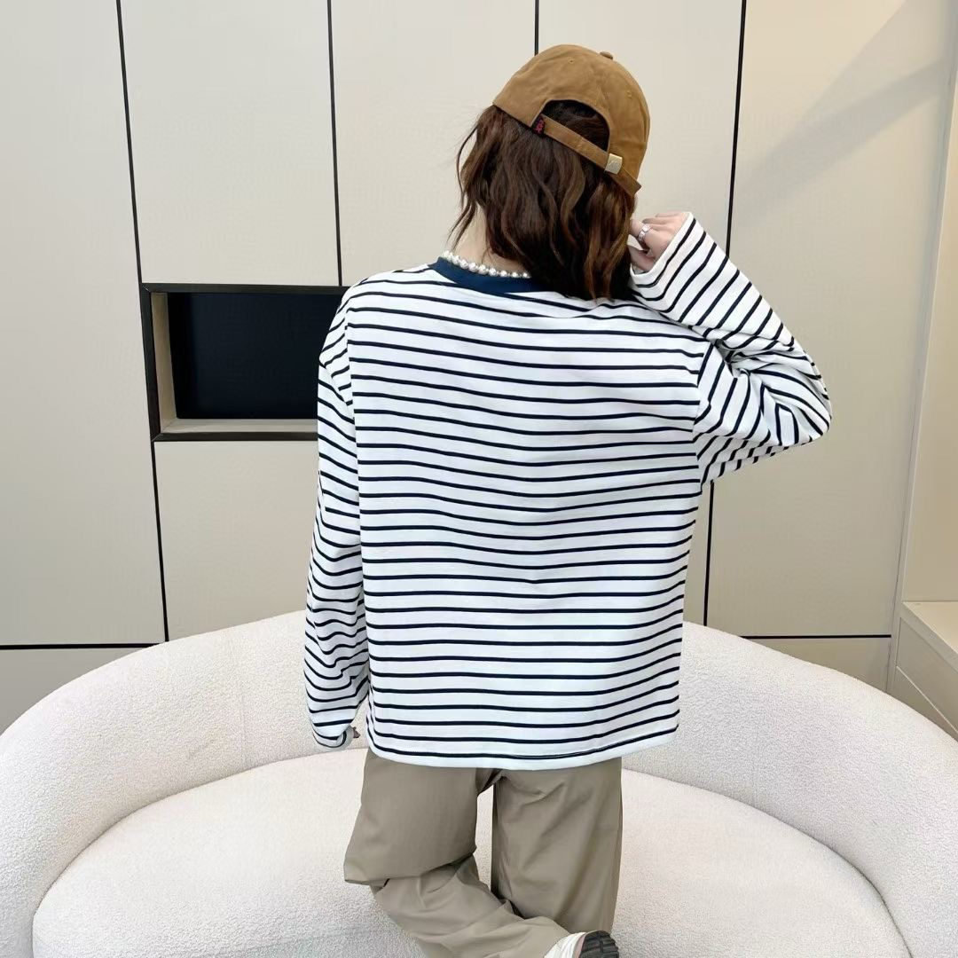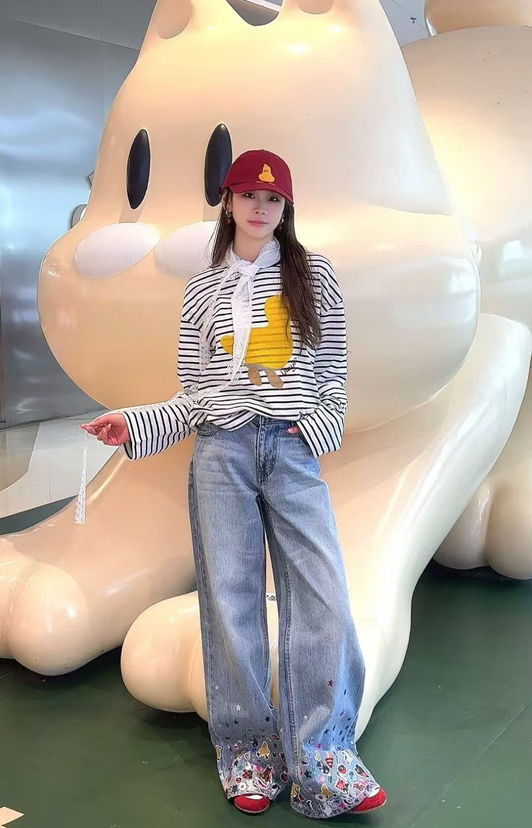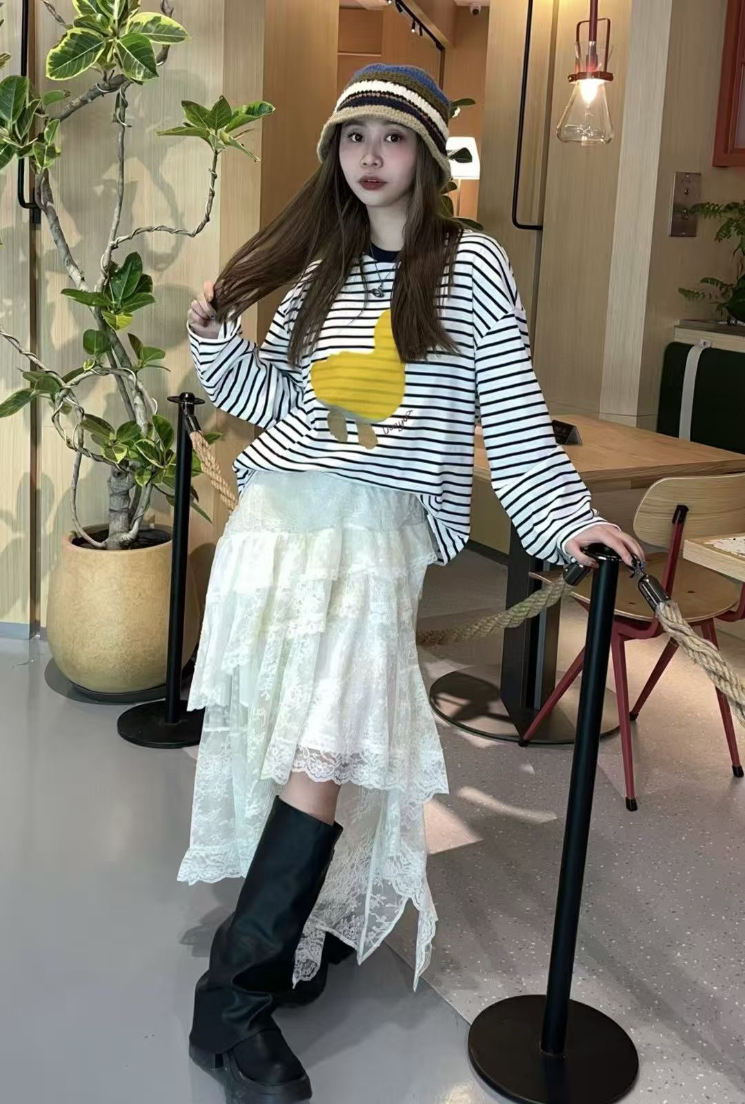 乌丫 25春季新款 可爱小黄鸭印花海魂条纹T恤