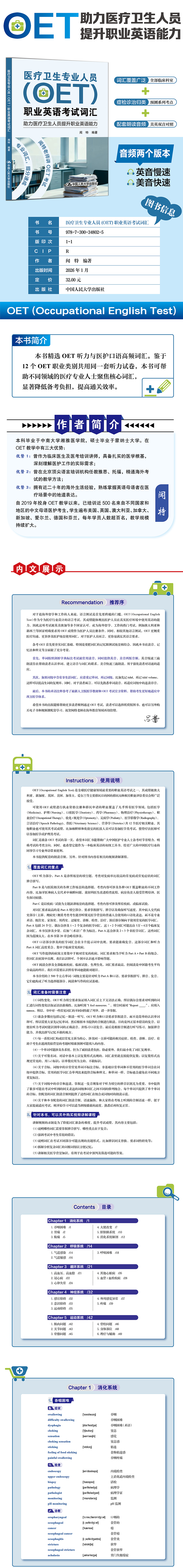 医疗卫生专业人员(OET)职业英语考试词汇 作者:闻特 书号:348025 定价:¥32 元 字数:115 千字 印次:1-1 开本:正32 出版时间:2026-01-20 ISBN:978-7-300-34802-5 包装:平