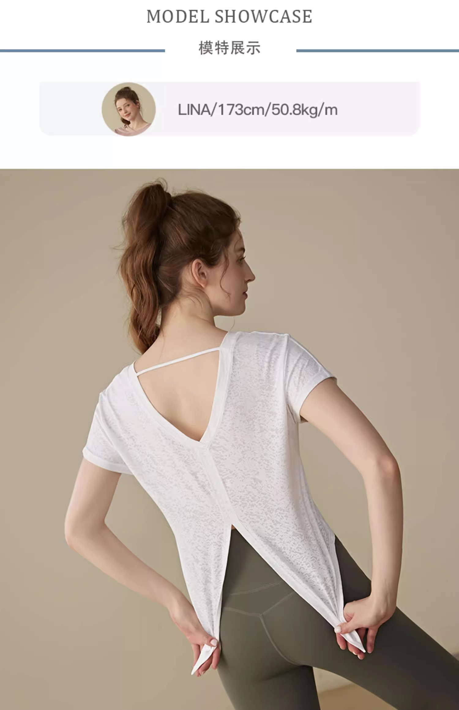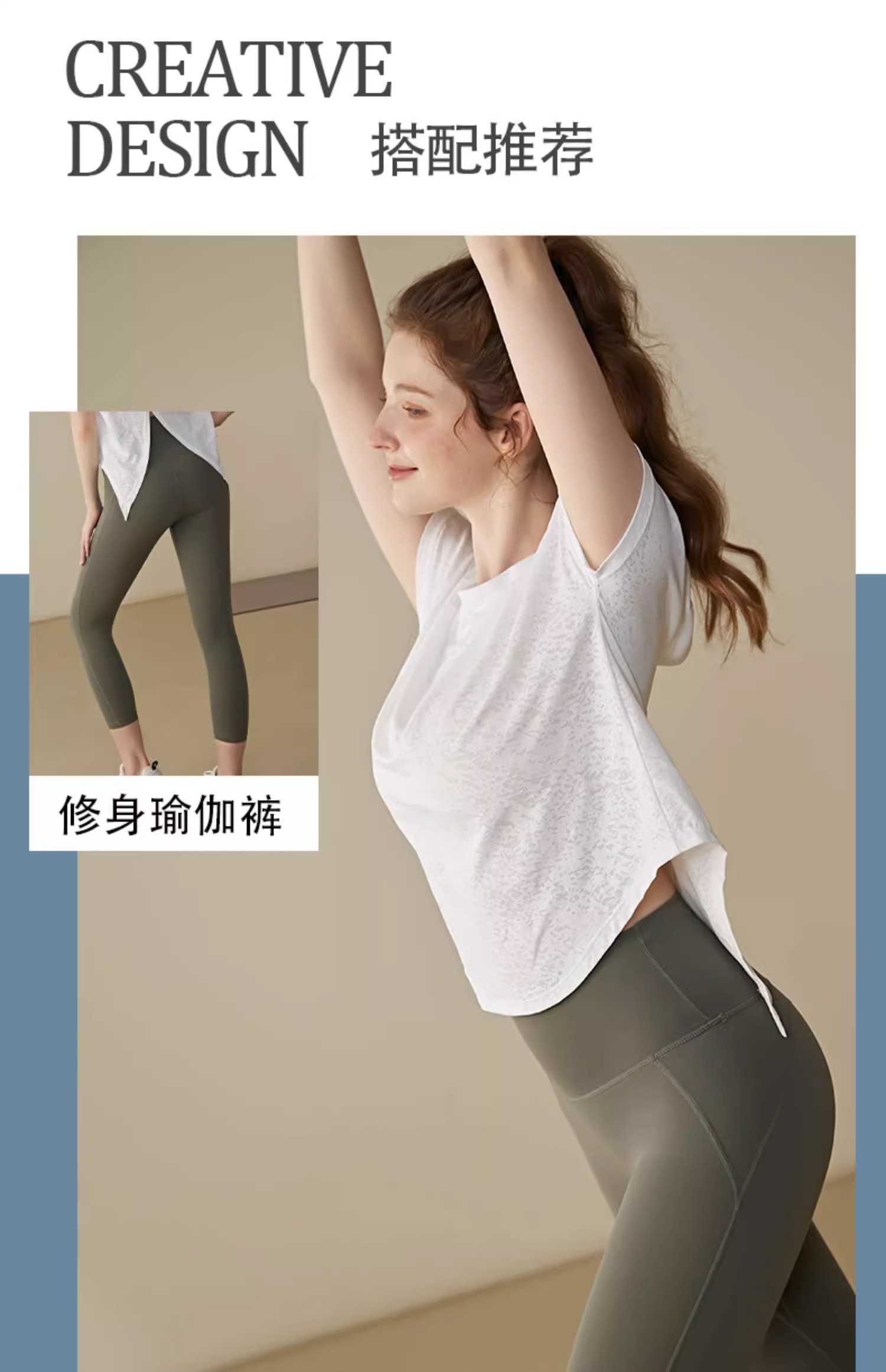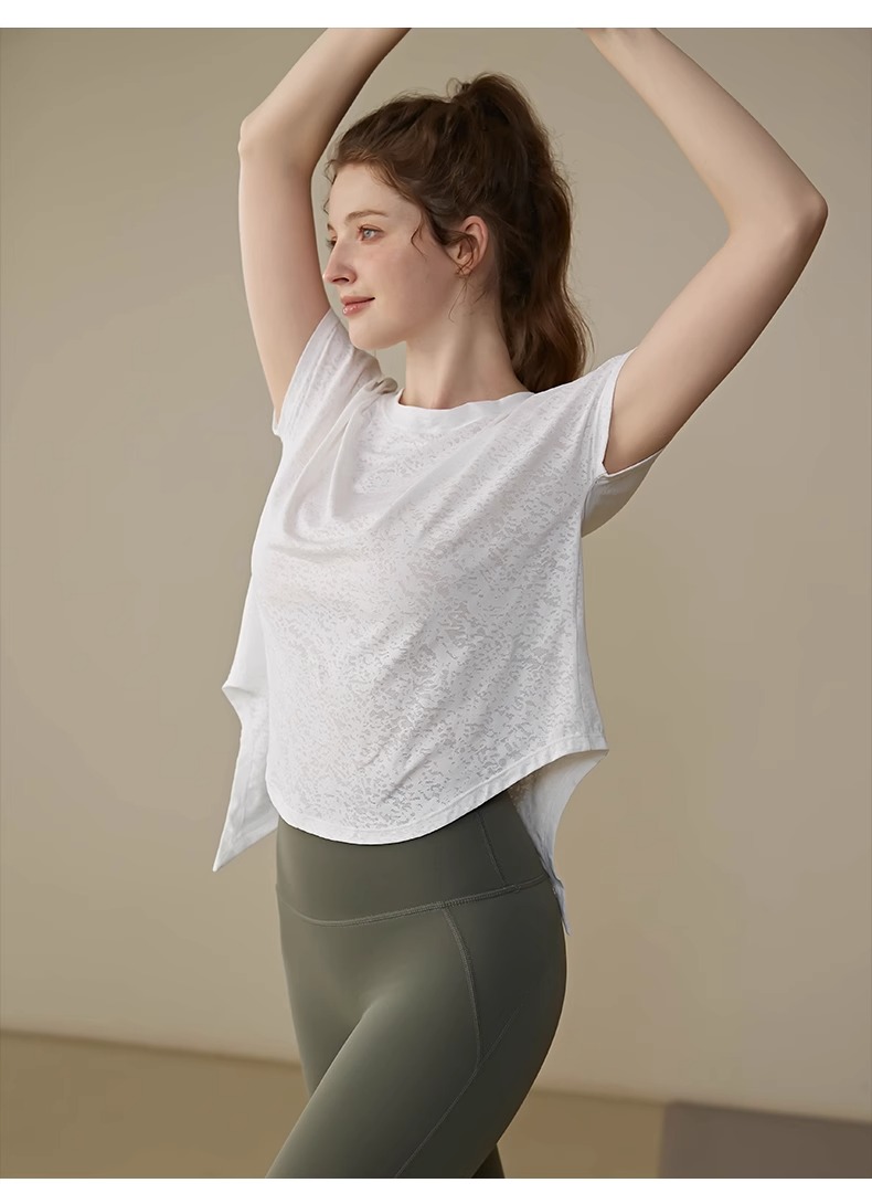 跃牌【美西西系列】普拉提训练服夏轻薄运动健身服提花开衩罩衫女短袖DX-233