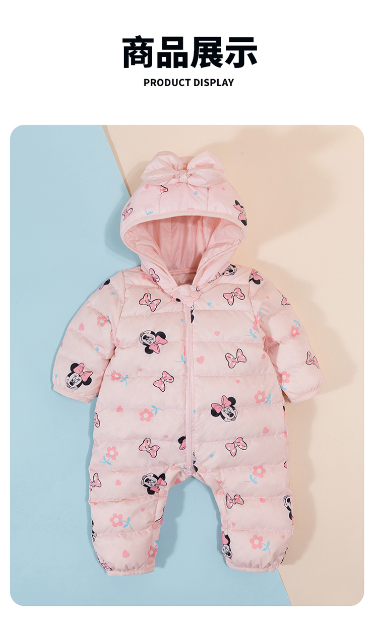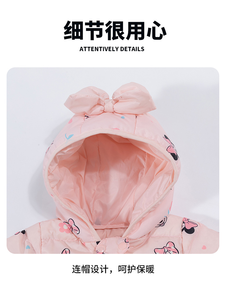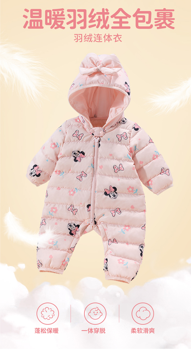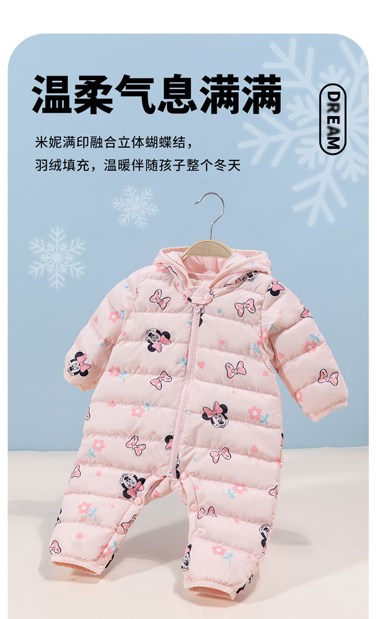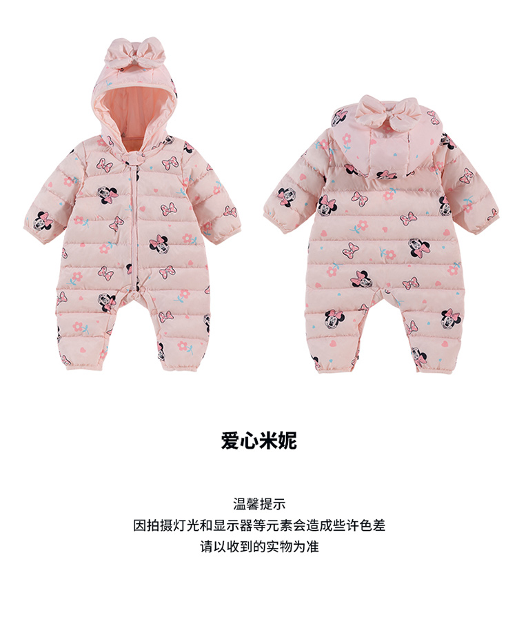 迪士尼童装秋冬款米妮满印连帽羽绒连体衣宝宝保暖舒适冬装羽绒服234L955