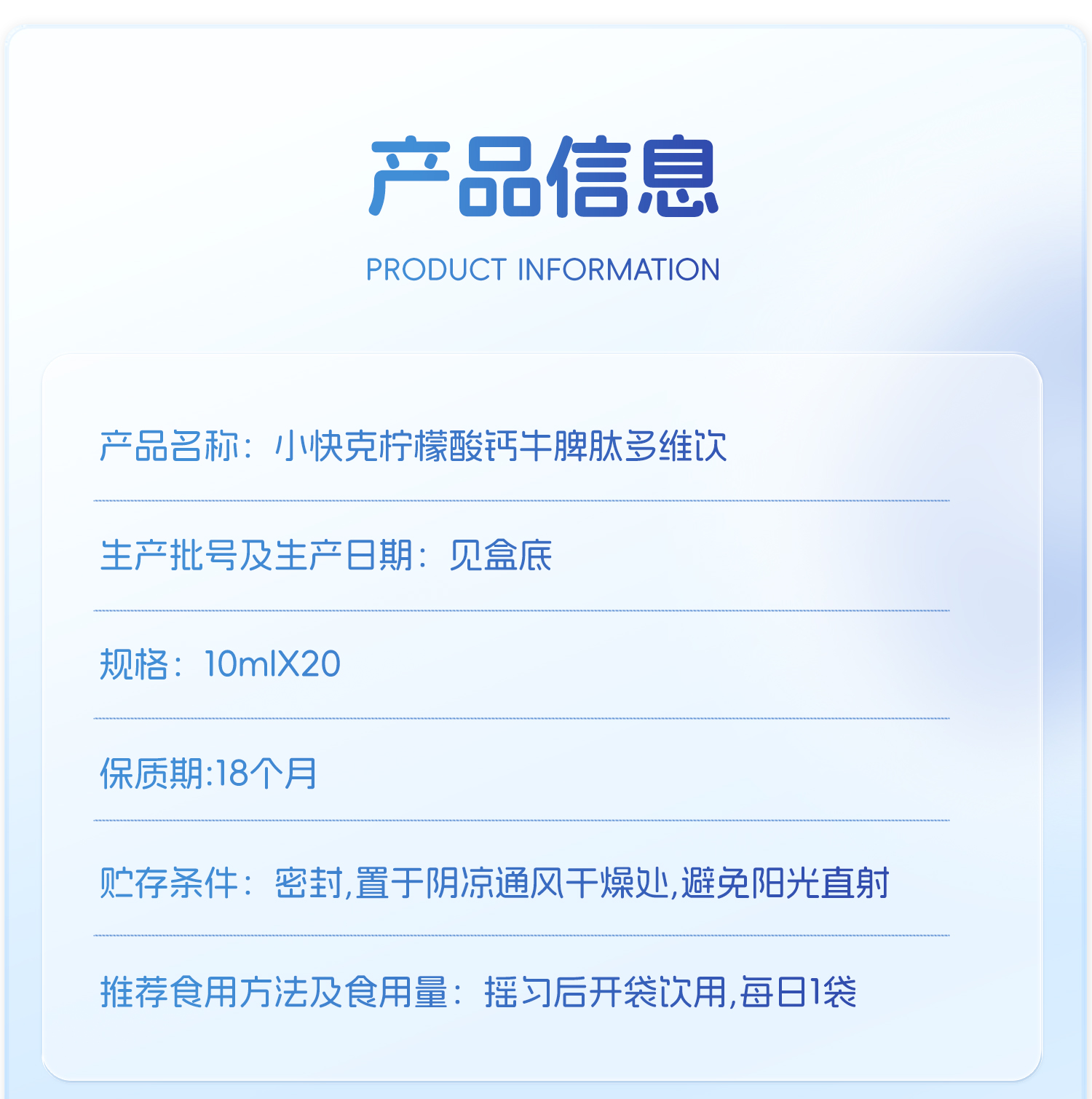 【品名】“国货之光”小快克 柠檬酸钙牛脾肽多维饮 补充多种营养 20条/盒 【规格】10ml/条*20条/盒 【产地】国内 【保质期】18个月 【发货包装】独立包装 【发货地】绍兴 【发货快递】圆通 【补邮费地区】新疆、西藏+10元 内蒙古+3元 【发货时效】48-72小时,周末节假日顺延 |
