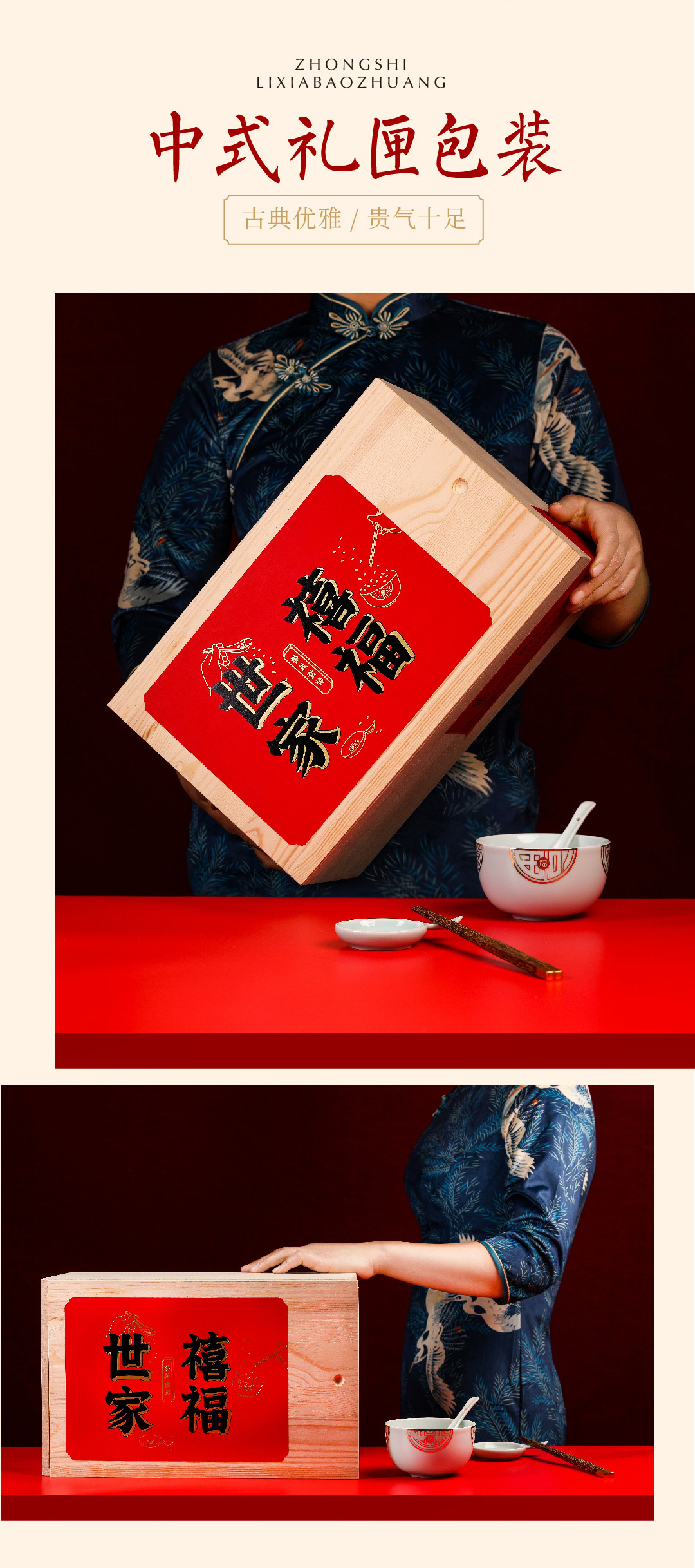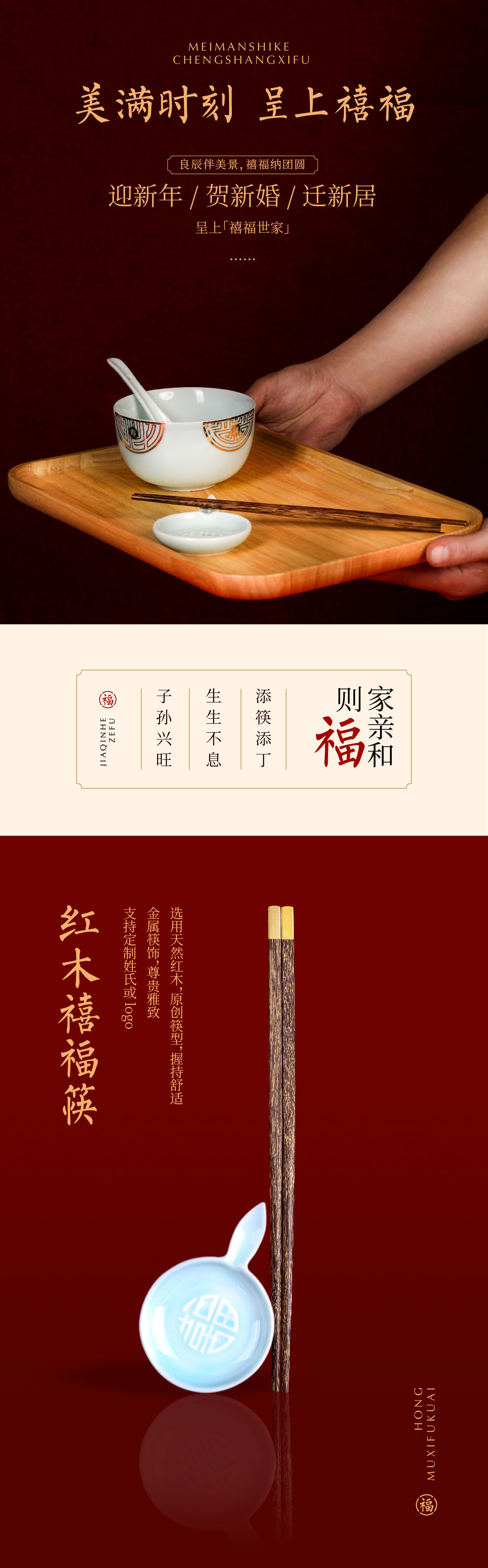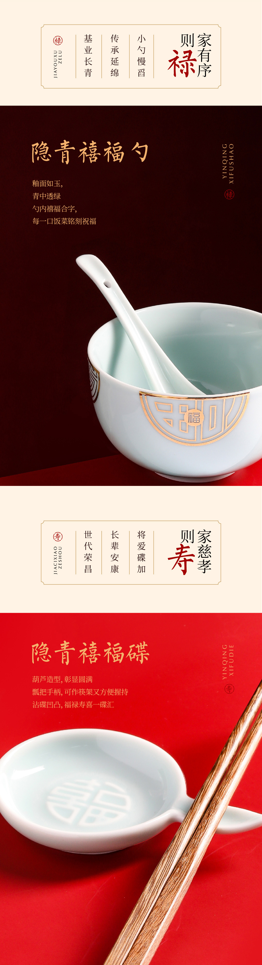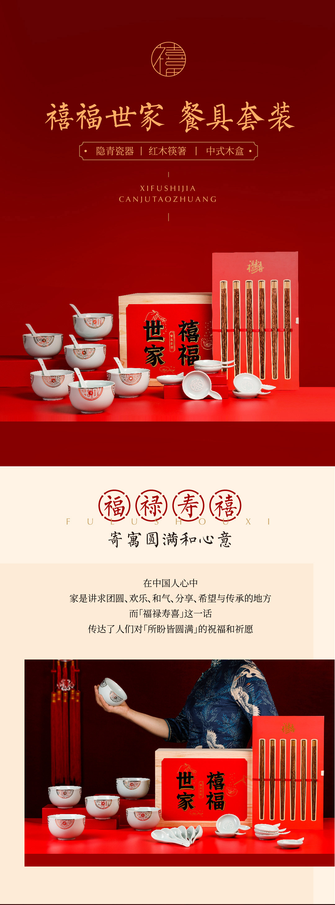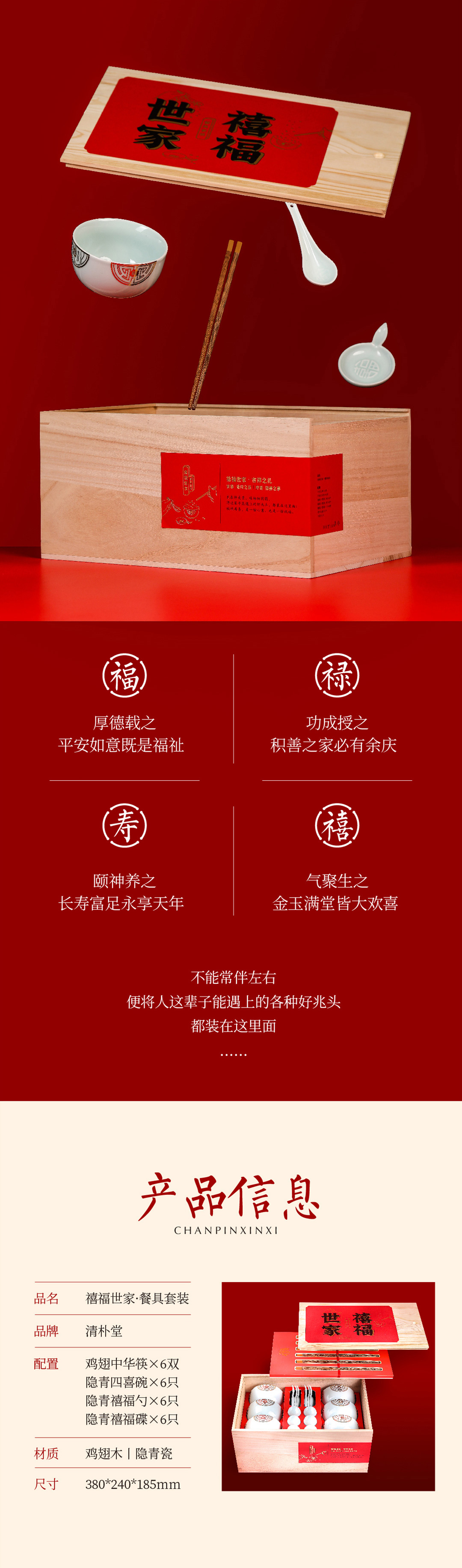 清朴堂 禧福世家餐具套装 鸡翅木筷6双+隐青碗6只+勺6只+碟6只