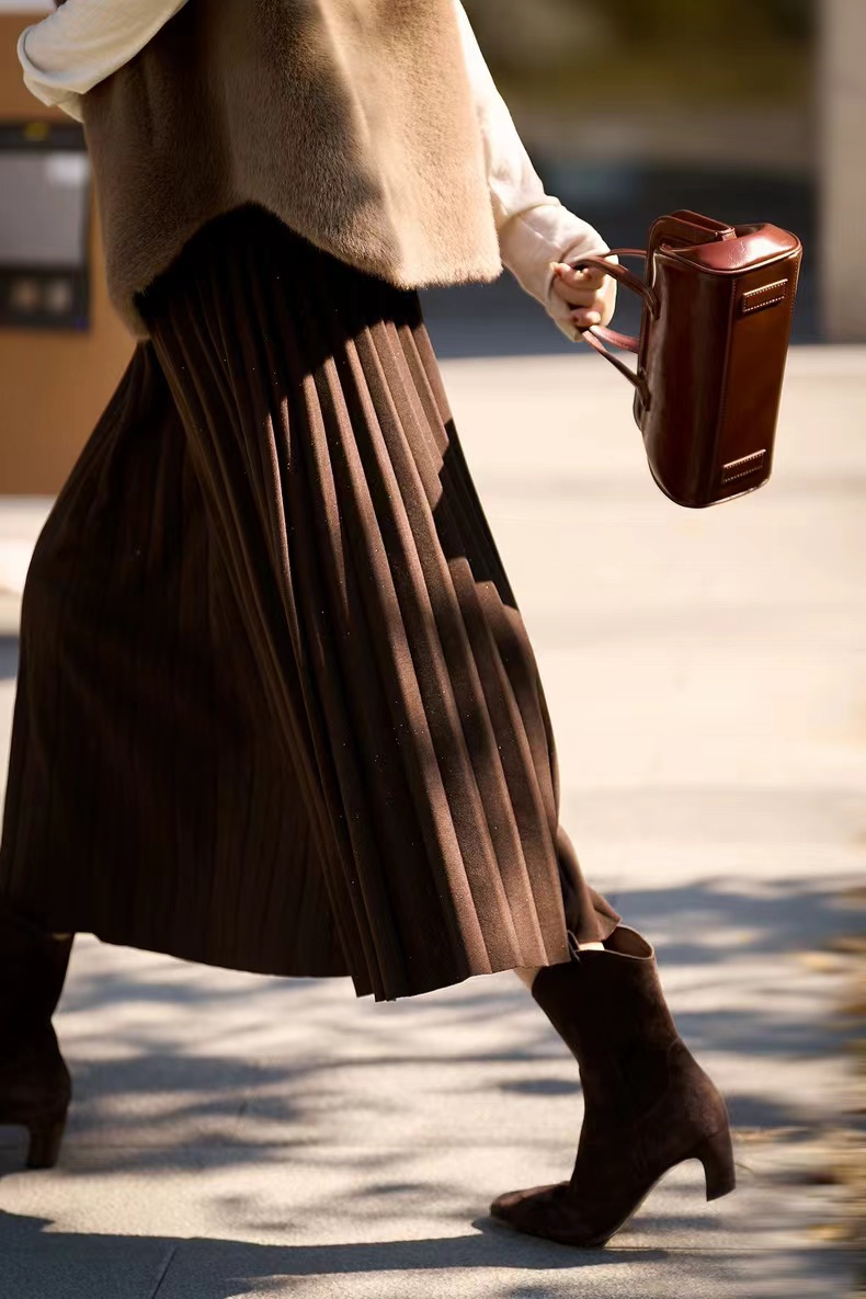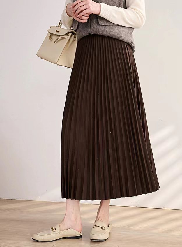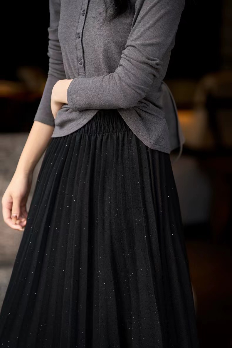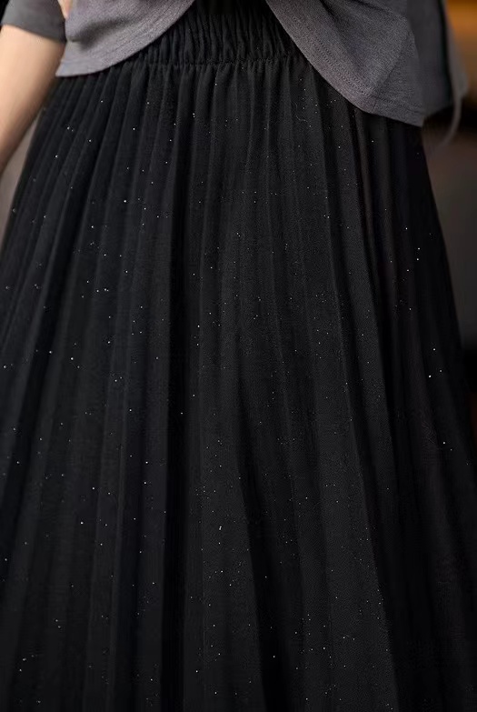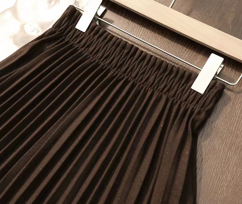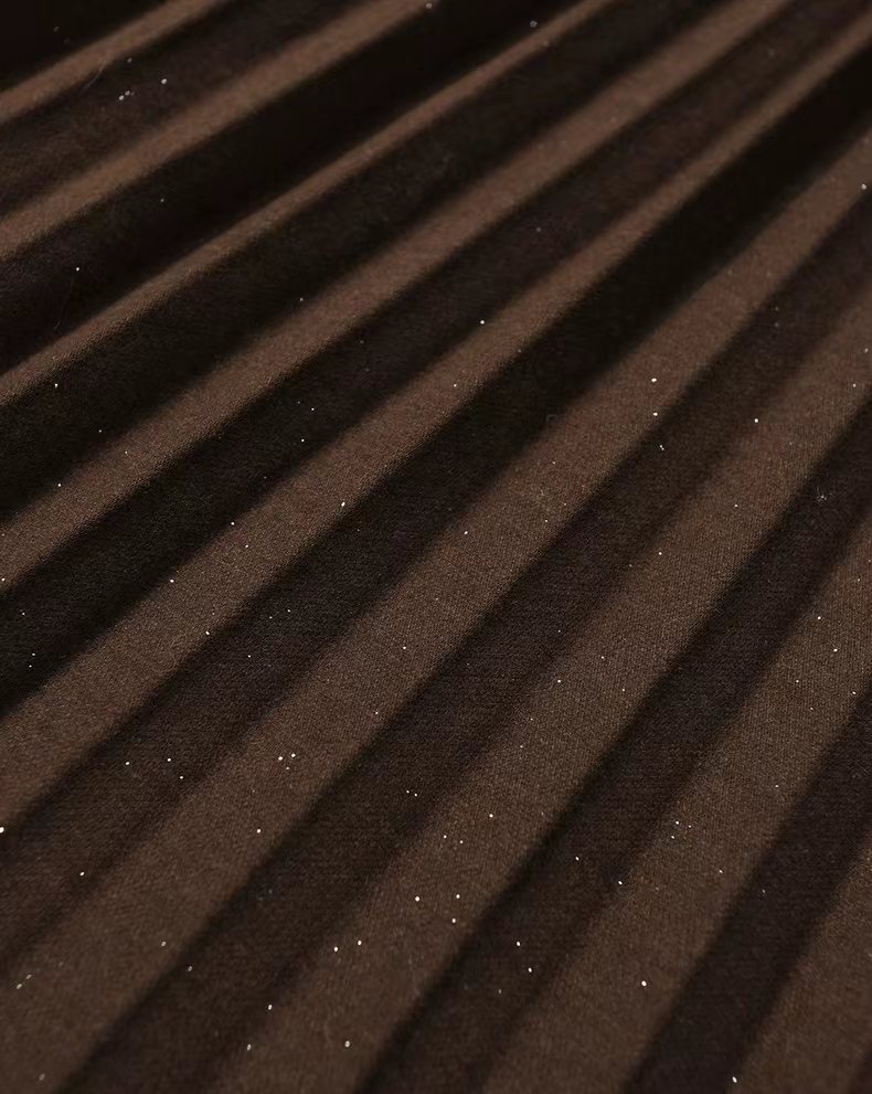 冬季星闪亮片羊毛百褶裙大摆A字半身裙,25FW"星闪"羊毛百褶裙,别具风情的浪漫腔调!大裙摆重工压褶 ,自然散开呈A型裙摆,用料充足,自带垂感,修饰包容多种身材。线条垂顺,视觉不会有膨胀感修饰视觉比例,拉出了大长腿的心机效果!高弹力宽幅松紧腰,确保舒适、轻松穿脱的同时于视觉上精准勾勒出纤细腰线,重塑身材比例!A字大摆不显胯宽,轻松掩盖腿部小缺点,行走间浪漫飘逸,尽显女性柔美!搭配针织or各类大衣外套,打造摩登女性形象,行走间散发行云流水般的气场与优雅~甄选高克重的多纱线混纺细闪针织面料,若隐若现的鎏金工艺,璀璨银粉,通过喷洒工艺附着在面料上折射出层次丰富的鎏金光泽,于低调中彰显品味,仿效三宅手工压皱,由经验丰富的匠人逐寸手工定位、高温高压定型。加入甄选羊毛,适合秋冬季穿带来温暖呵护,柔软透气柔顺挺括,舒适保暖!
