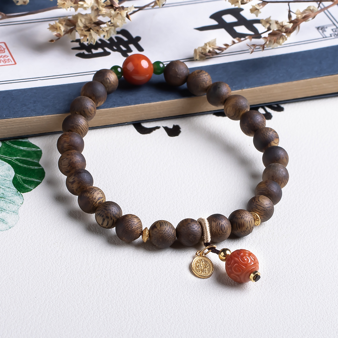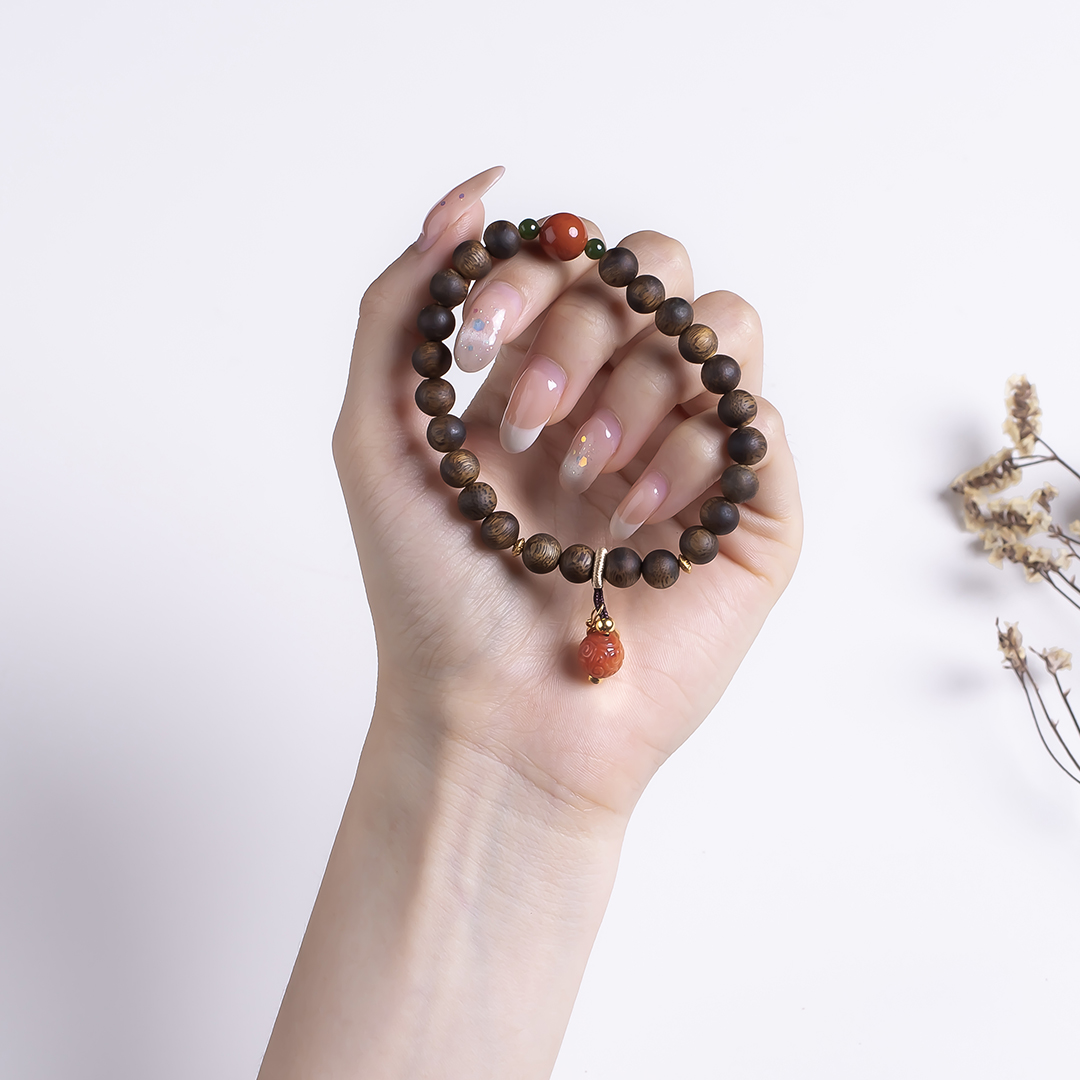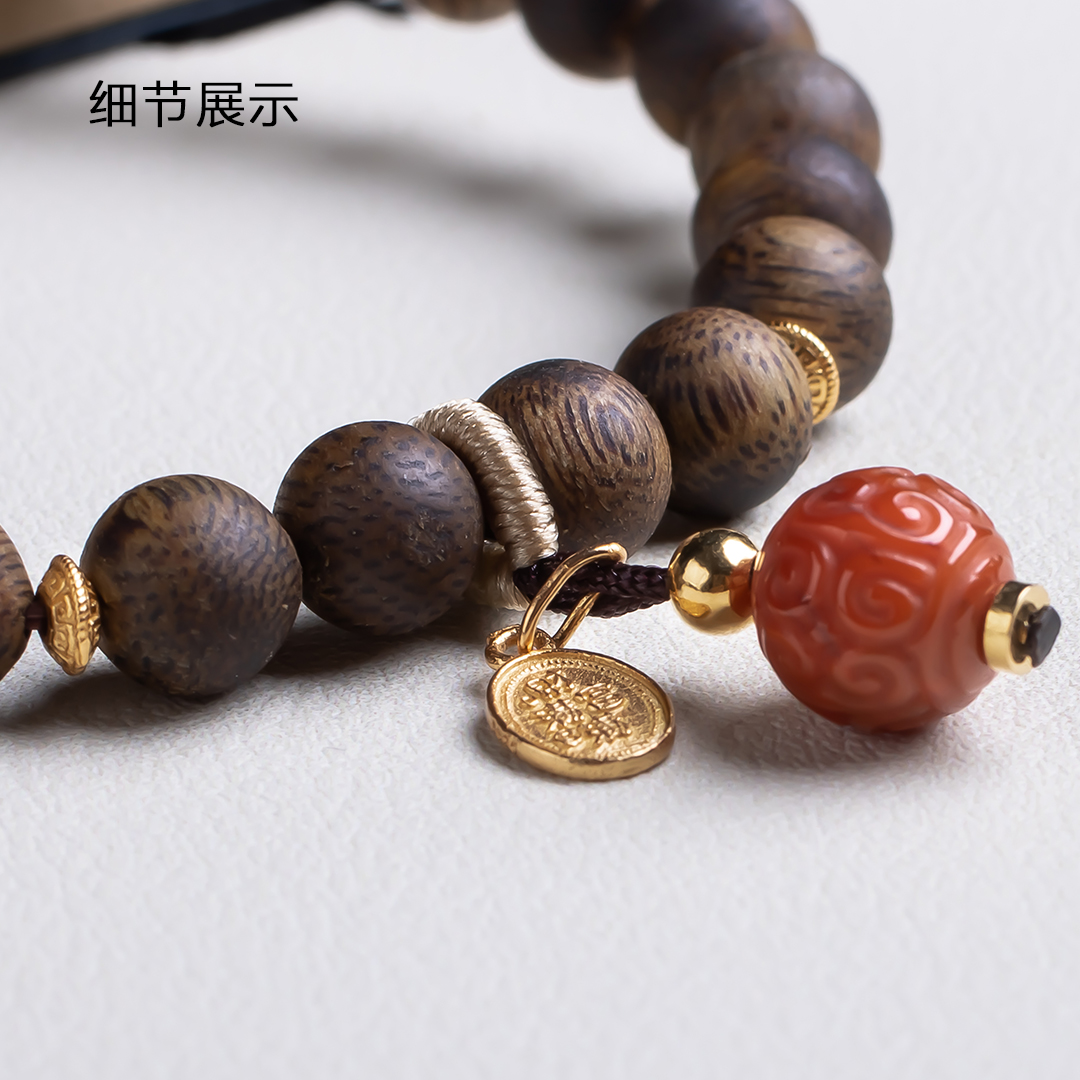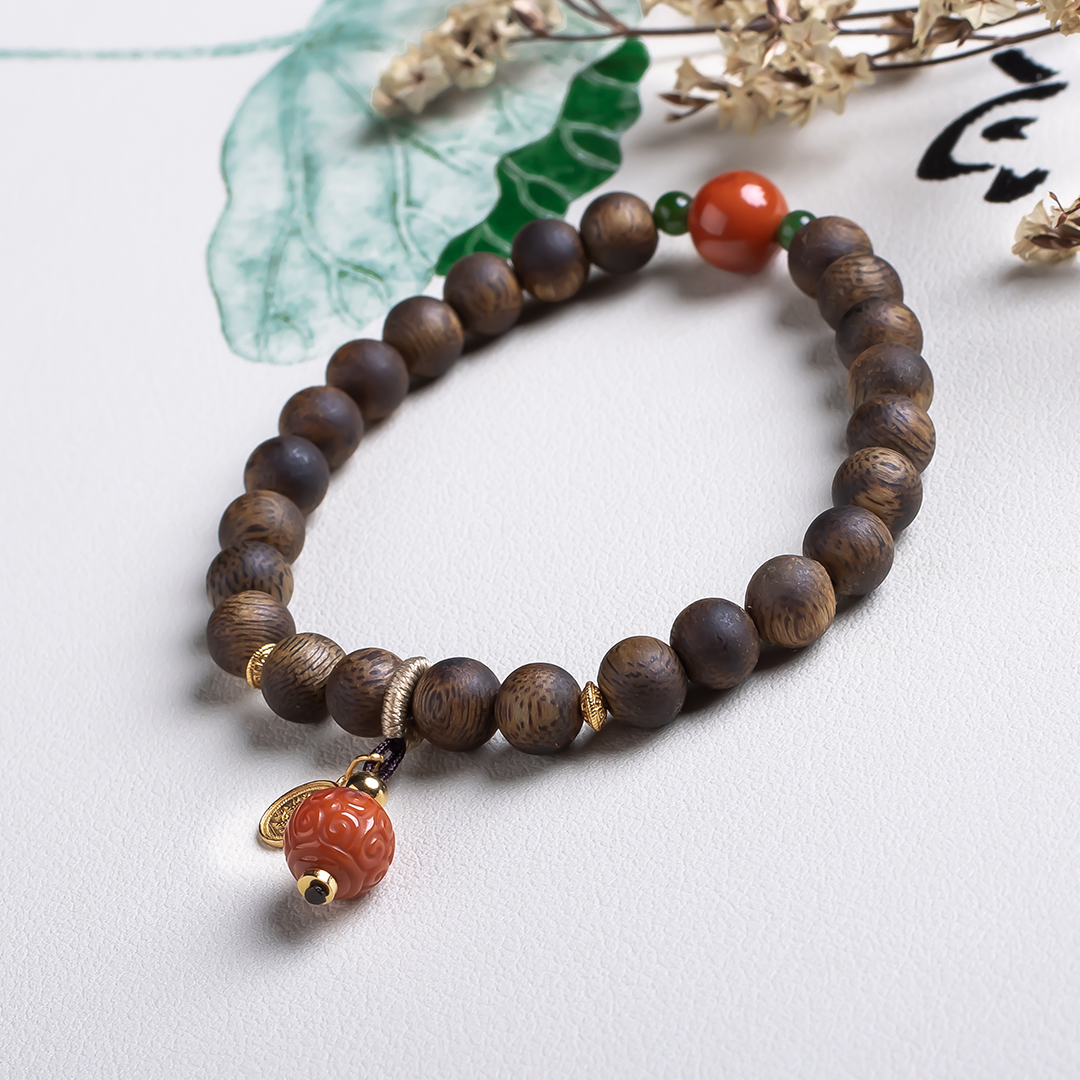 xy0532沉香+南红回纹珠提溜手串.银,天然沉香约7.5mm,原色原味,香味自然清甜,满色肉的南红玉质细腻,色泽红润,回纹珠意为幸福连绵不断头,再搭一枚平安多财提溜注坠,款式古风、典雅,吉祥、纳福、多财。