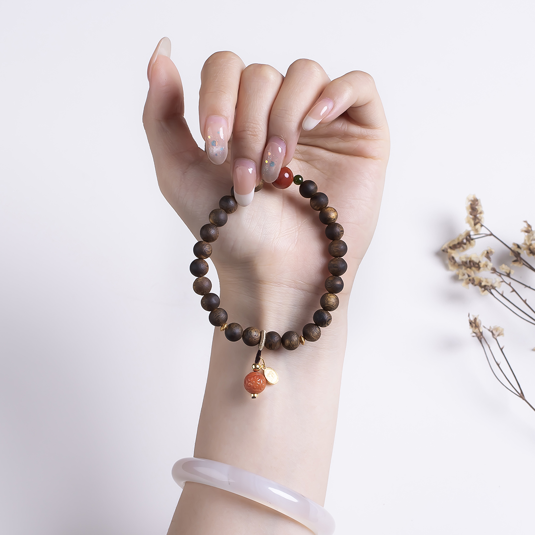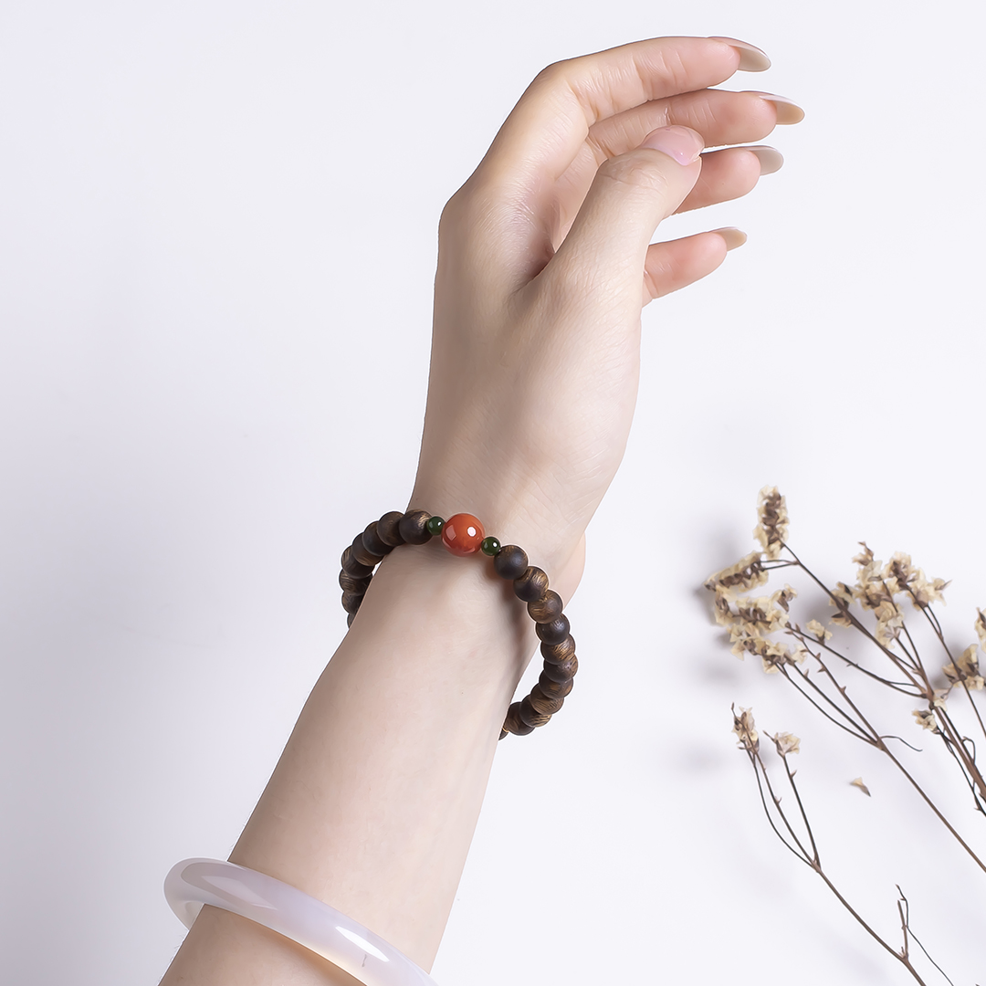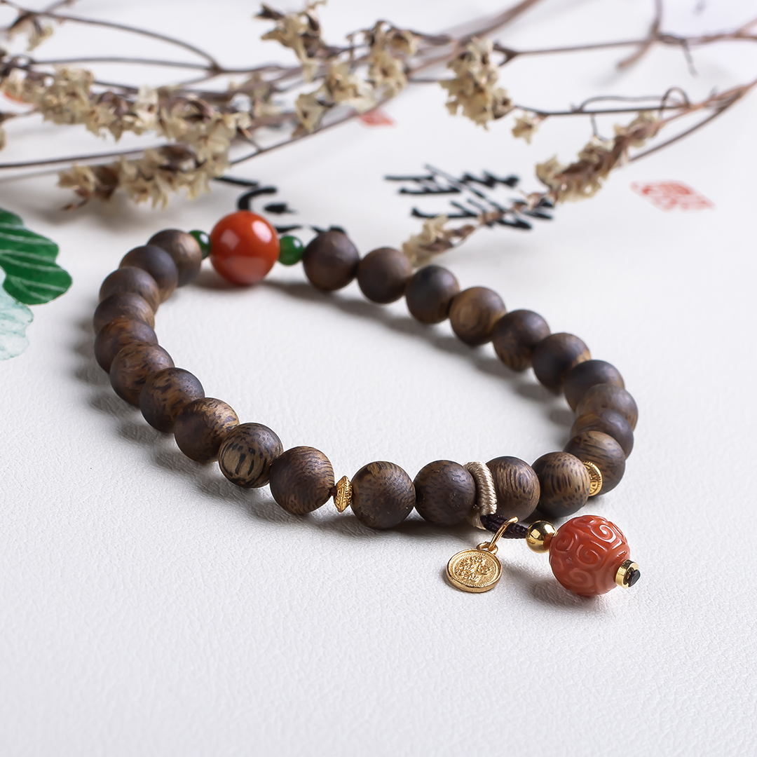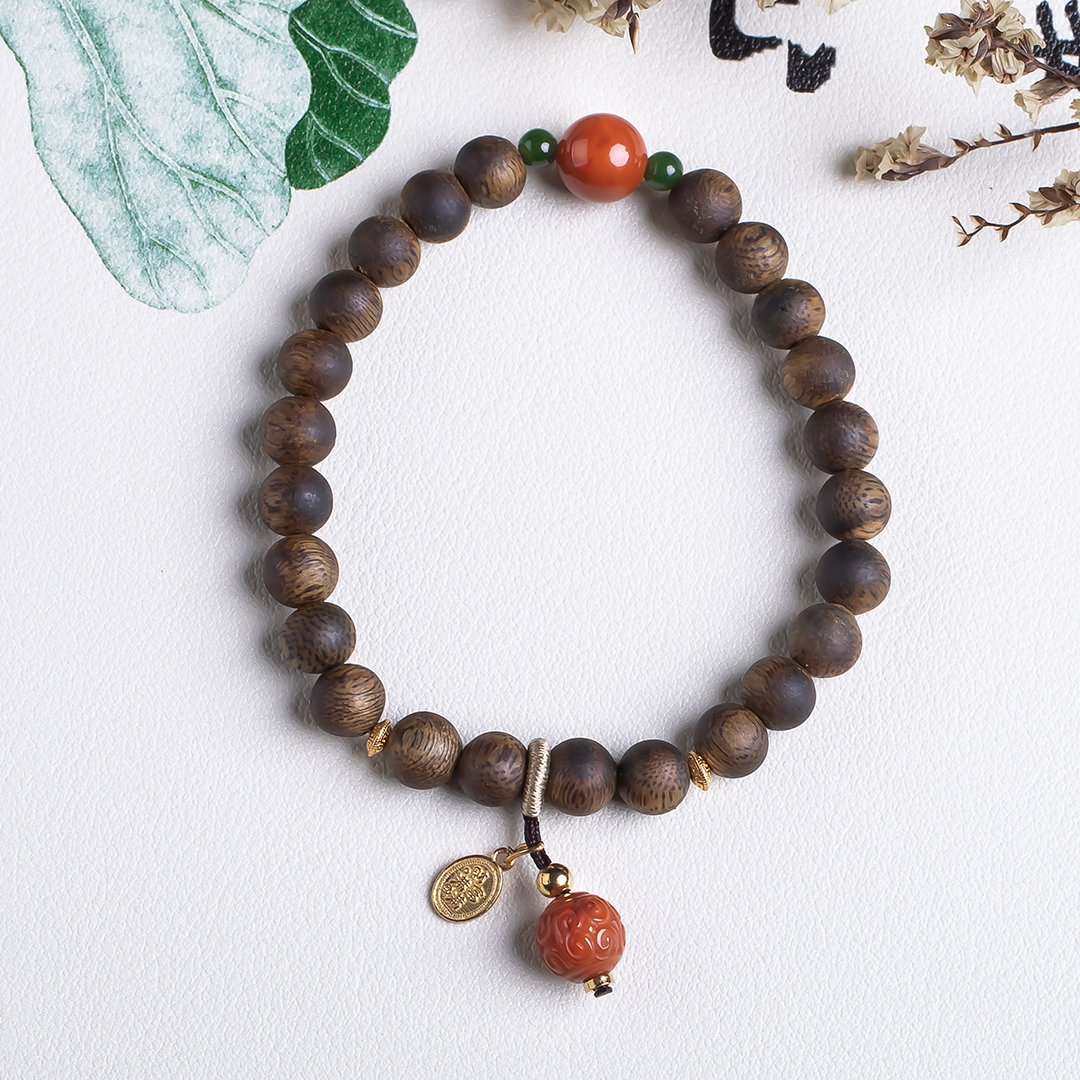 xy0532沉香+南红回纹珠提溜手串.银,天然沉香约7.5mm,原色原味,香味自然清甜,满色肉的南红玉质细腻,色泽红润,回纹珠意为幸福连绵不断头,再搭一枚平安多财提溜注坠,款式古风、典雅,吉祥、纳福、多财。