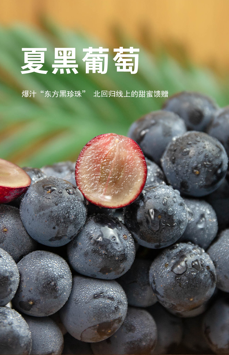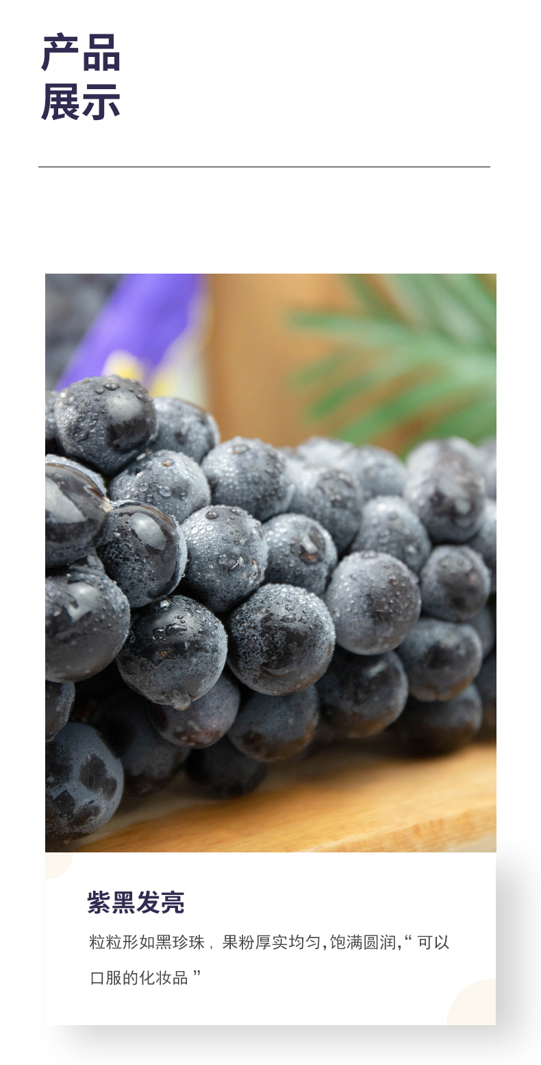 新鲜的云南夏黑葡萄,紫黑的果粒表面,会均匀覆着一层厚厚的白色果粉。